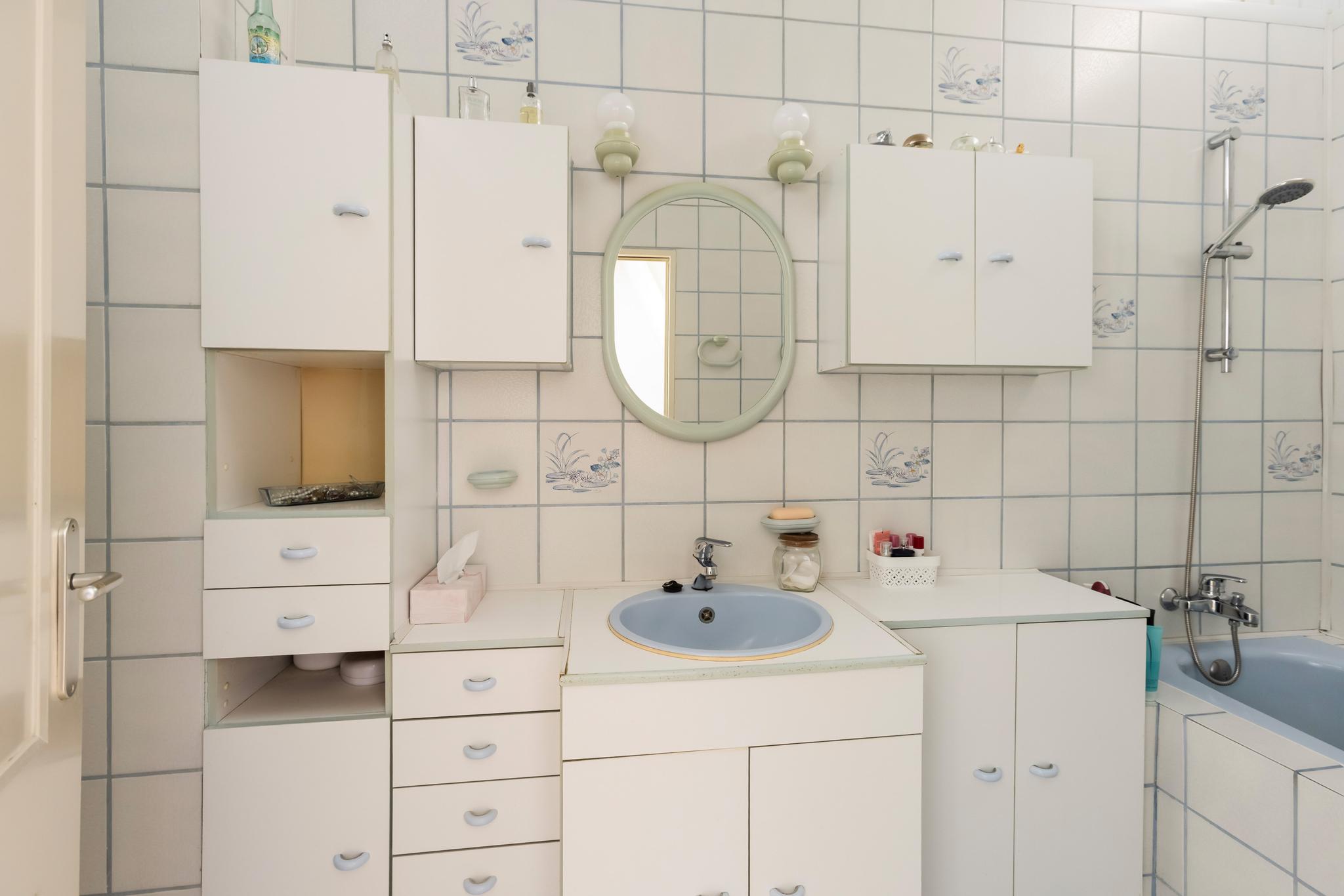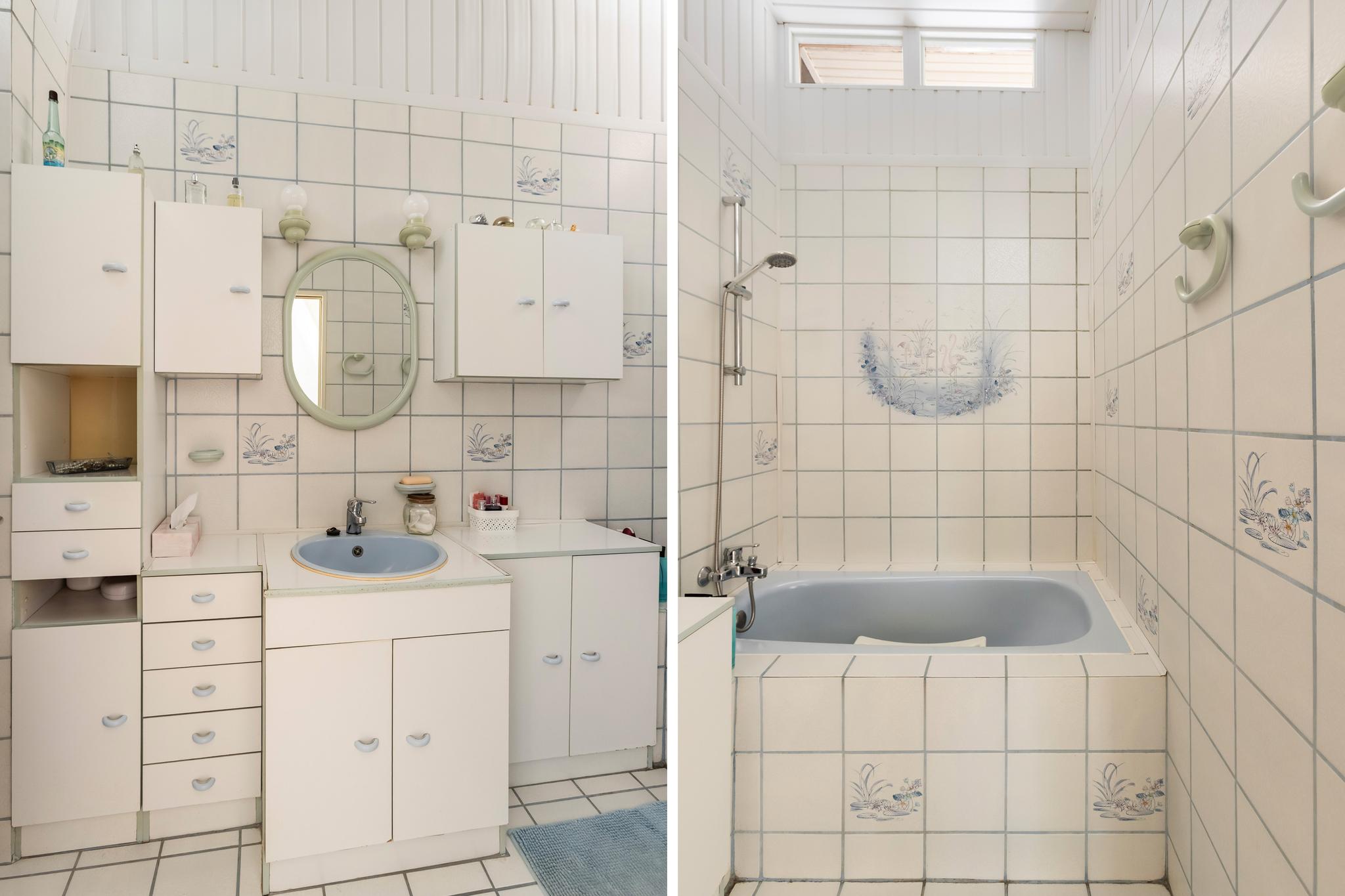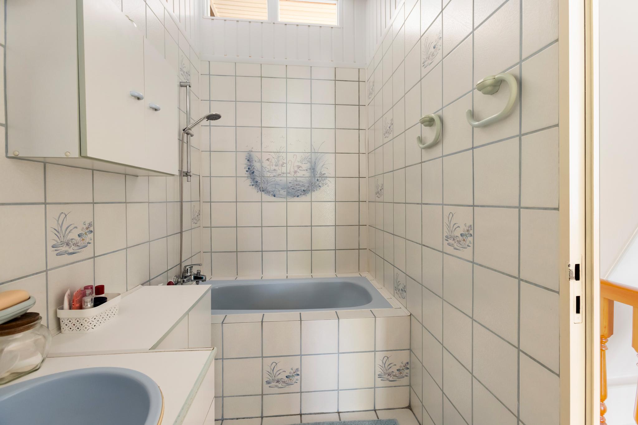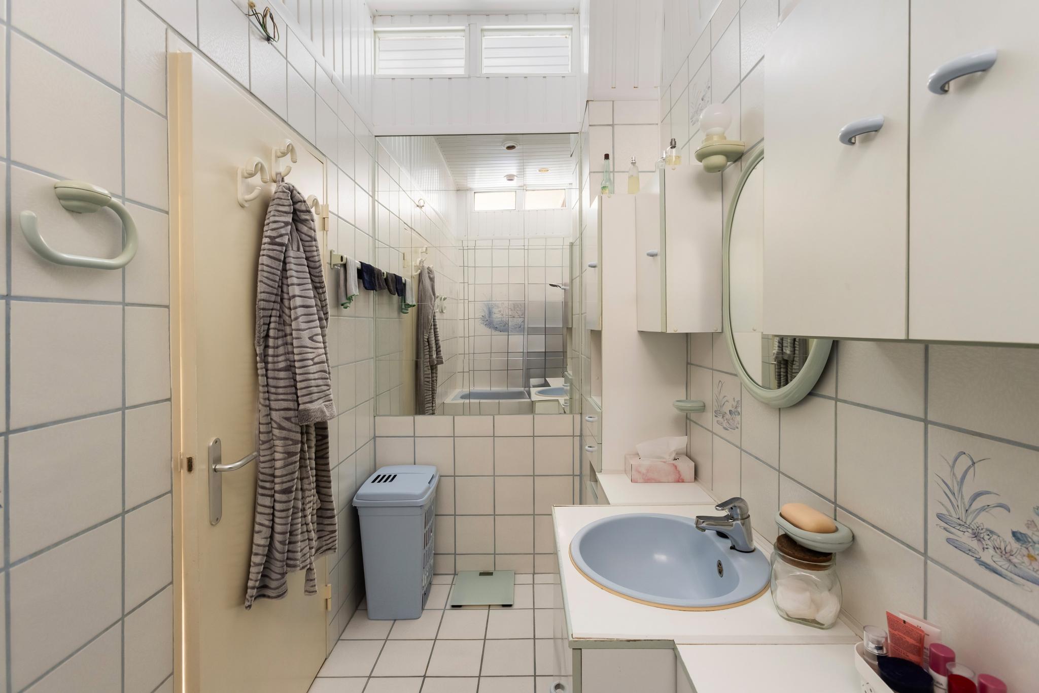 Inpandige badkamer met wastafel en meubel, bad en gedeeltelijk betegelde wanden.