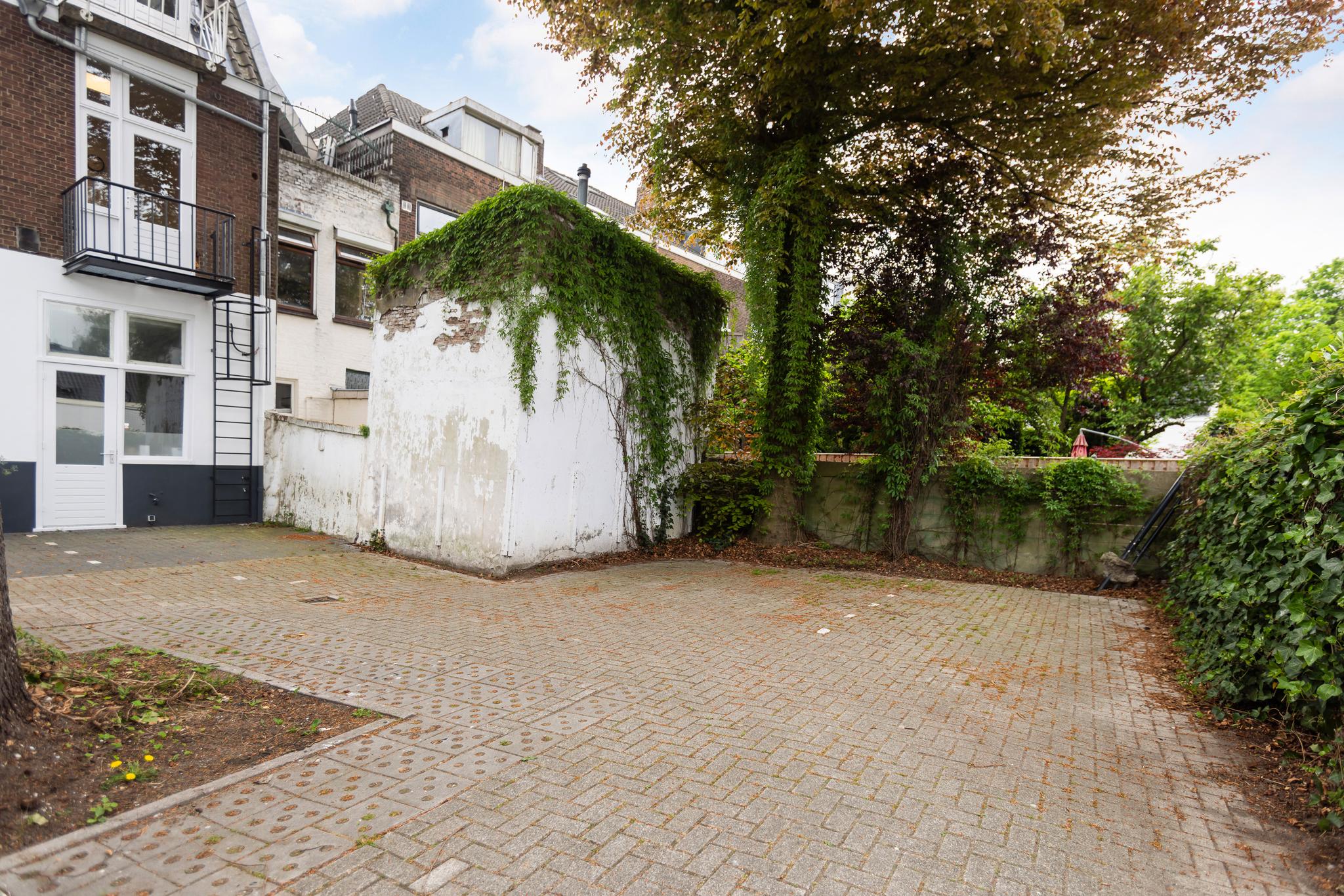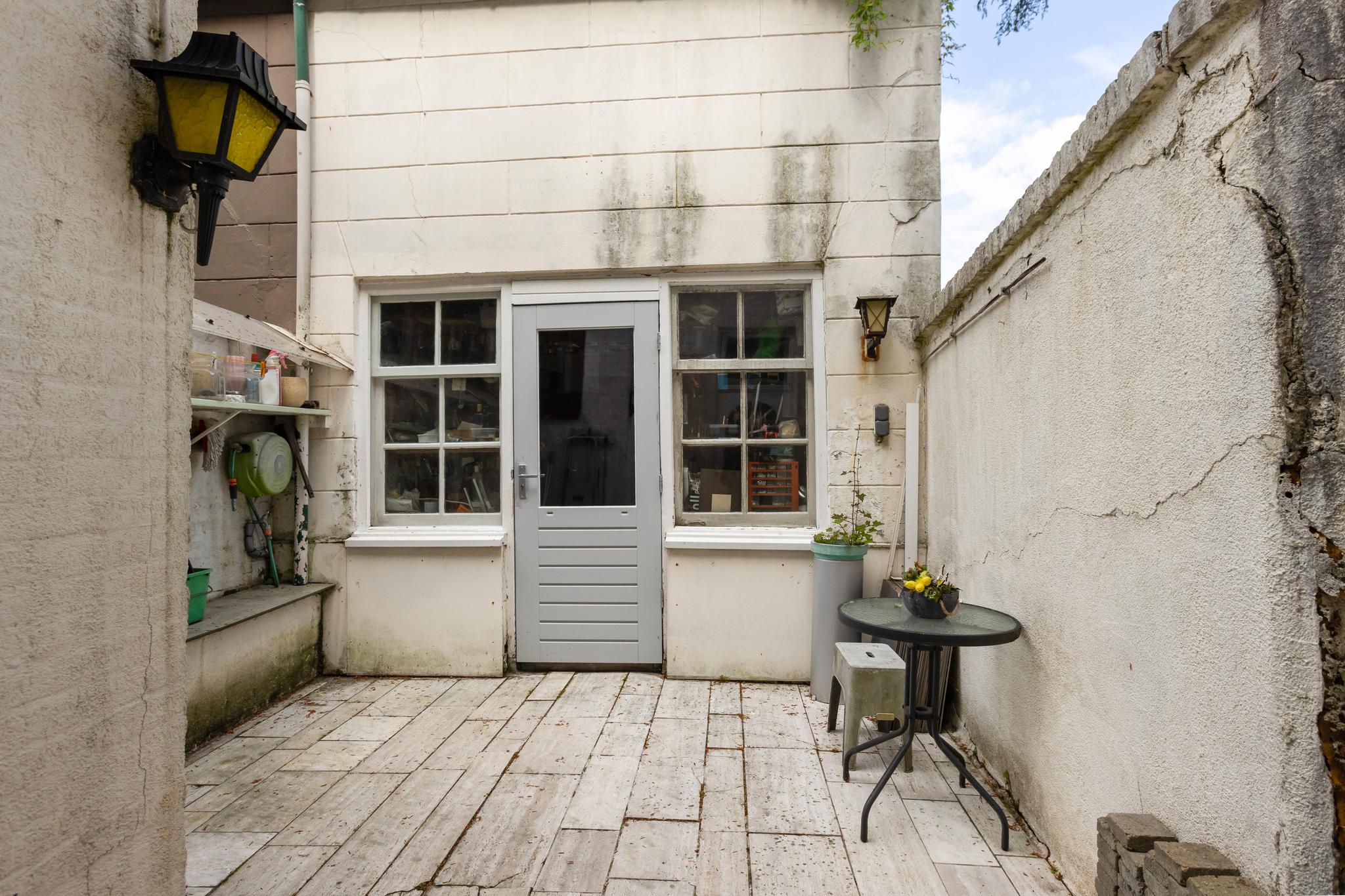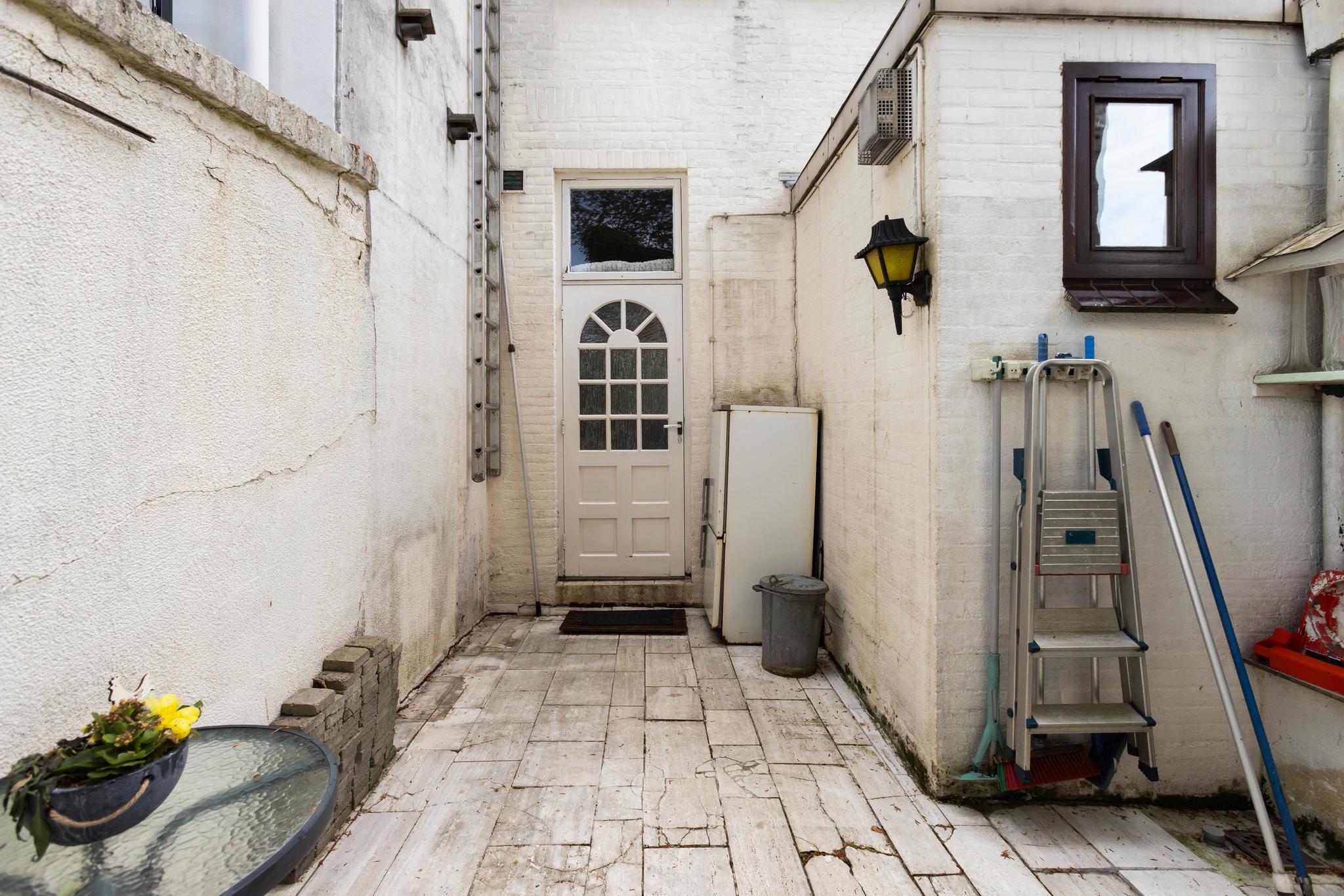 Binnenplaats met toegang tot de grote berging. In de berging is de CV ketel gesitueerd (Intergas, huur, ca. 30 euro per maand, 2024 geplaatst). De CV ketel is een combi ketel echter op dit moment wordt het warme water door een badgeiser aangemaakt. Er is ook een grote bergzolder aanwezig, geen achterom.