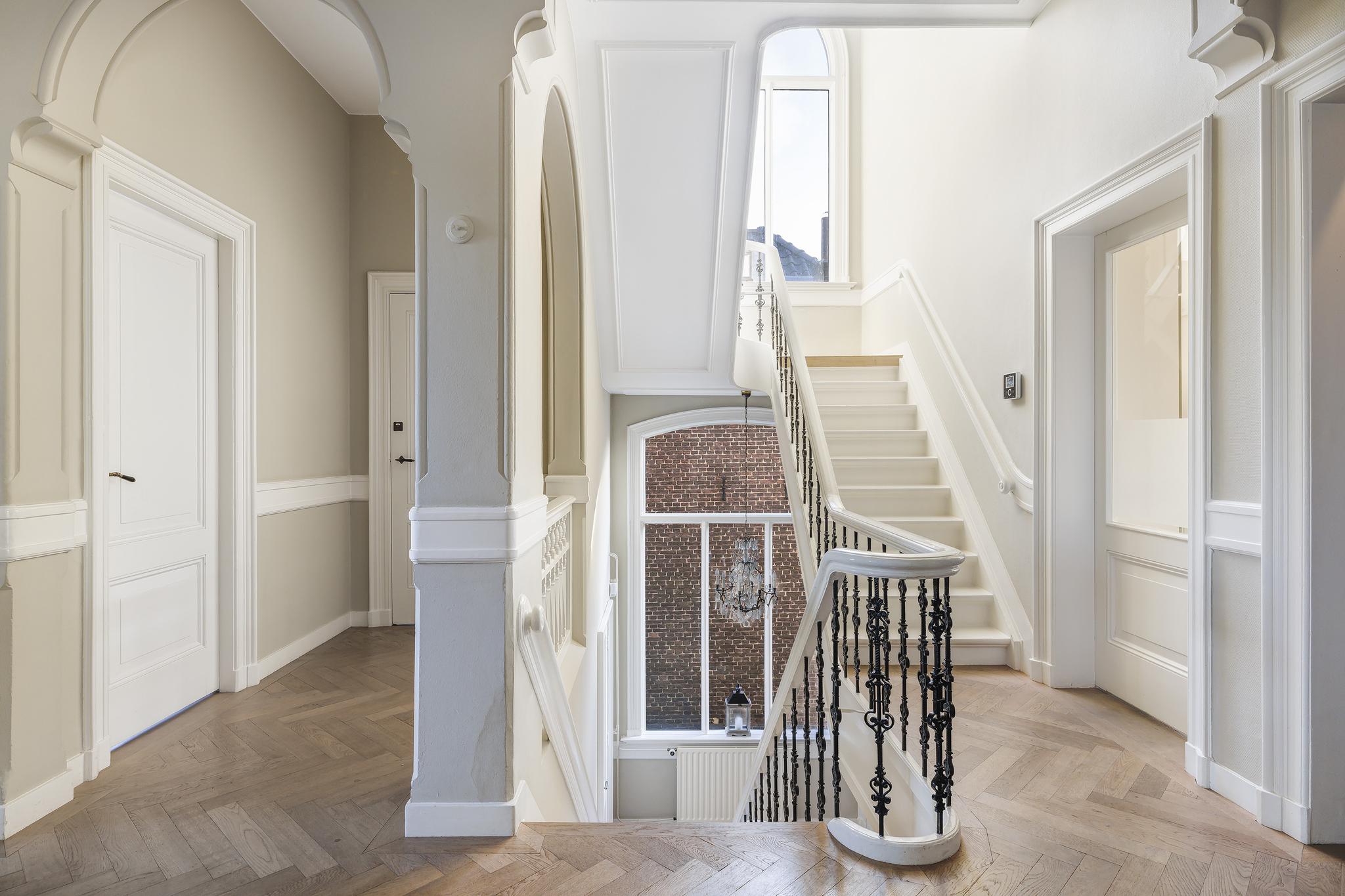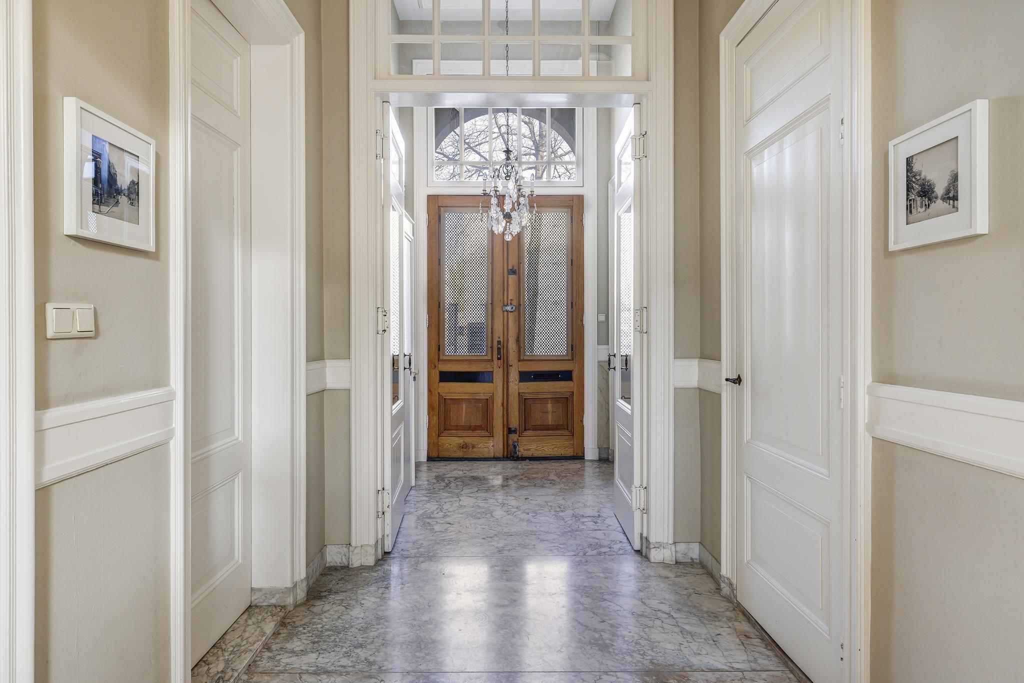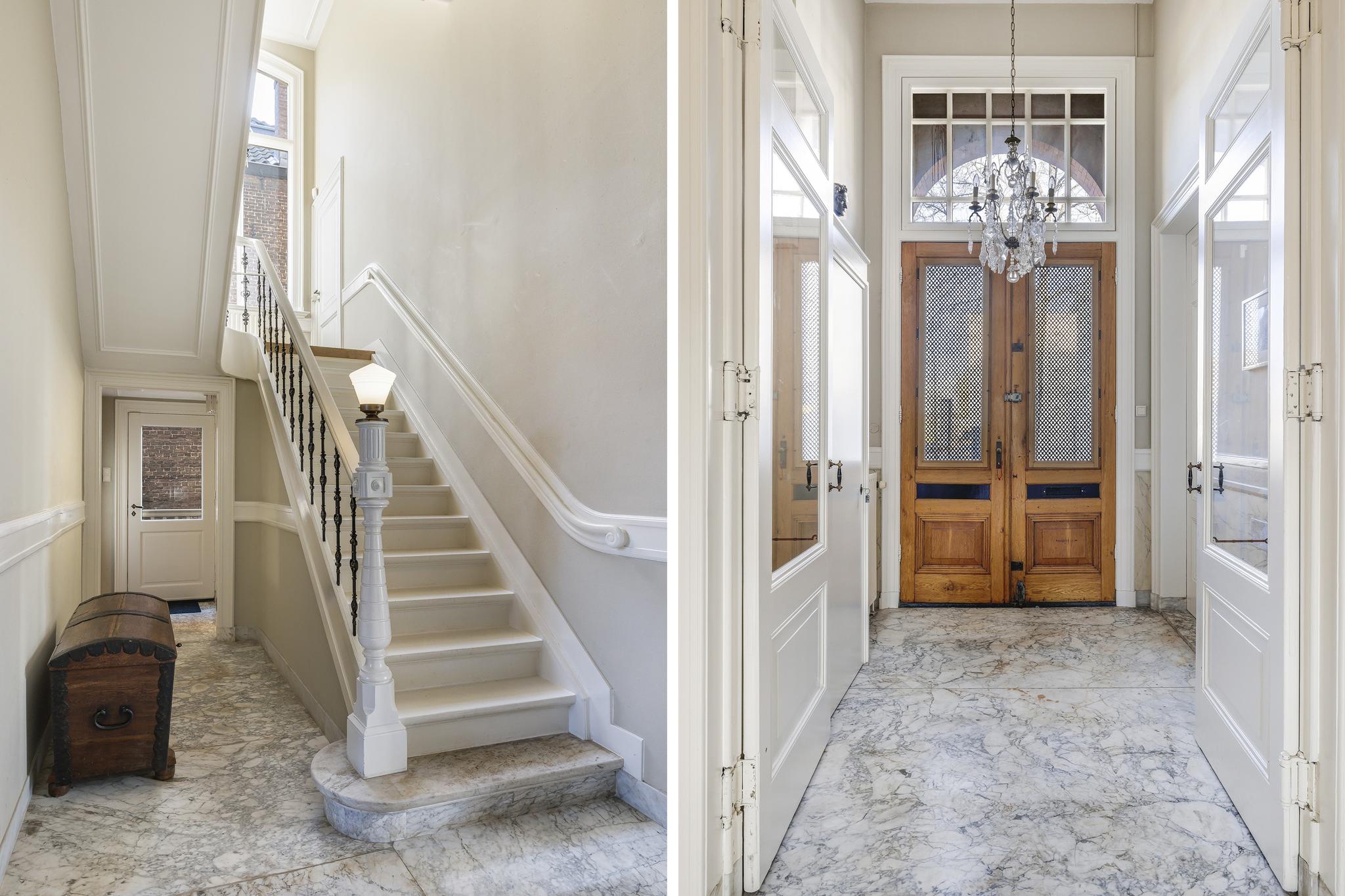 Vanuit de entree loop je via openslaande deuren de hal in, de heerlijke sfeer valt meteen op: marmeren vloeren, een prachtige originele trap die naar alle verdiepingen toe loopt, mooie ornamenten plafonds en paneel deuren. In de hal zit nog een apart toilet (nummer 2) met fonteintje. Ook is er toegang tot het souterrain.