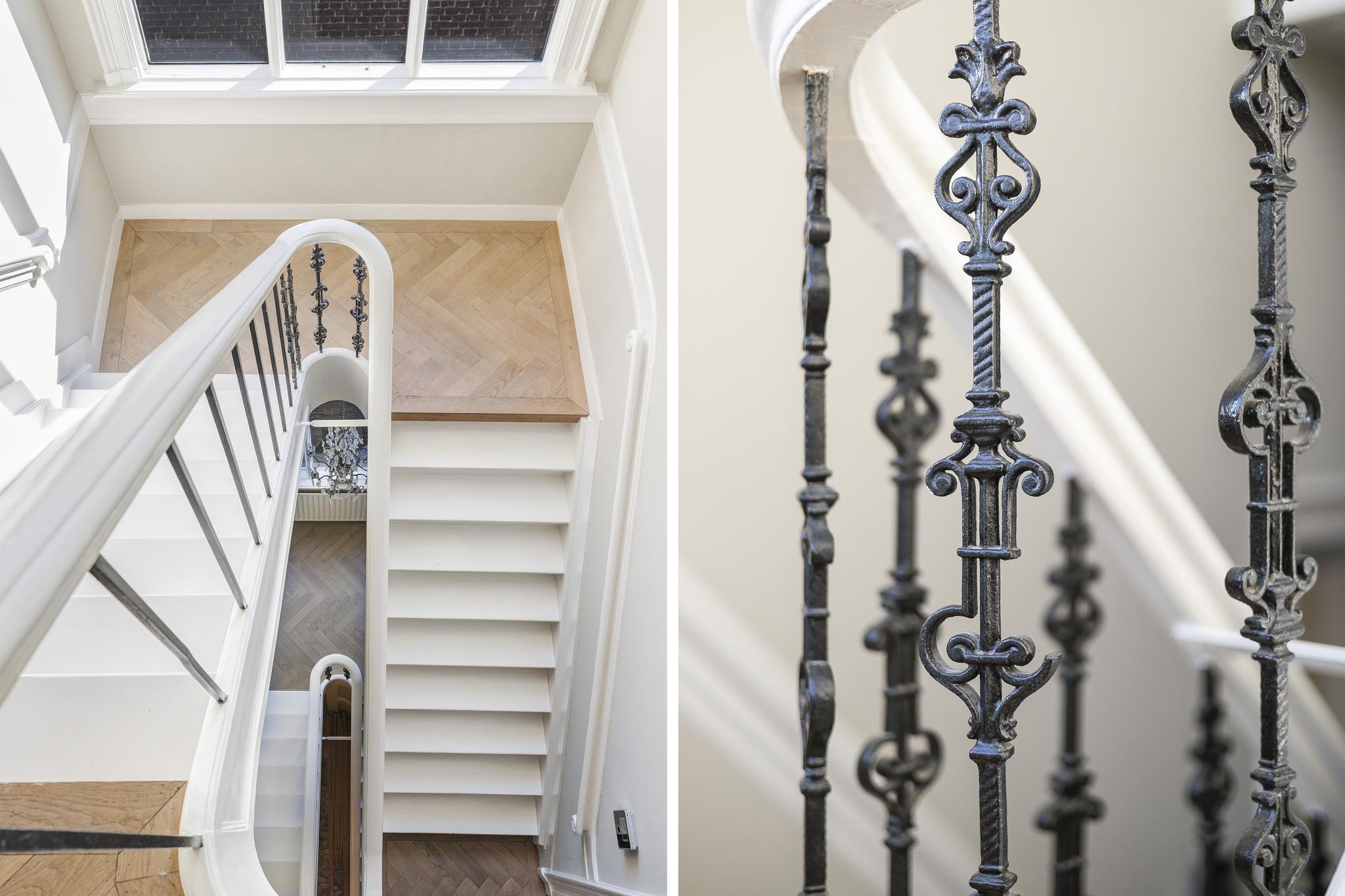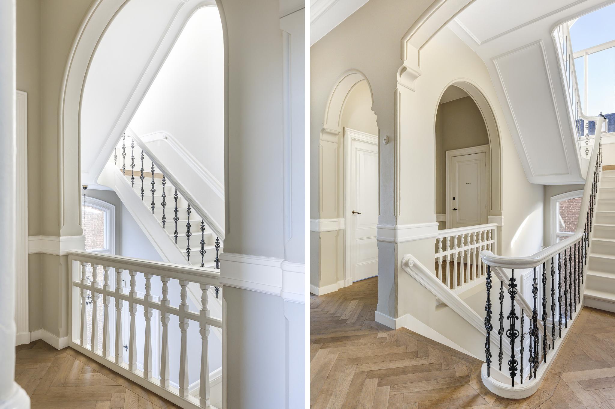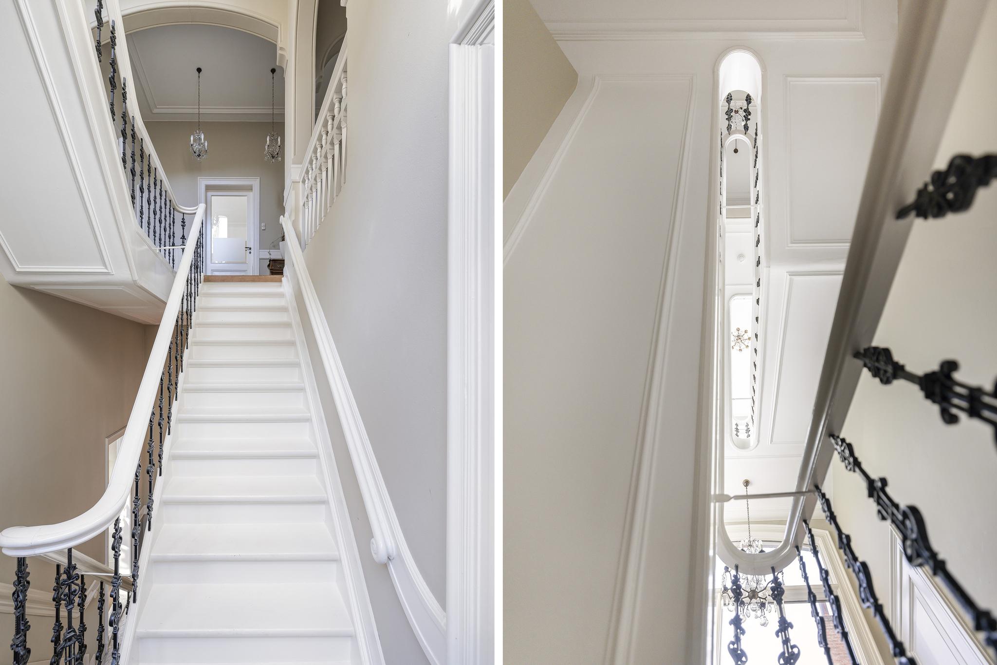 Vanuit de entree loop je via openslaande deuren de hal in, de heerlijke sfeer valt meteen op: marmeren vloeren, een prachtige originele trap die naar alle verdiepingen toe loopt, mooie ornamenten plafonds en paneel deuren. In de hal zit nog een apart toilet (nummer 2) met fonteintje. Ook is er toegang tot het souterrain.