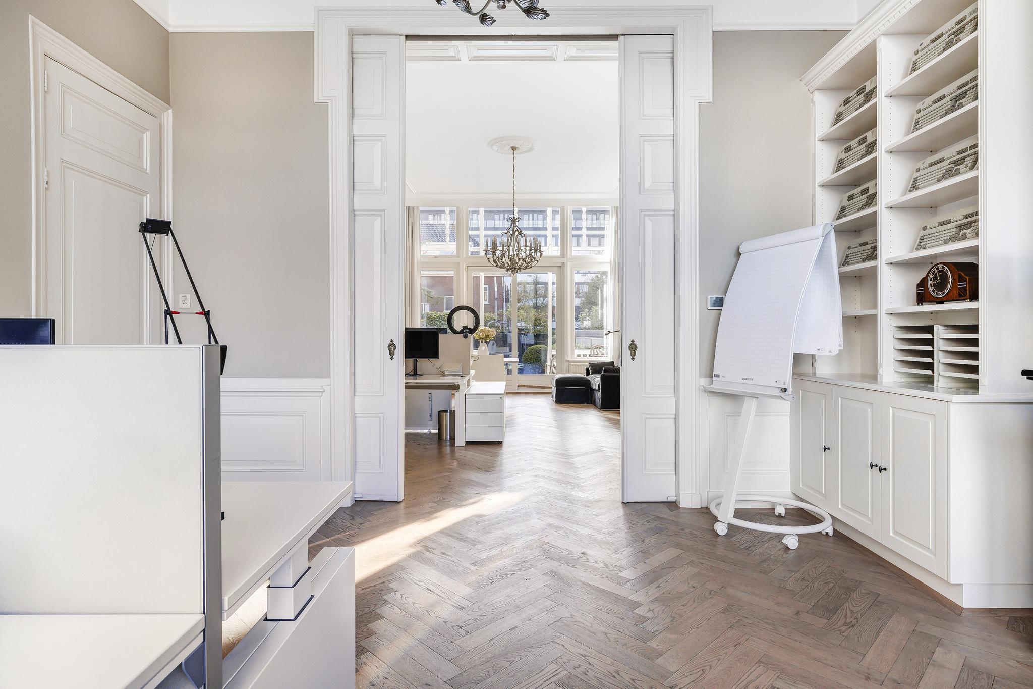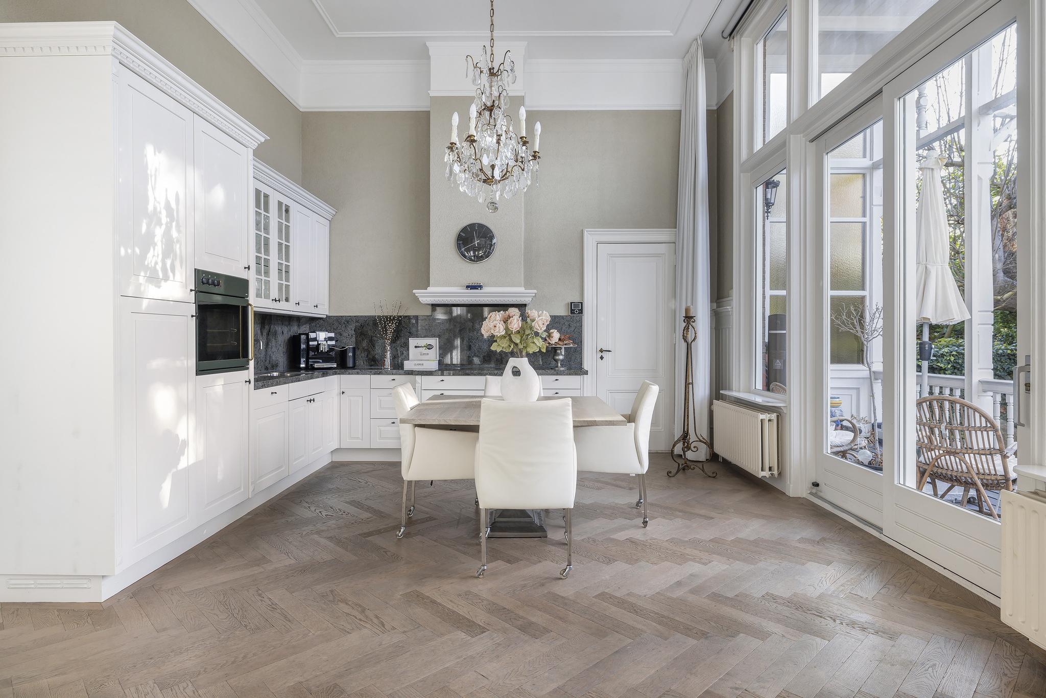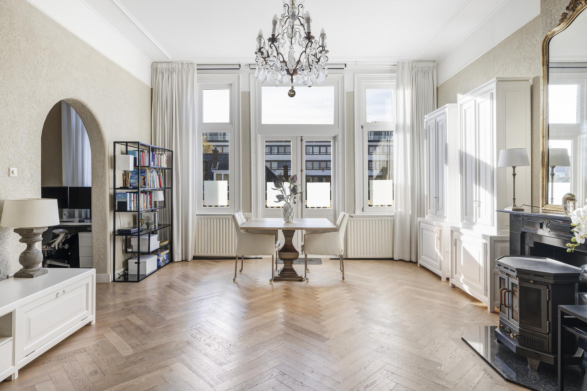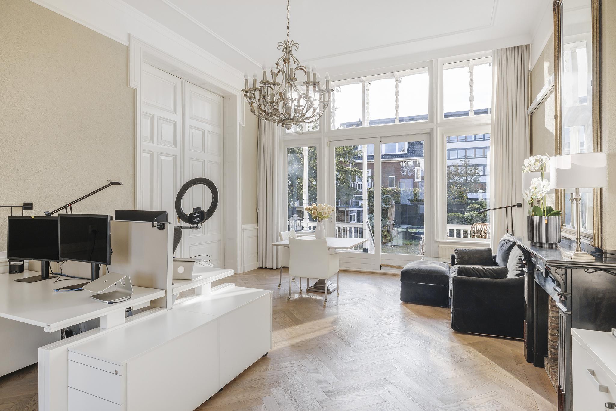 De woonkamer en suite met mooie vaste kasten en schuifdeuren is enorm van formaat. In het verleden is deze ruimte als kantoor in gebruik geweest. In de voorkamer en achterkamer is een marmeren schouw met gashaard aanwezig. Vanuit de achterkamer toegang tot de eerste keuken en toegang tot het sfeervolle veranda via openslaande deuren.