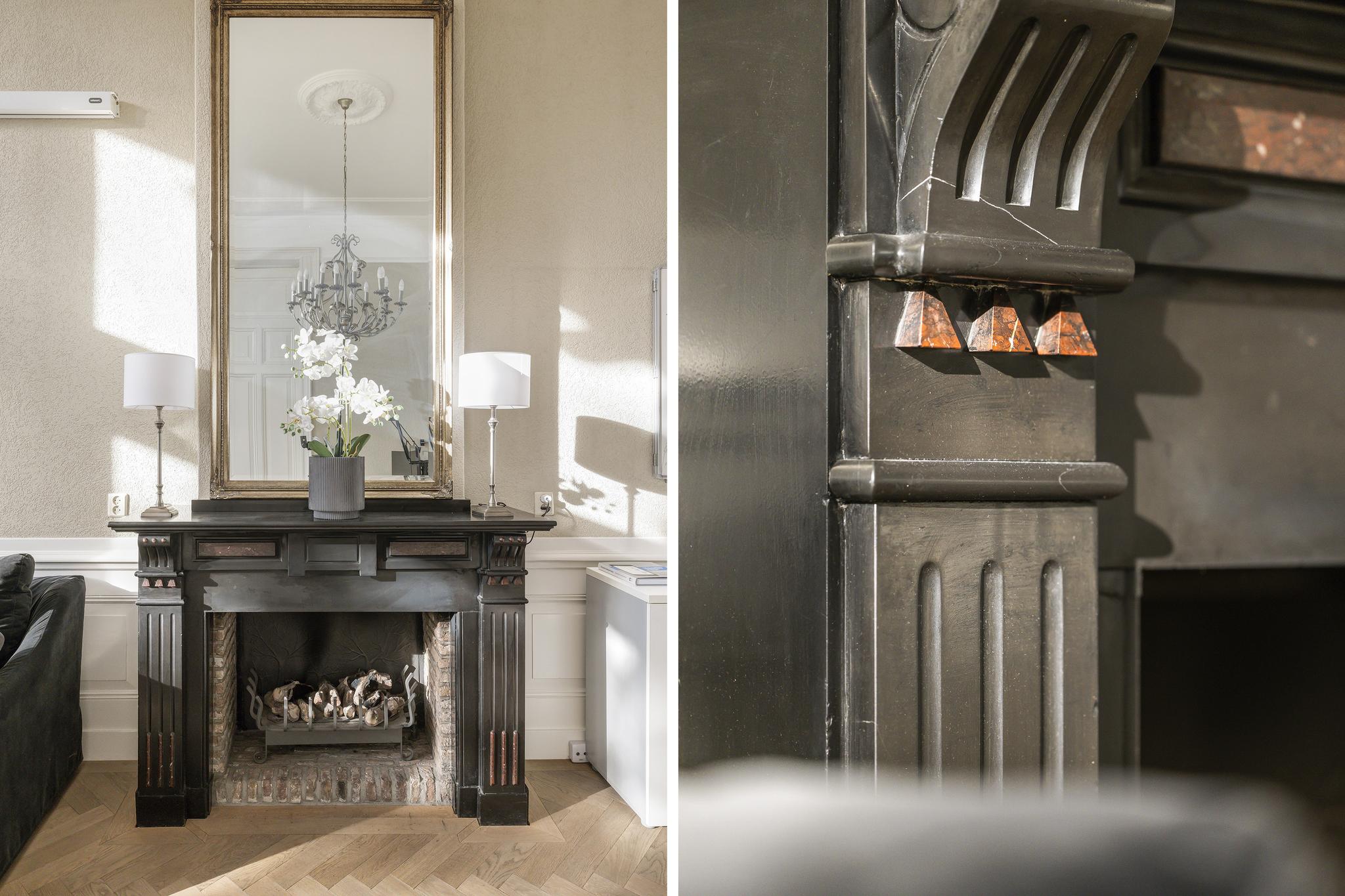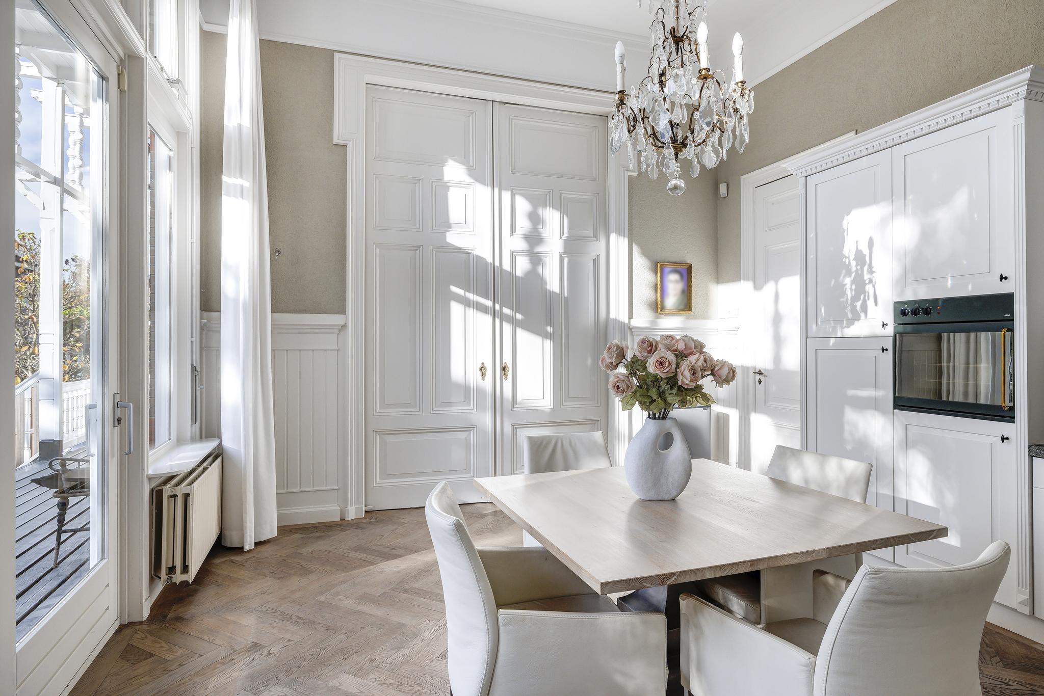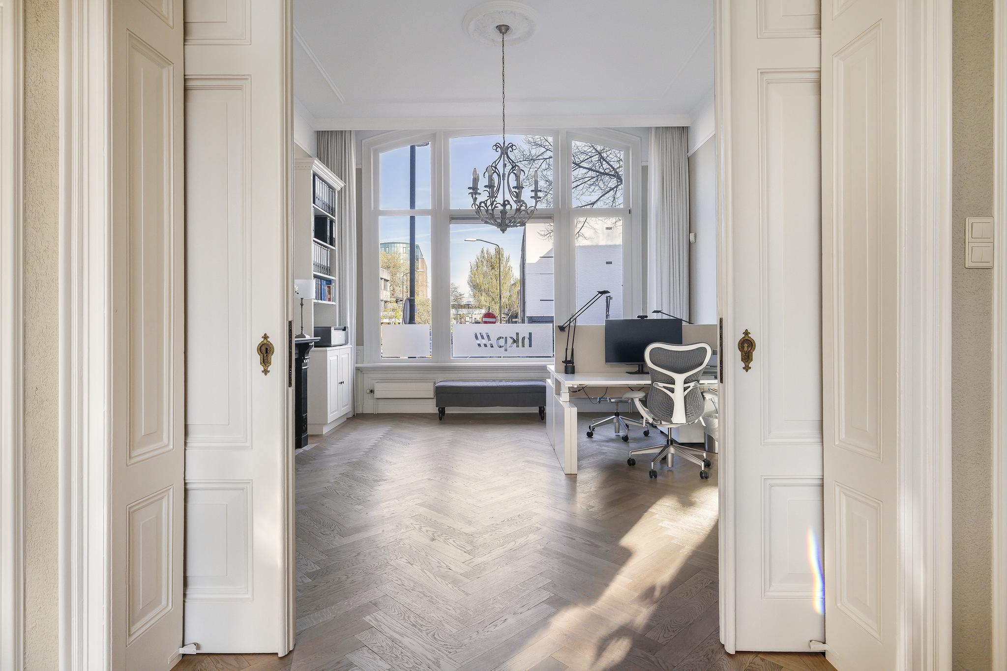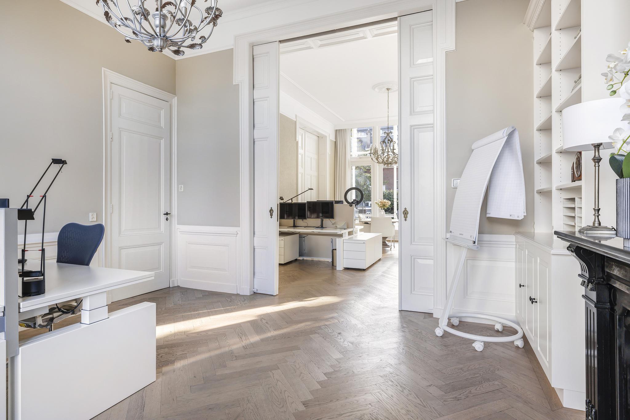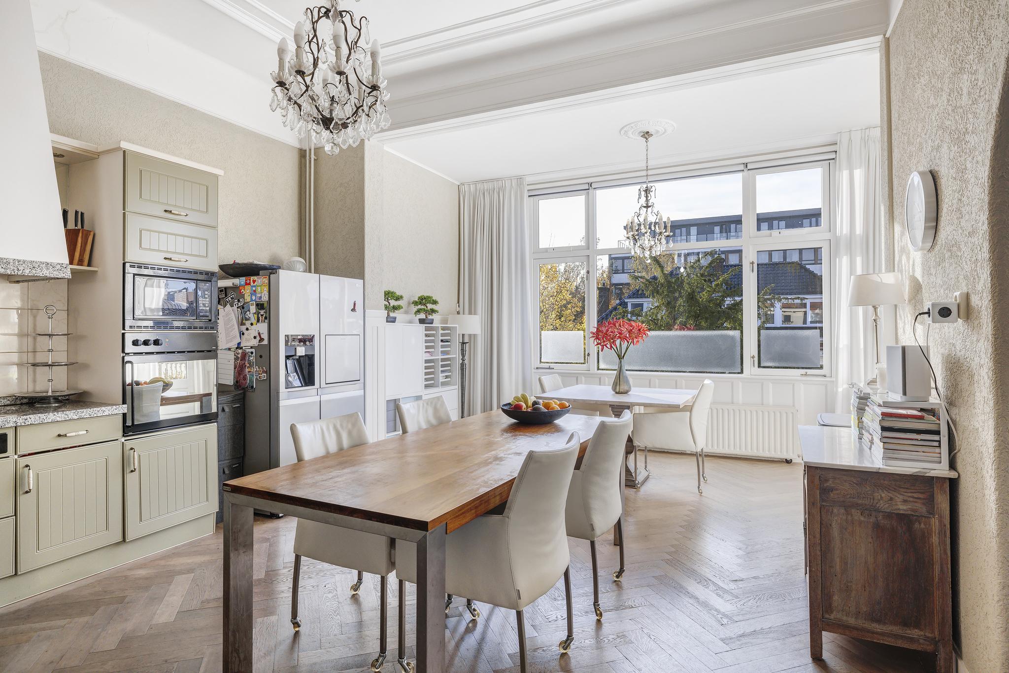 De woonkamer en suite met mooie vaste kasten en schuifdeuren is enorm van formaat. In het verleden is deze ruimte als kantoor in gebruik geweest. In de voorkamer en achterkamer is een marmeren schouw met gashaard aanwezig. Vanuit de achterkamer toegang tot de eerste keuken en toegang tot het sfeervolle veranda via openslaande deuren.