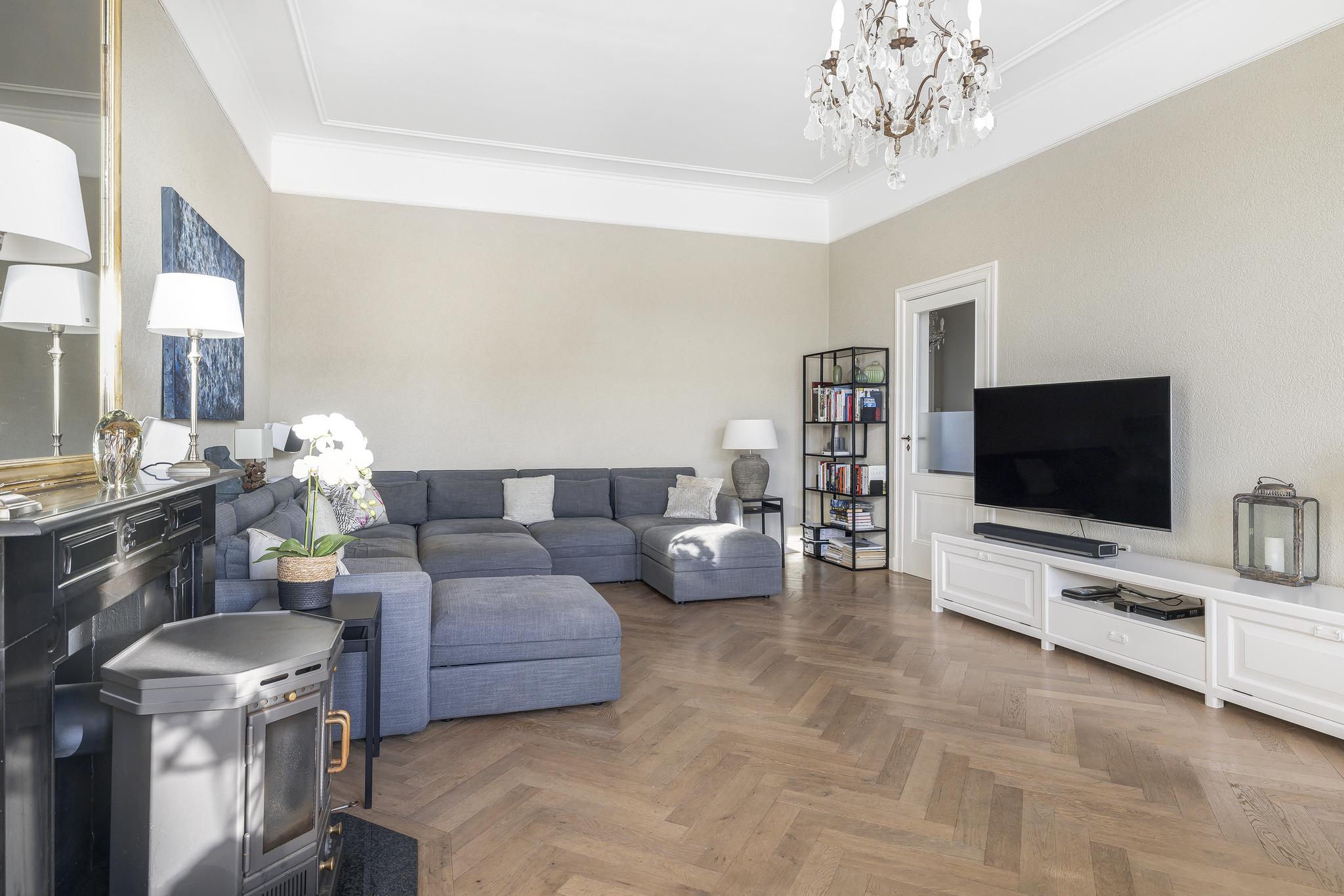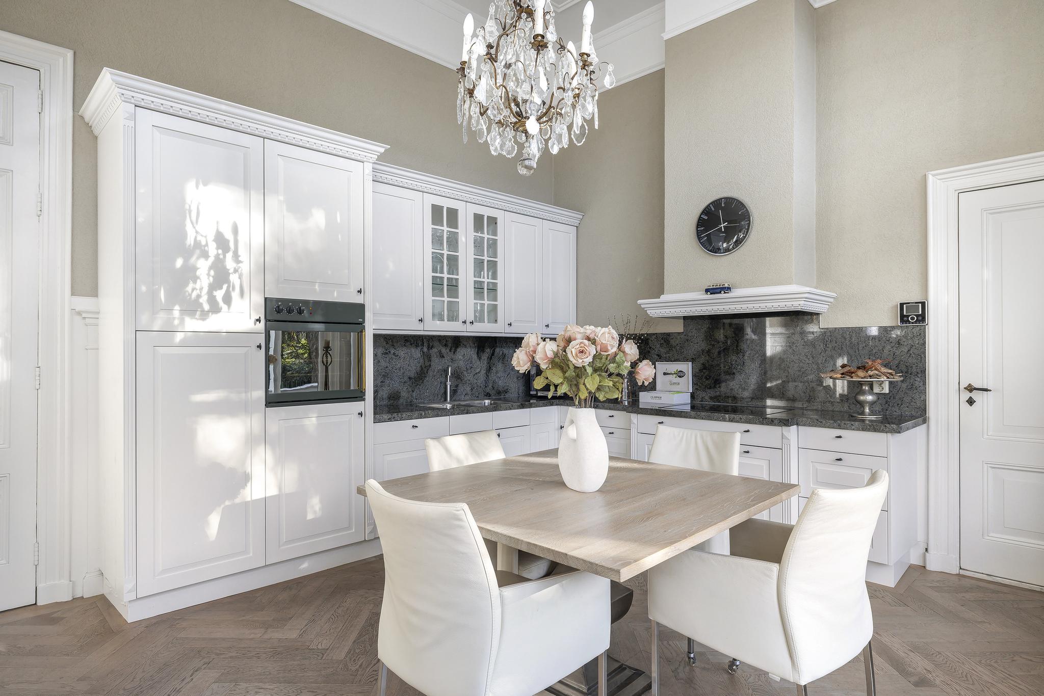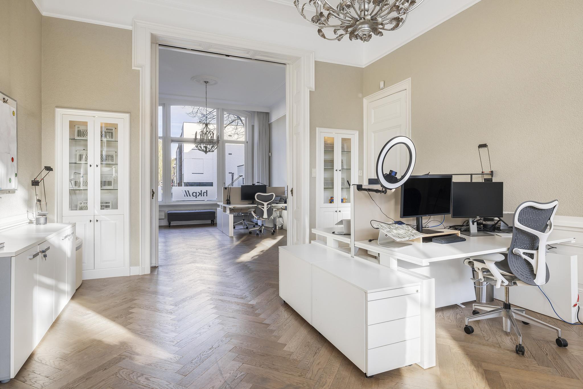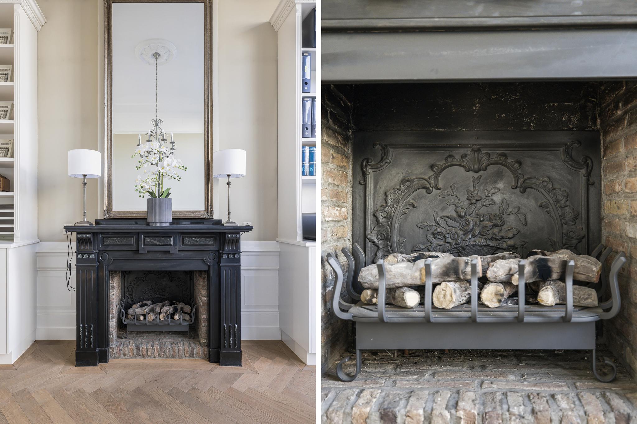 De woonkamer en suite met mooie vaste kasten en schuifdeuren is enorm van formaat. In het verleden is deze ruimte als kantoor in gebruik geweest. In de voorkamer en achterkamer is een marmeren schouw met gashaard aanwezig. Vanuit de achterkamer toegang tot de eerste keuken en toegang tot het sfeervolle veranda via openslaande deuren.