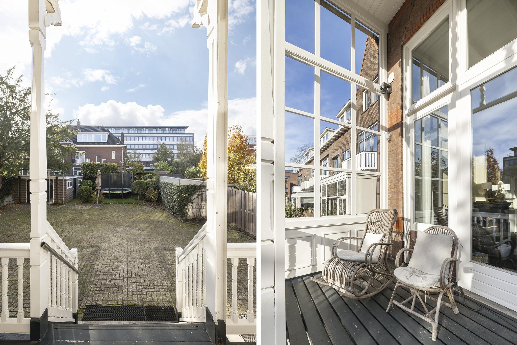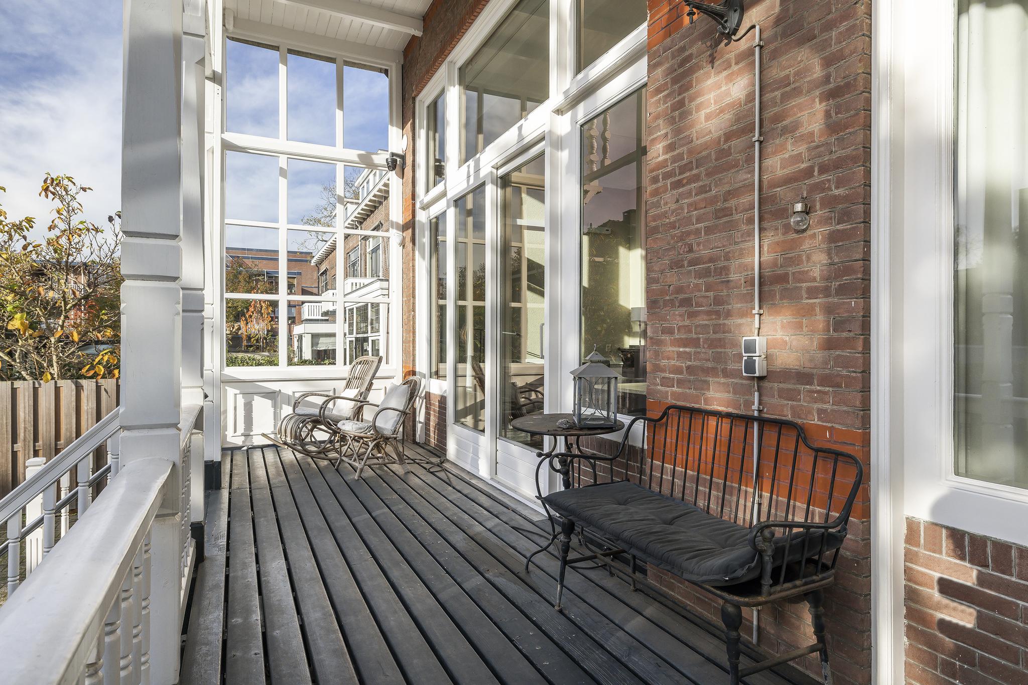 De veranda ligt geweldig op de zon (zuiden) en overkijkt het gehele perceel. Op dit moment is de tuin grotendeels bestraat (wat ideaal is voor het parkeren van auto's, we schatten dat er zeker 5 kunnen staan) en daarnaast is er een garage aanwezig.