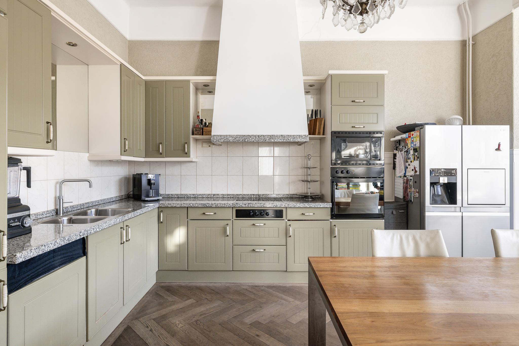 De keuken is door één van de vorige eigenaren uitgebouwd. Op dit moment is er een verouderde hoekkeuken aanwezig met Quooker kraan, magnetron, oven, afzuigschouw, dubbele spoelbak, vaatwasser, keramische kookplaat en losse koelkast en vriezer. De ruimte leent zich echter zeer goed voor een enorme eiland keuken, wij zien hem al staan op de prachtige visgraat vloer!