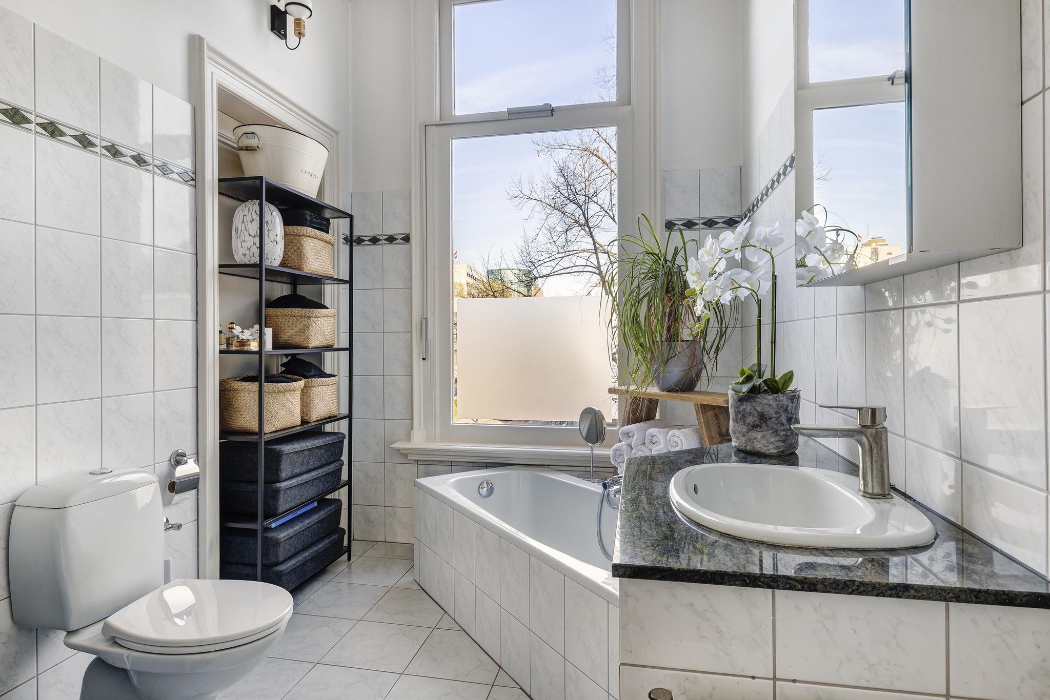 Slaapkamer aan de voorzijde met badkamer en suite met toilet (nummer 6), douche, ligbad en marmeren wastafel. Deze 2 kamers zijn samen te voegen tot bijvoorbeeld 1 grote woonkamer van de voor- naar de achterzijde van het pand.