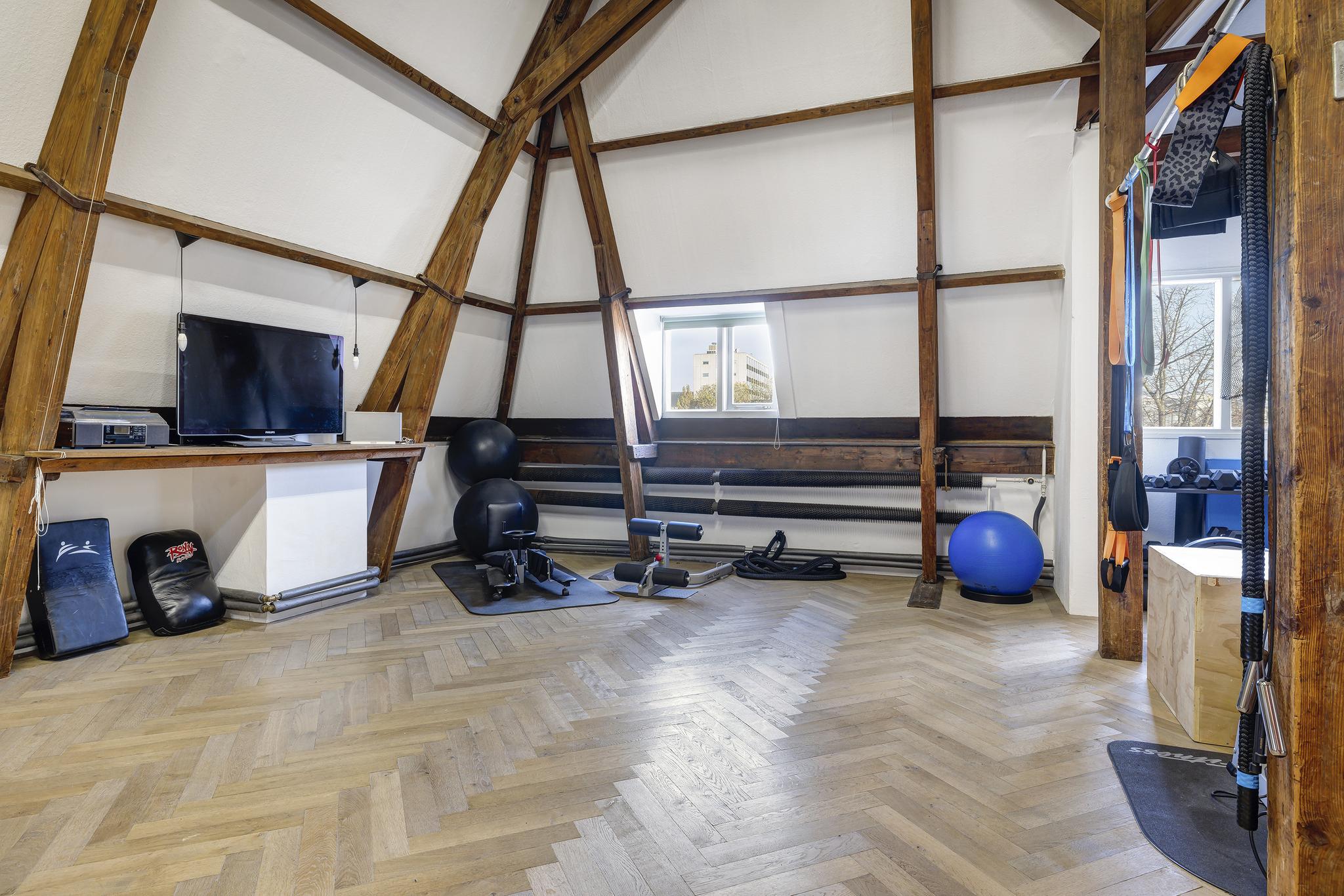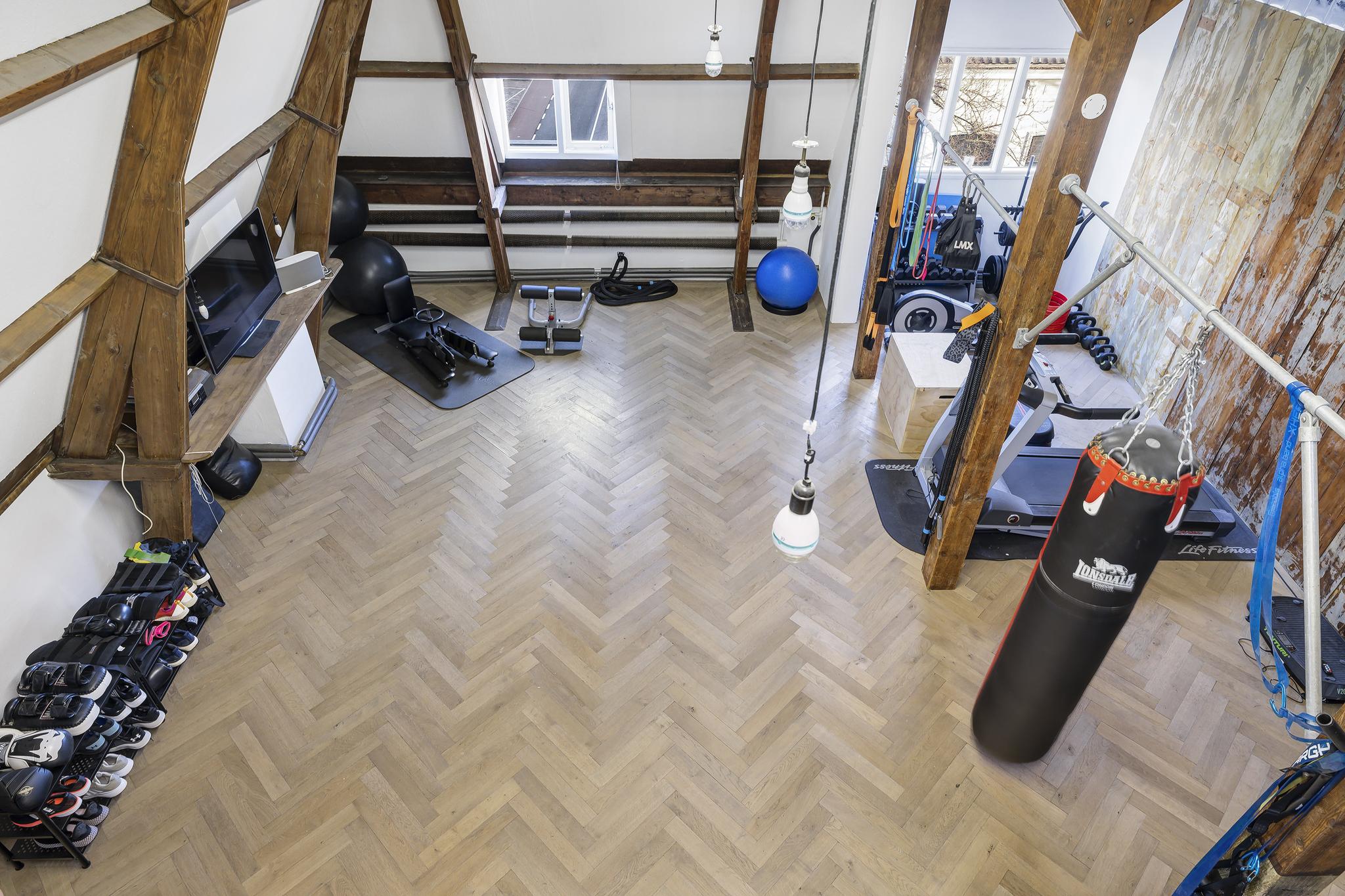Multifunctionele, maar nu zeer toffe gym met vide. De ruimte is enorm hoog, doet licht aan en het volledige dak is geïsoleerd. Ook hier (net als op alle andere verdiepingen met uitzondering van het souterrain) is de visgraatvloer terug te vinden.