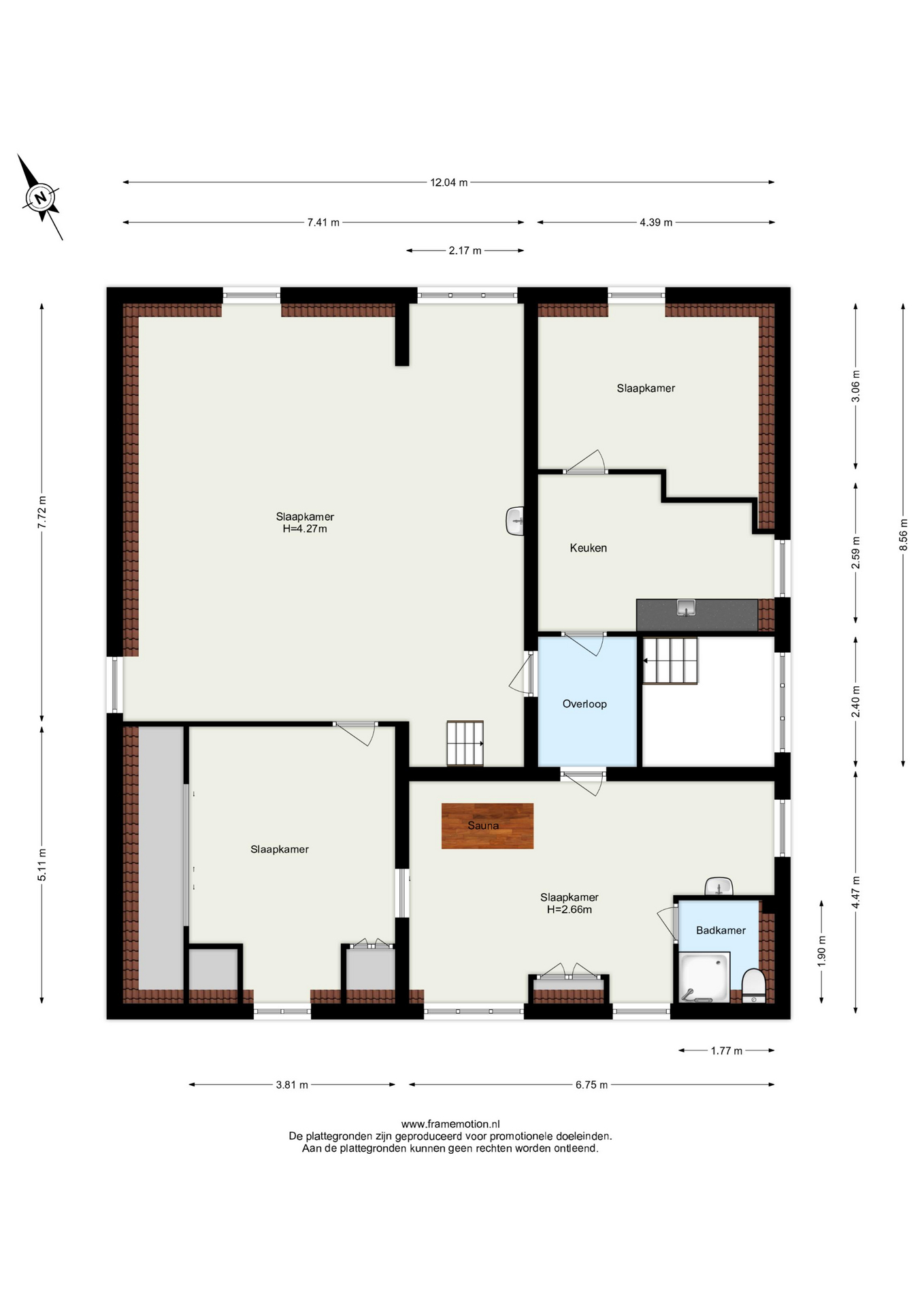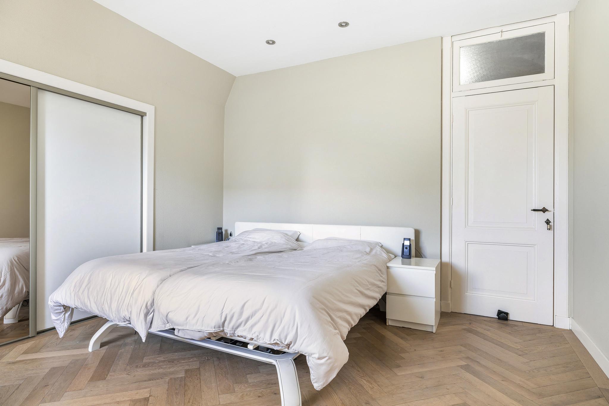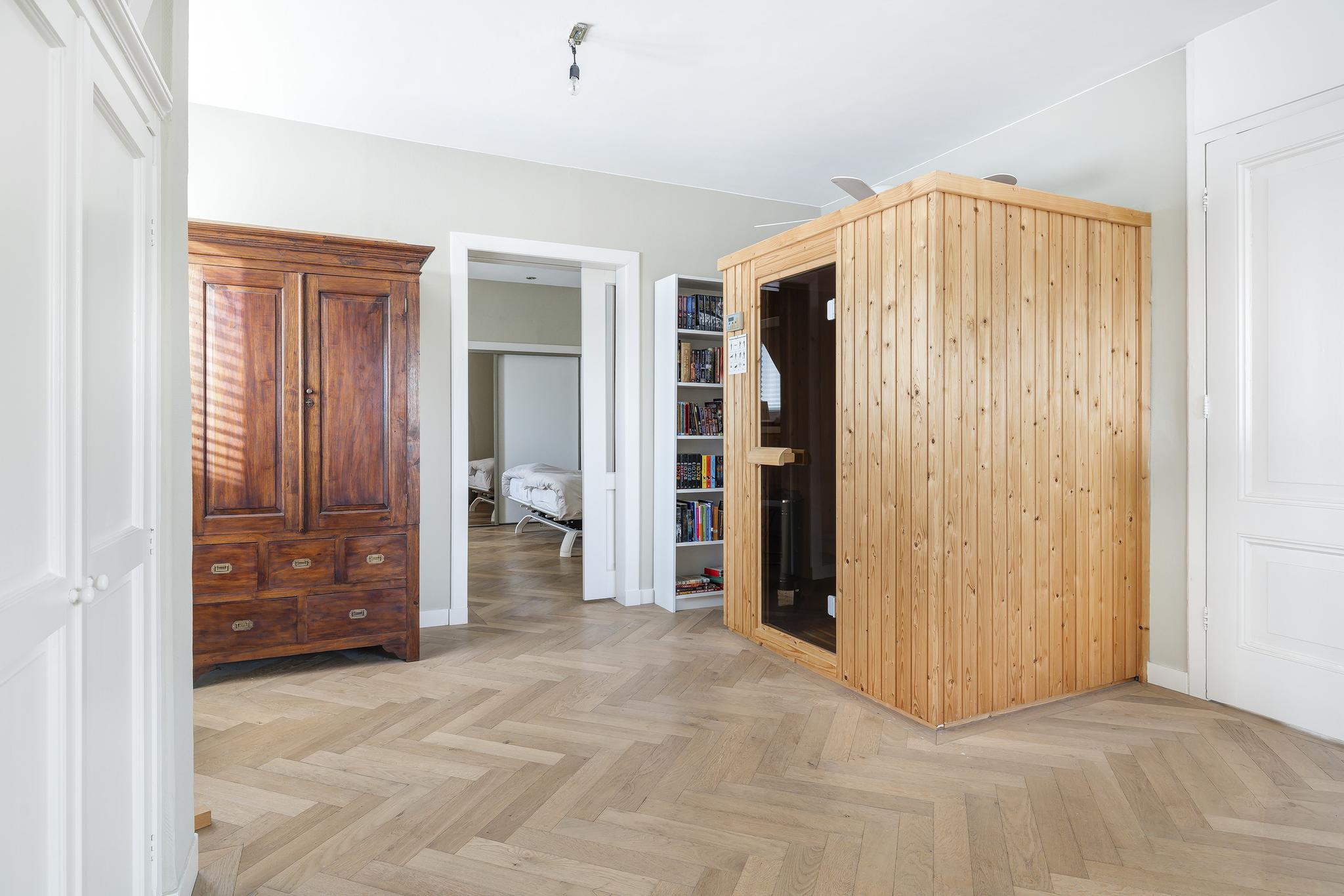 De volledige achterzijde van deze verdieping is als ouderslaapkamer in gebruik met vaste kasten voor de kleding, eigen badkamer en eigen traditionele sauna met infrarood! Een heerlijke, rustige verdieping met op dit moment een grote ruimte aan de voorzijde die als gym in gebruik is.