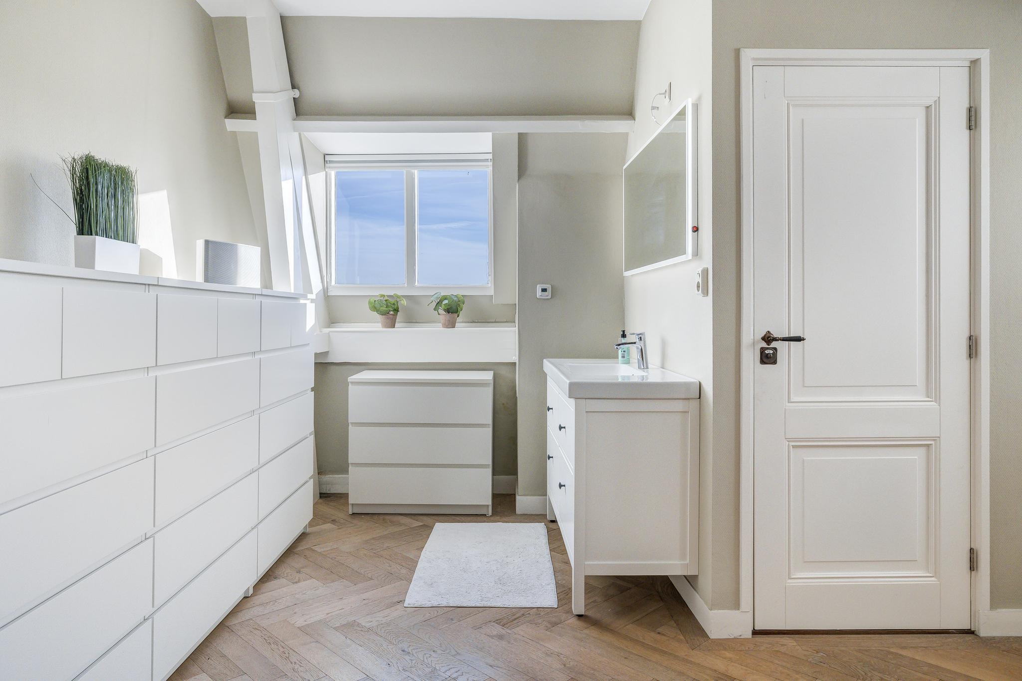 De badkamer is voorzien van een douche en toilet (de laatste, nummer 7!) en vloerverwarming. In de wellness ruimte zit nog een wastafel en diverse ladekasten.