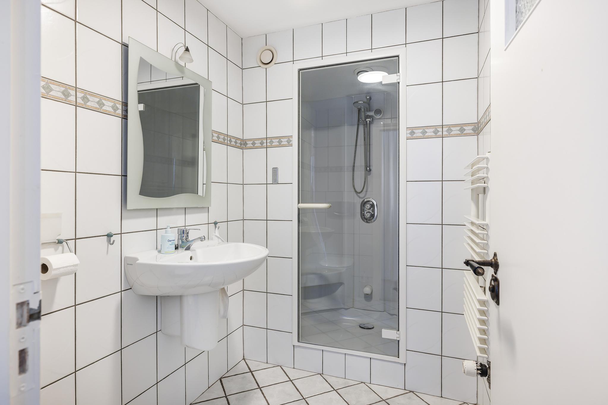Badkamer 1, voorzien van een toilet (nummer 1), wastafel en stoom douchecabine met zitje en thermostaatkraan.