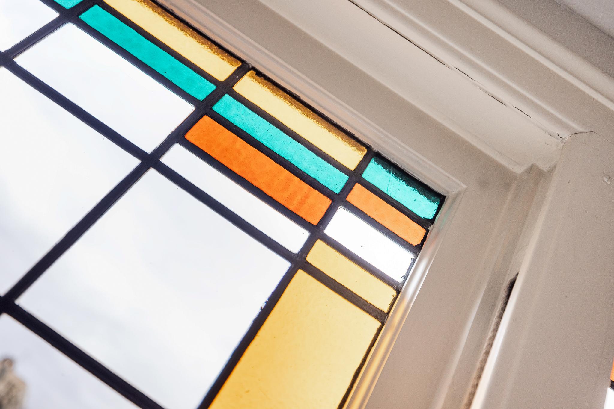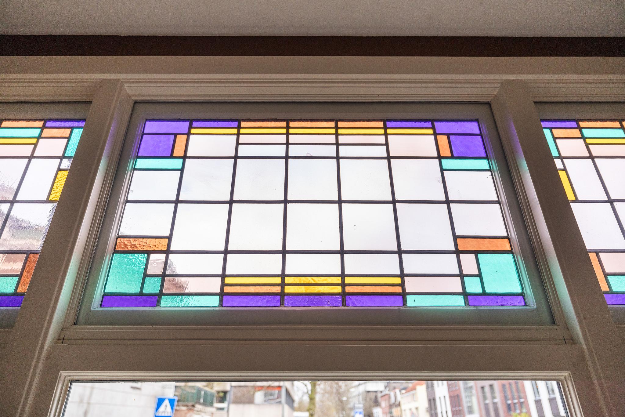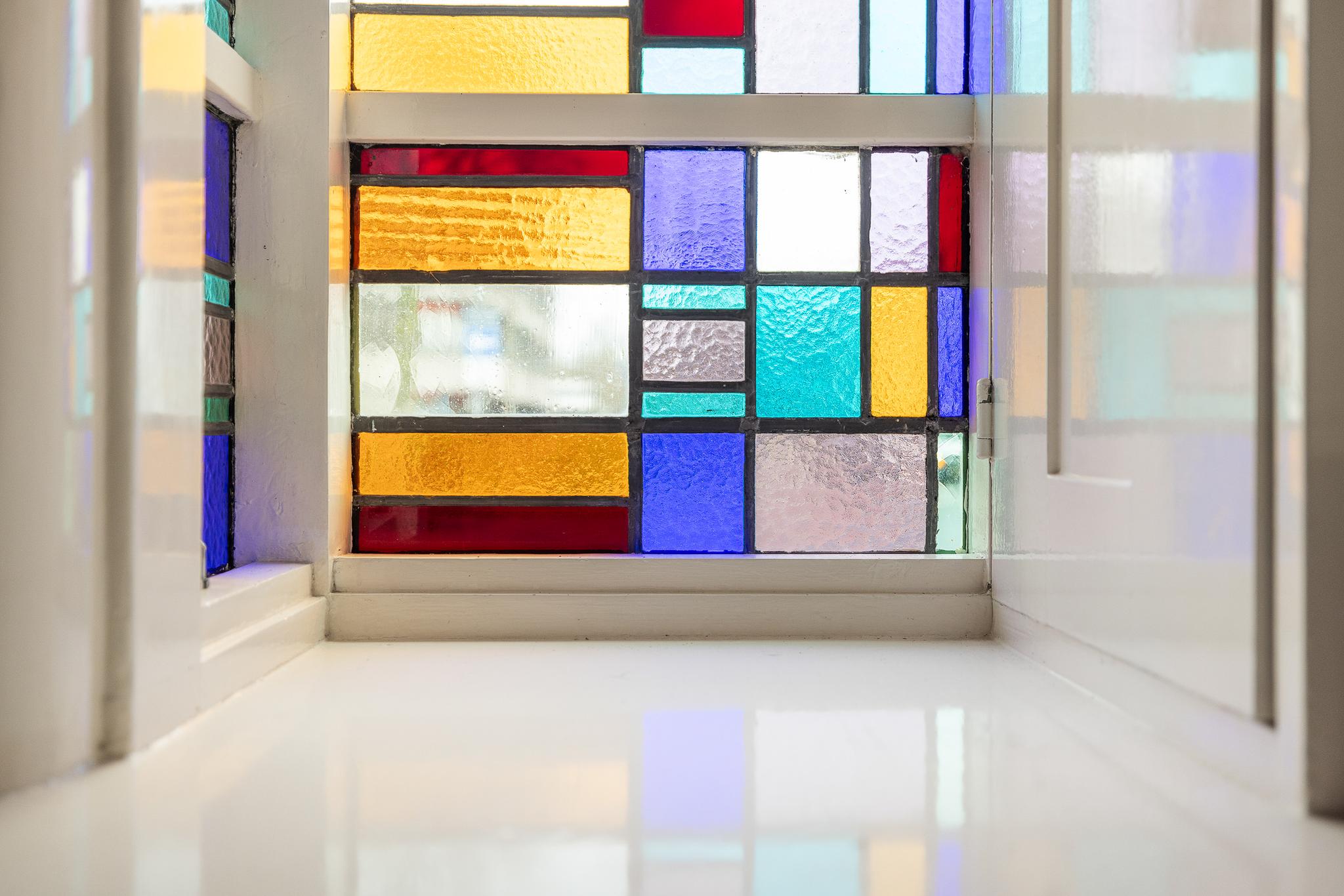 Entree in het portaal met meterkast en toegang tot de hal. Wat gelijk opvalt is het sfeervolle glas in lood.
