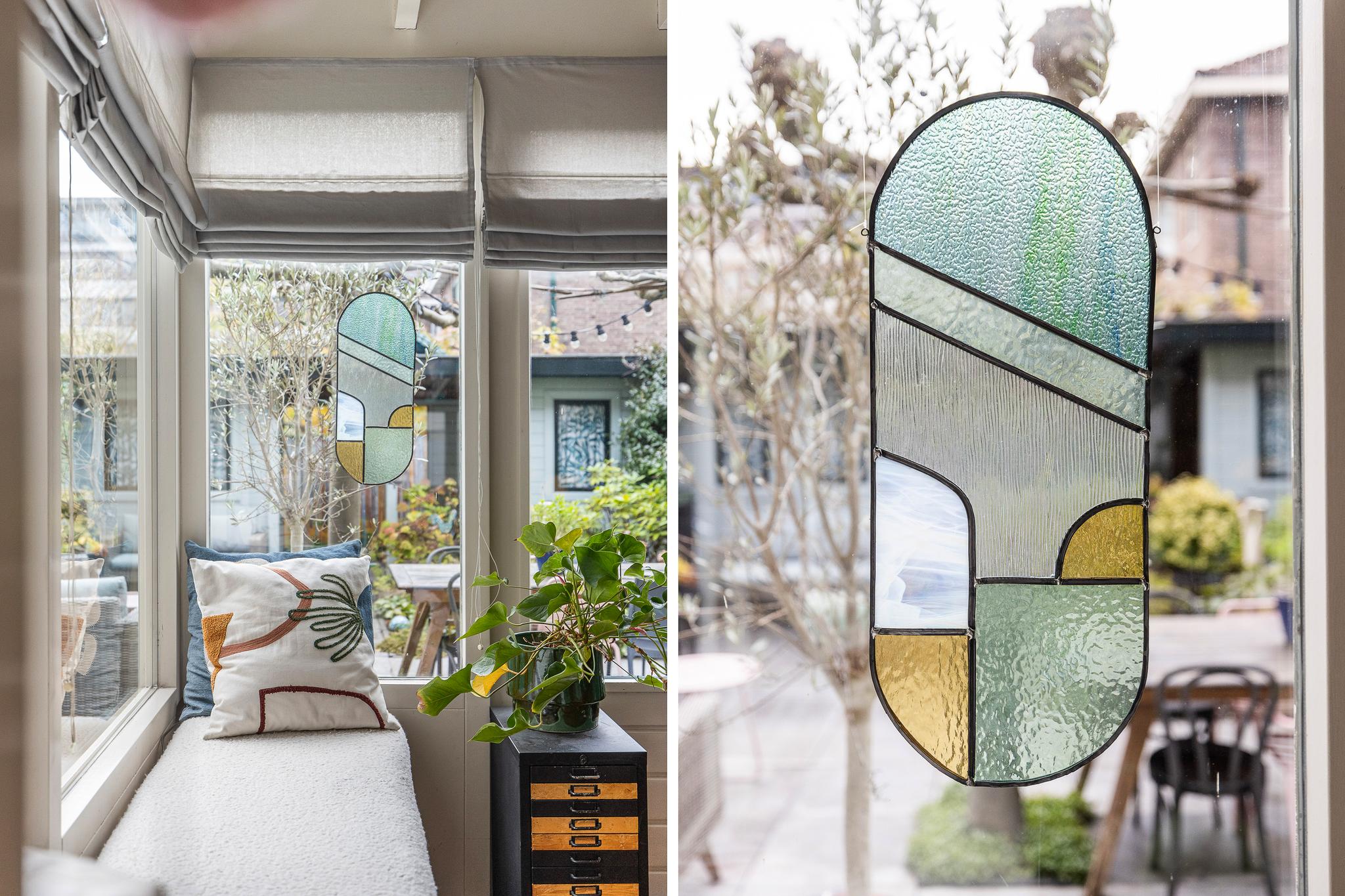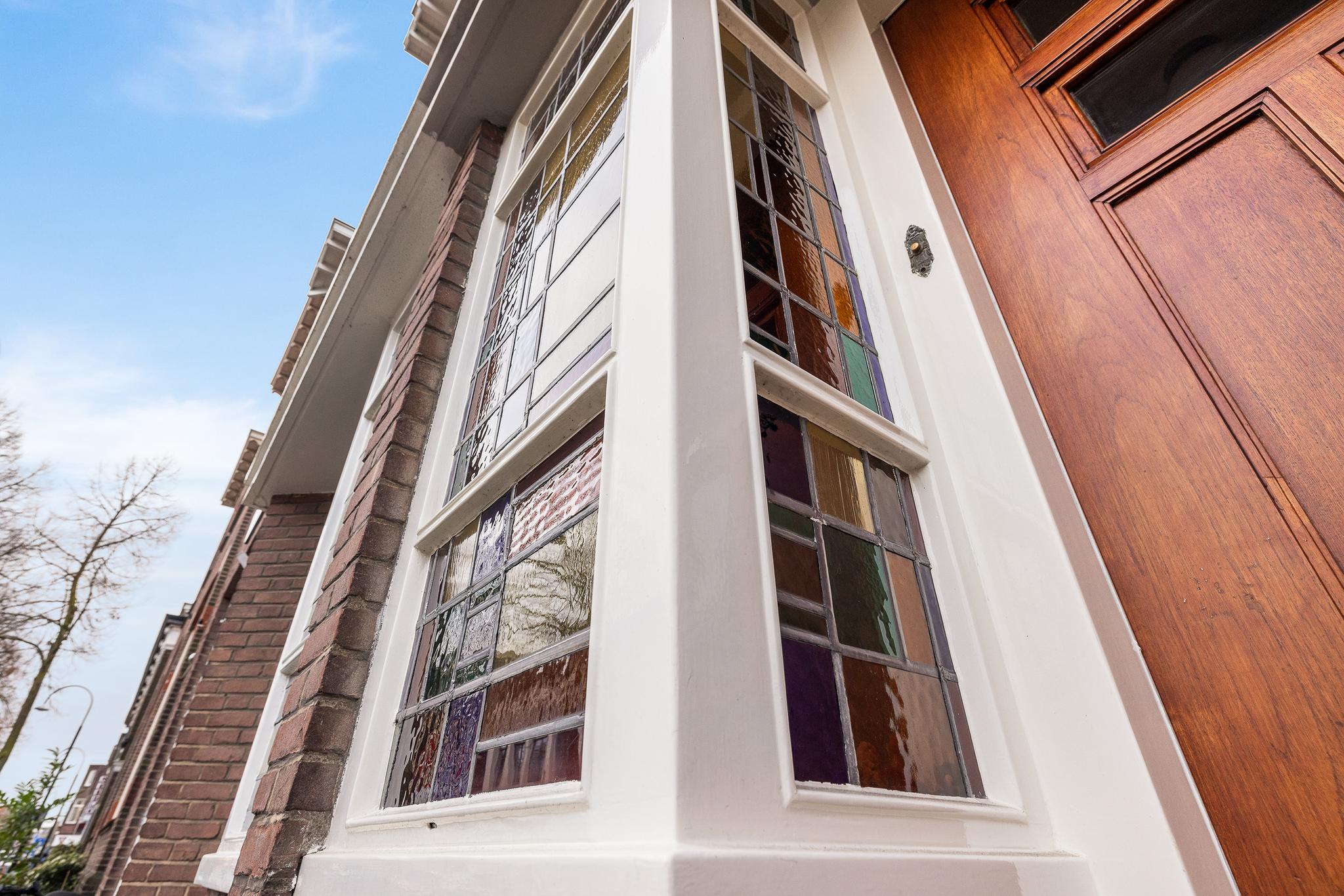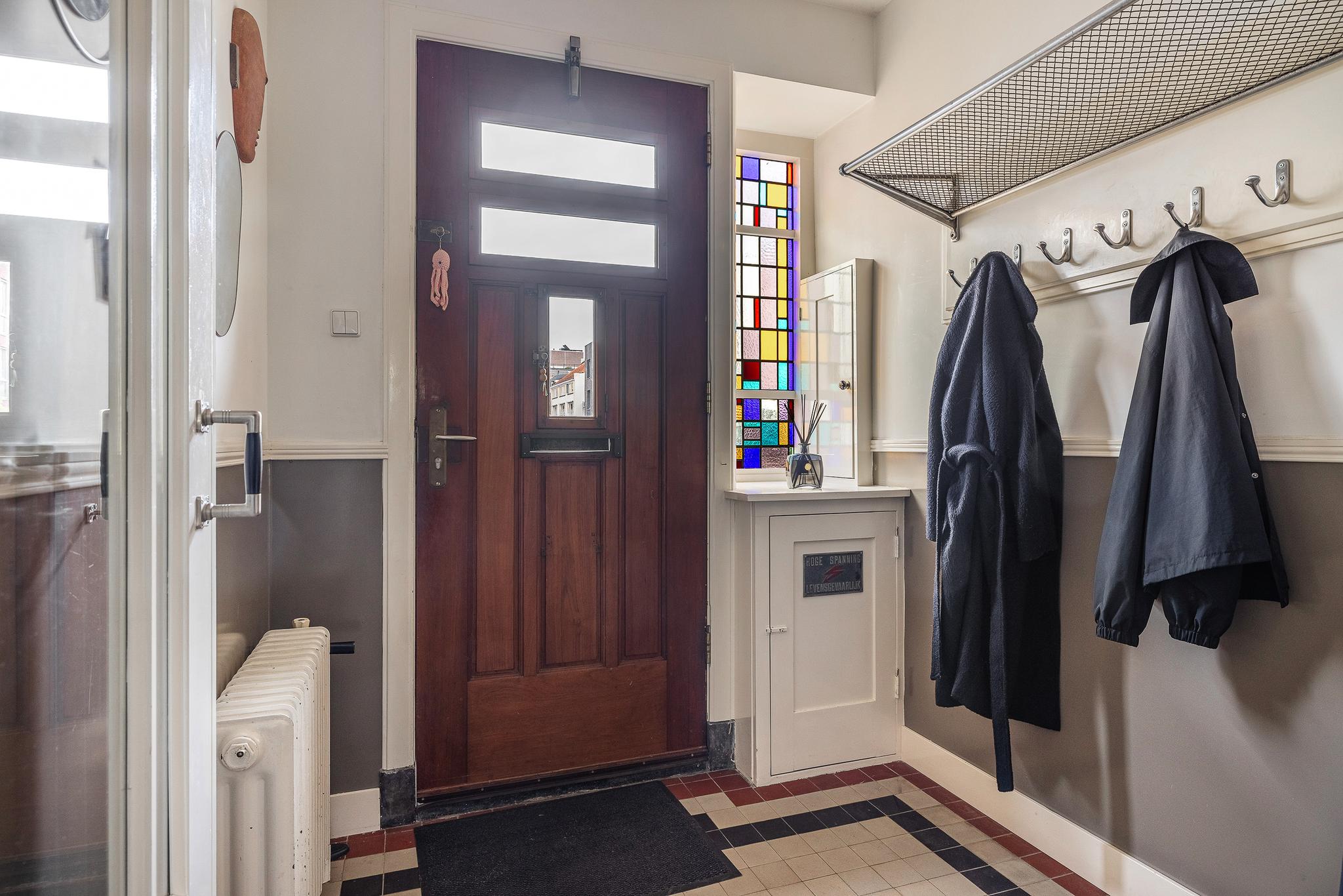 Entree in het portaal met meterkast en toegang tot de hal. Wat gelijk opvalt is het sfeervolle glas in lood.