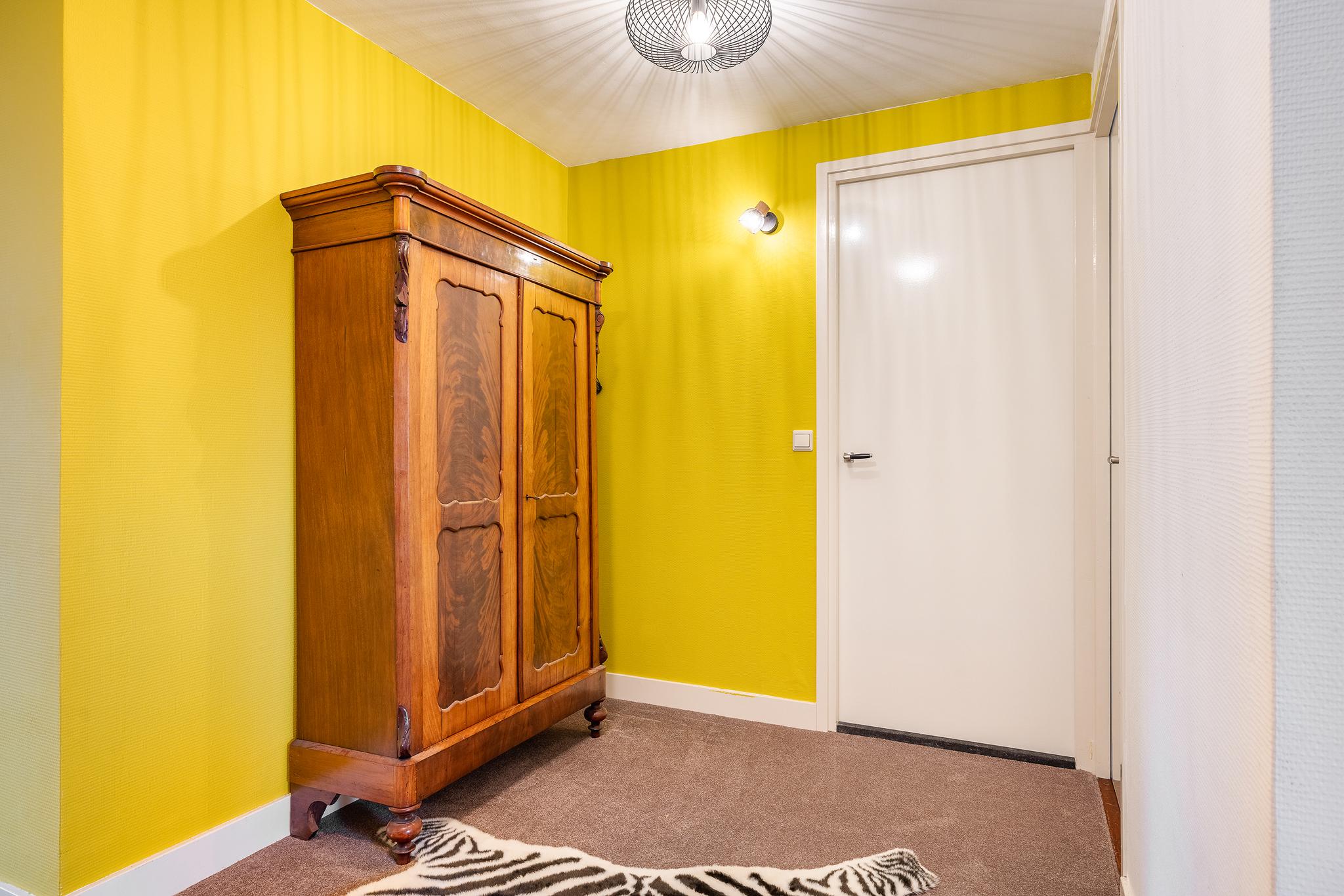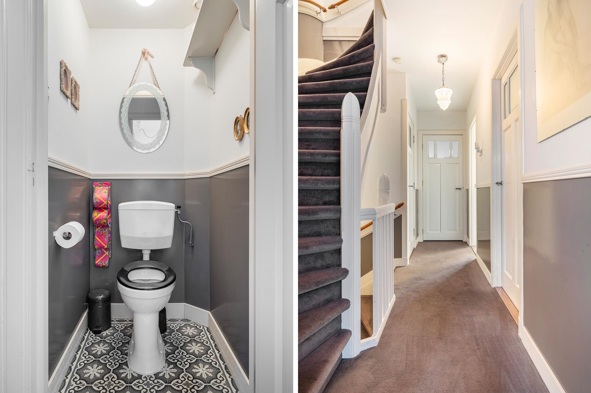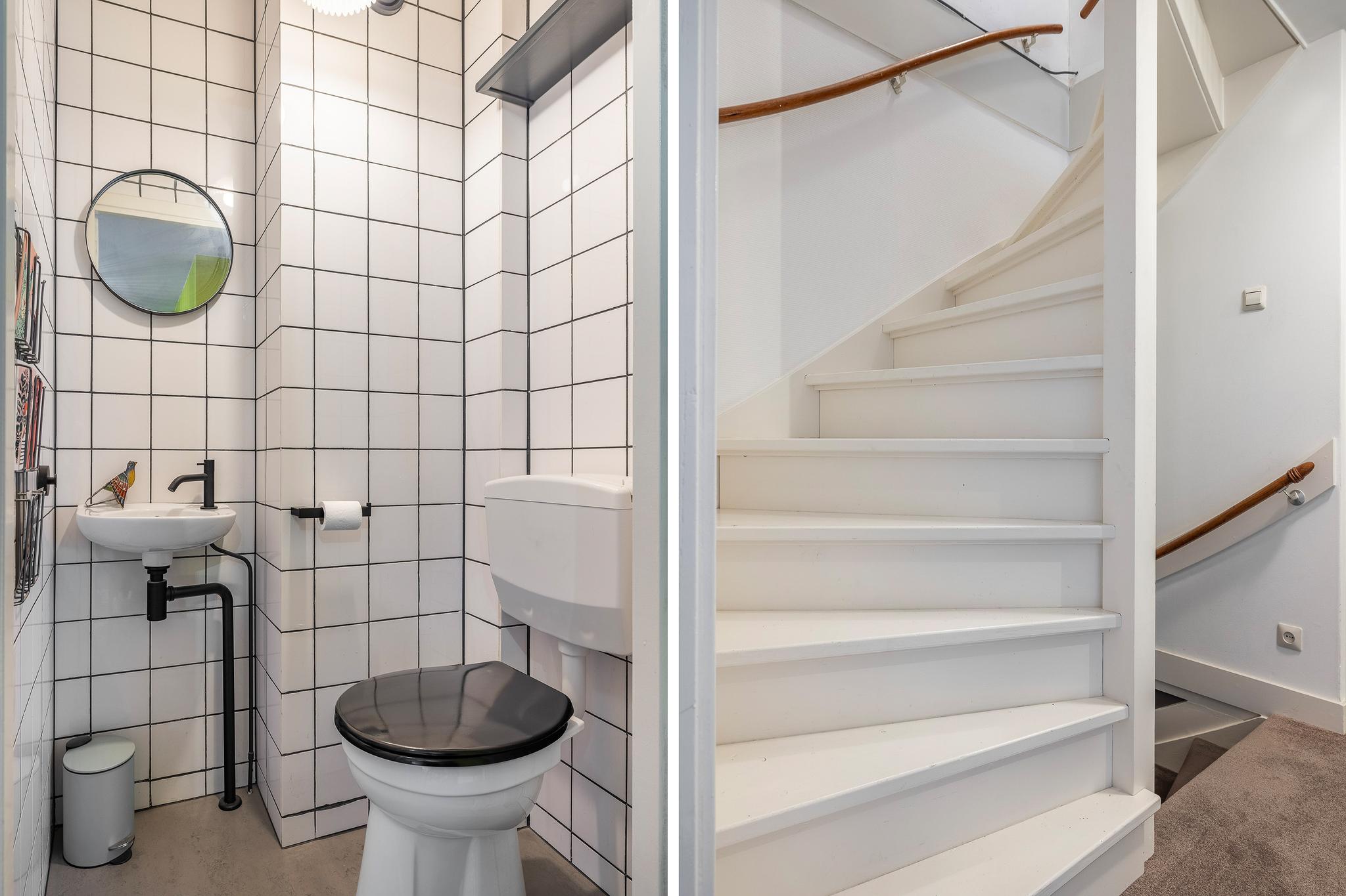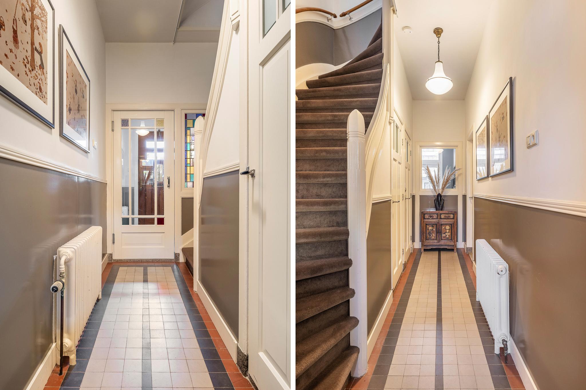 In de hal lopen de elementen door in bijvoorbeeld de details van de trap en de wanden van de hal. In de hal is het toilet aanwezig en een grote kelderkast. De kelderkast biedt toegang tot een volledige kelder, wat extra praktische ruimte creëert.