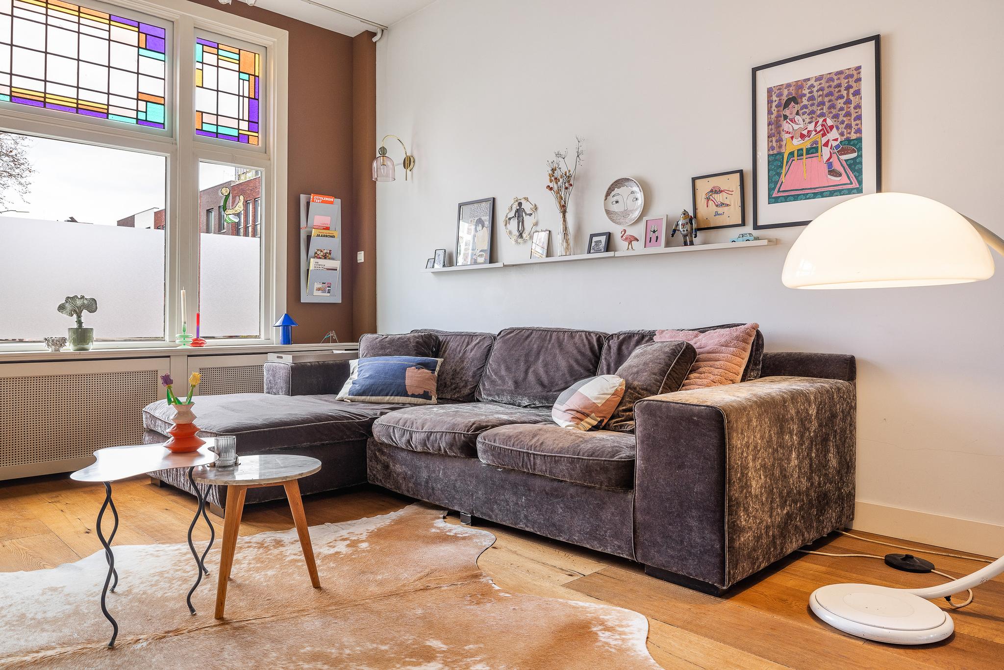 De woonkamer is bijzonder groot met nu aan de voorzijde de zithoek en aan de achterzijde de open keuken en de aangebouwde serre. De kamer is zo groot dat je hem naar eigen inzicht op allerlei manieren kunt indelen. Gehele kamer is voorzien van een eikenhouten vloer (9 mm parket) en stuc wanden. Ook in de woonkamer zijn glas-in-lood ramen voorzien van dubbelglas aanwezig.