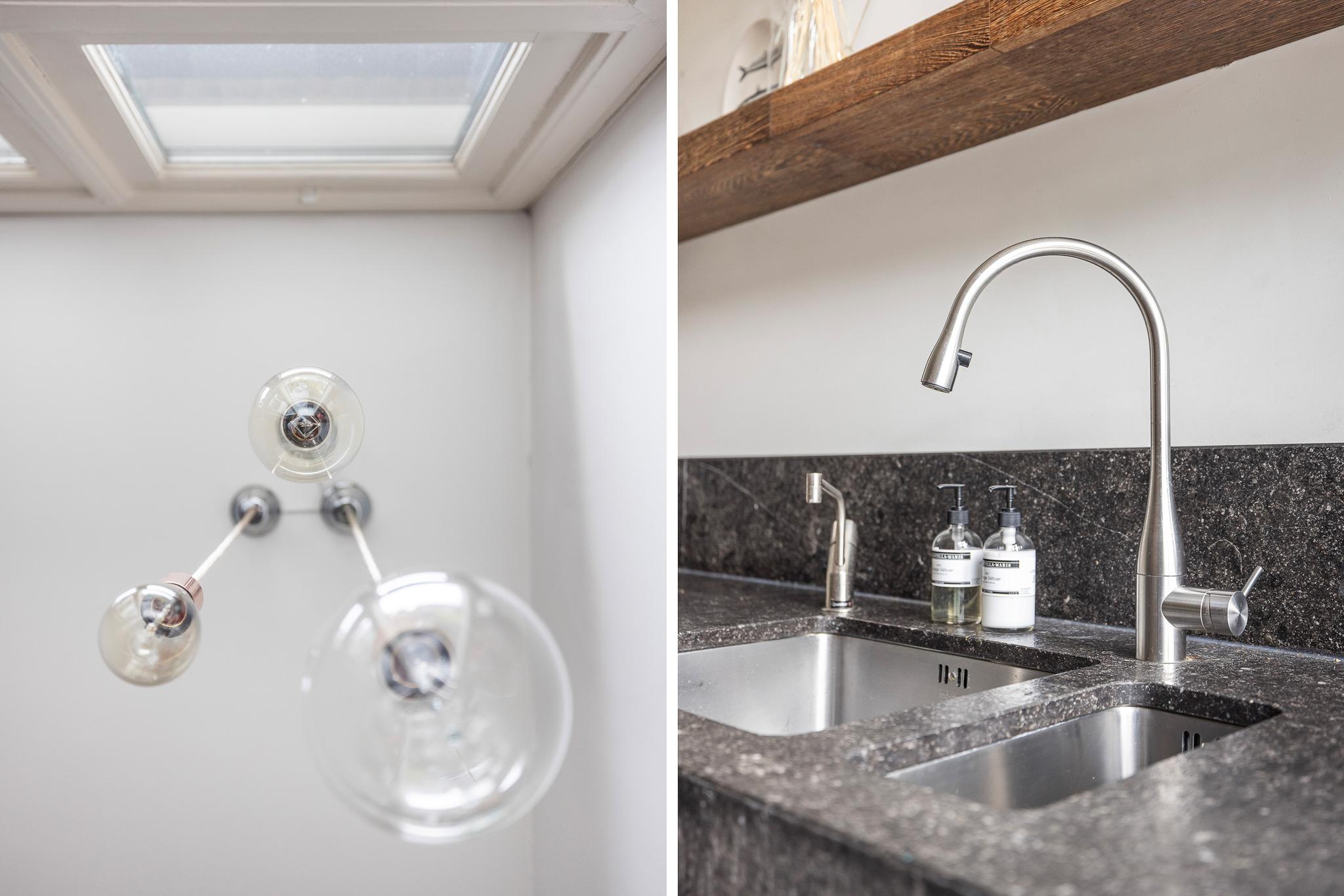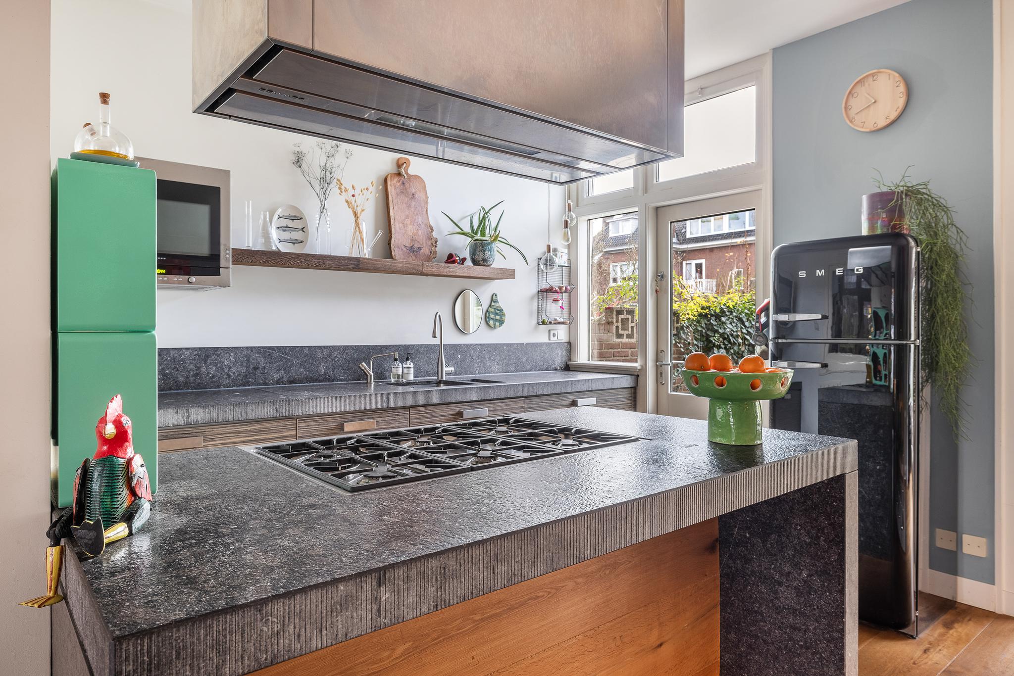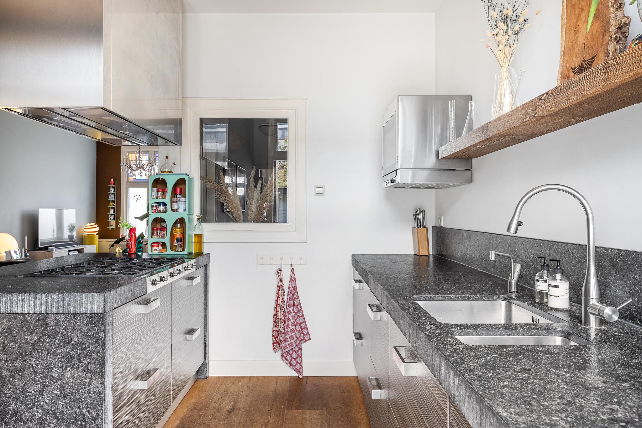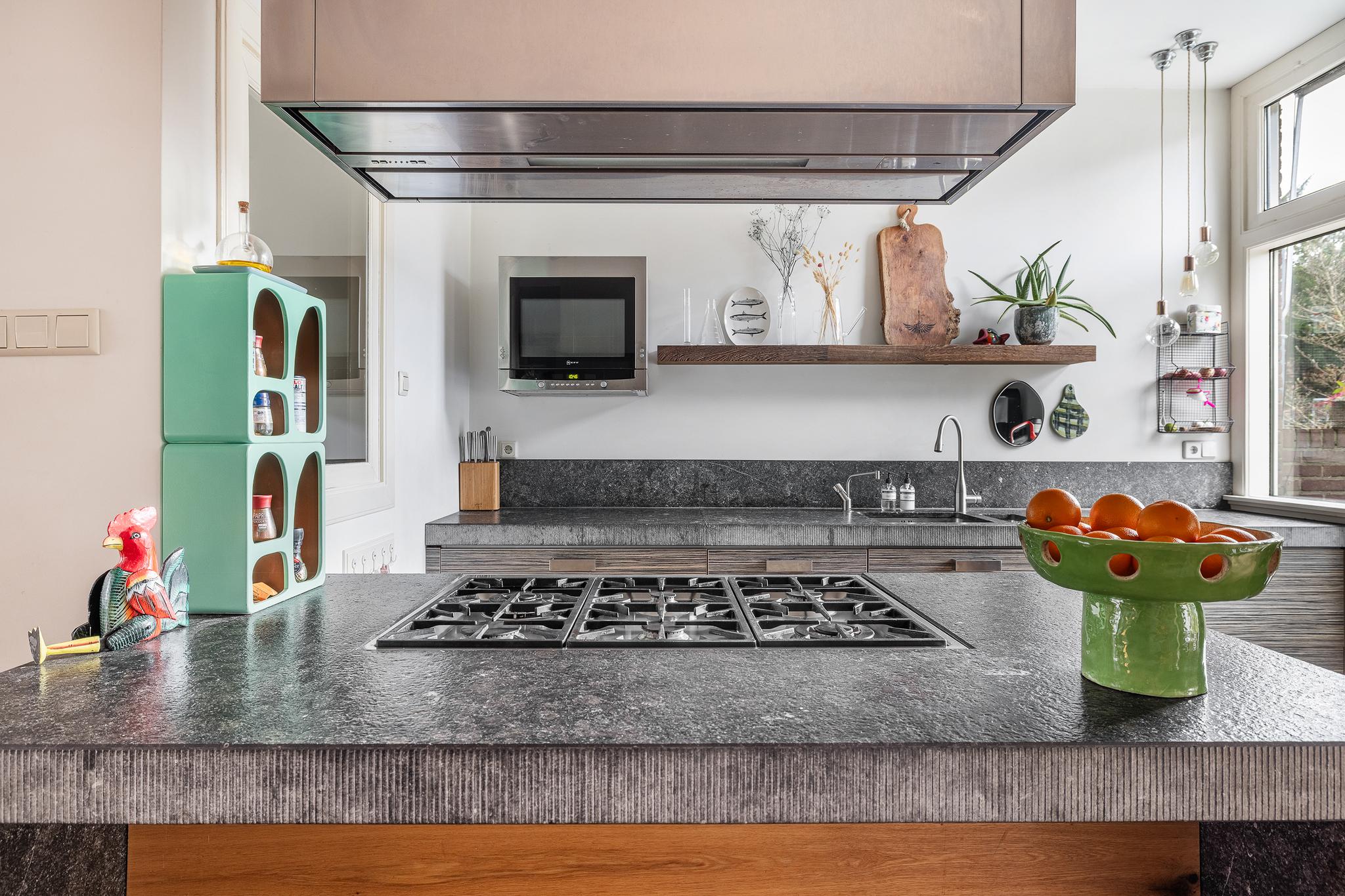 De open keuken met schiereiland vormt het hart van de kamer. De keuken is voorzien van een combi Quooker, 1,5 spoelbak, oven, 6 pits gaskookplaat, rvs afzuigschouw, vaatwasser en losse koelkast met vriezer van Smeg (past super bij de keuken en is ter overname). Het geheel is afgewerkt met een getrommeld en gebrand hardstenen blad met dikke gefrijnde rand.