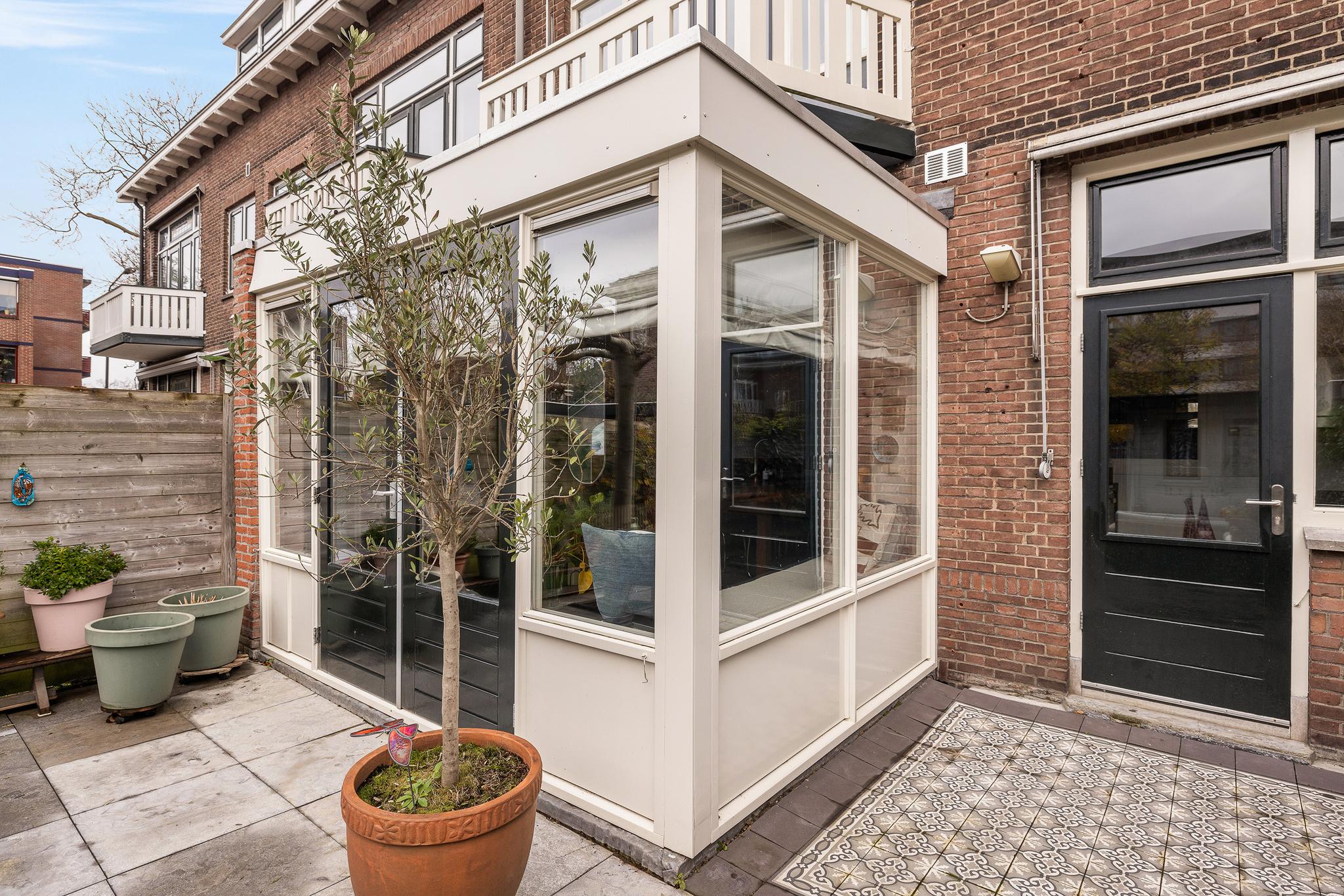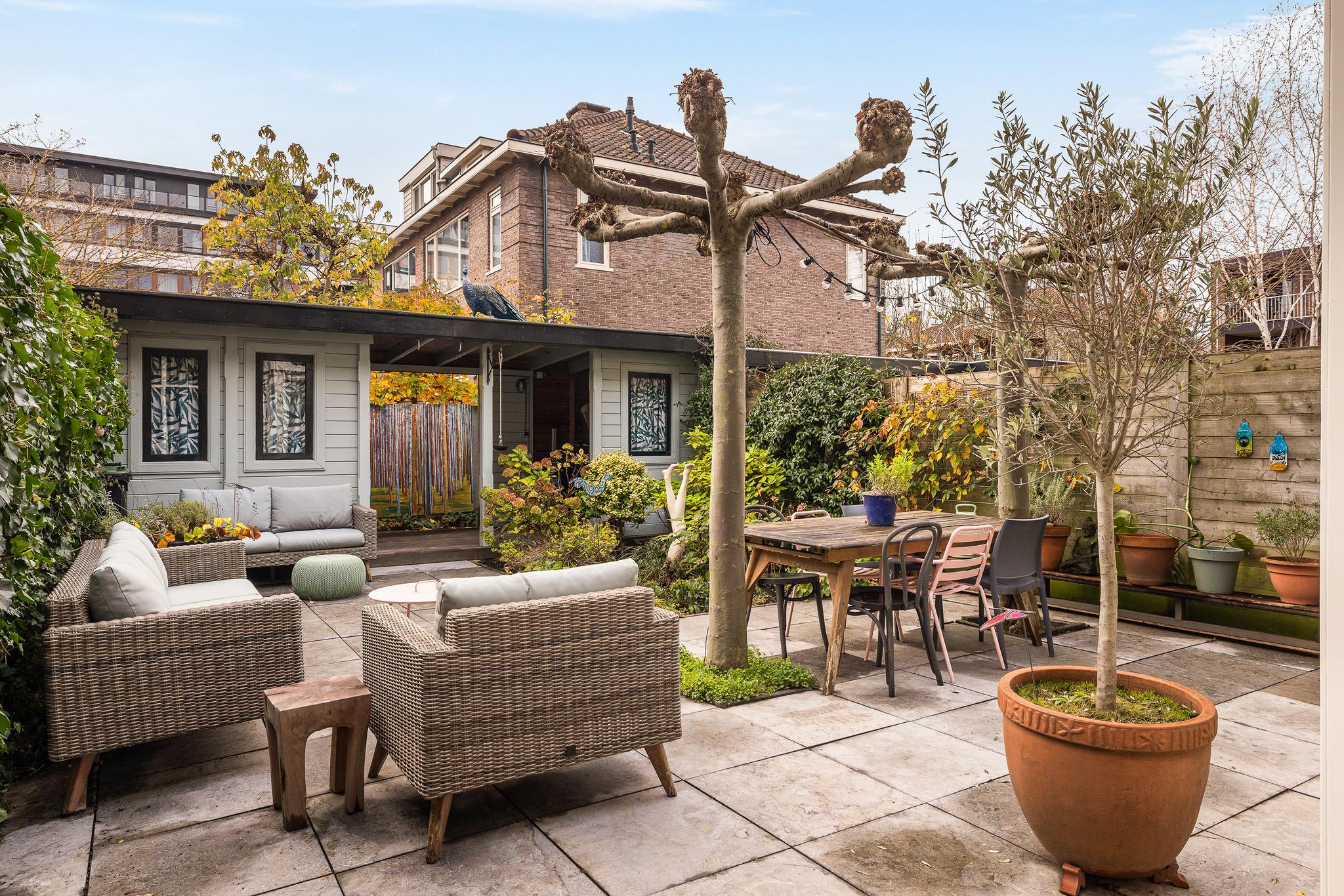 De achtertuin is voor binnenstadsbegrippen RIANT en heerlijk op het zuiden gelegen. Extra fijn: er is een achterom én een overkapping om fietsen en andere spullen droog te stallen.