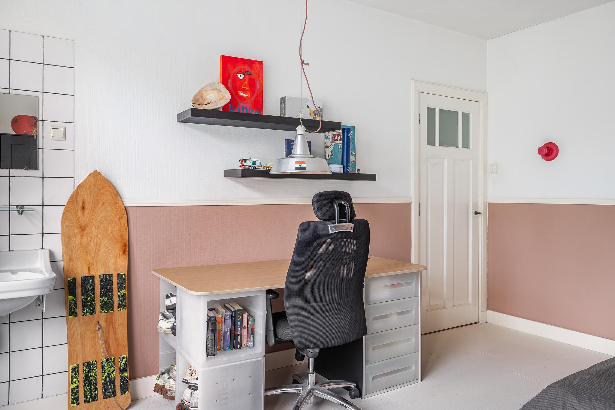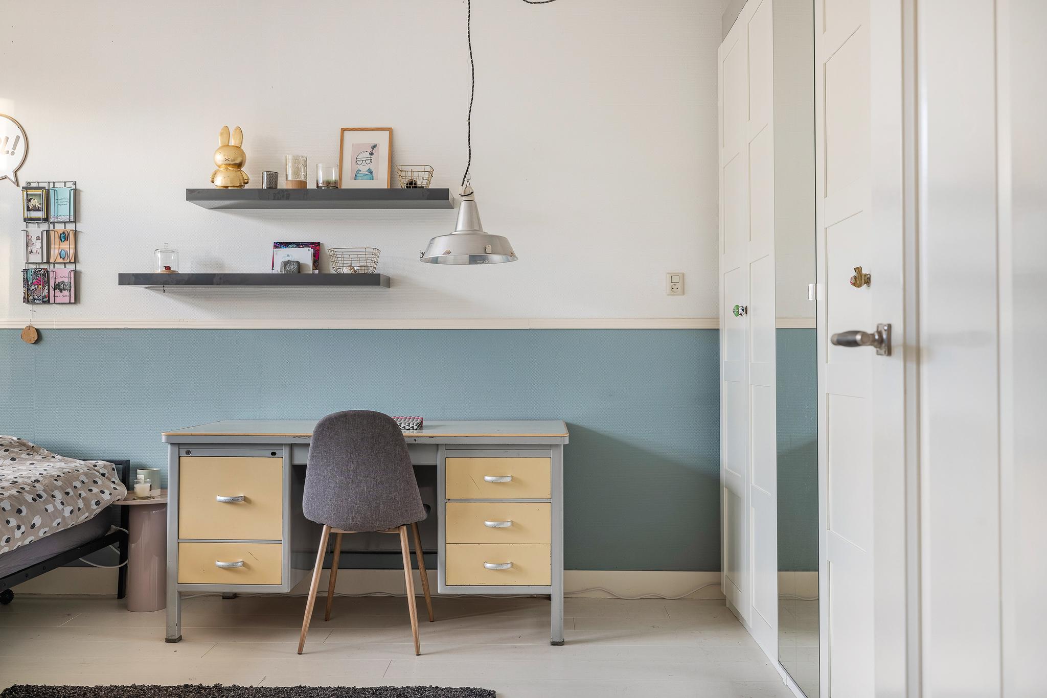 Slaapkamer 3 is gelegen aan de voorzijde van de woning met dakkapel en wanden met behang, de laminaatvloer is in 2024 nieuw gelegd.