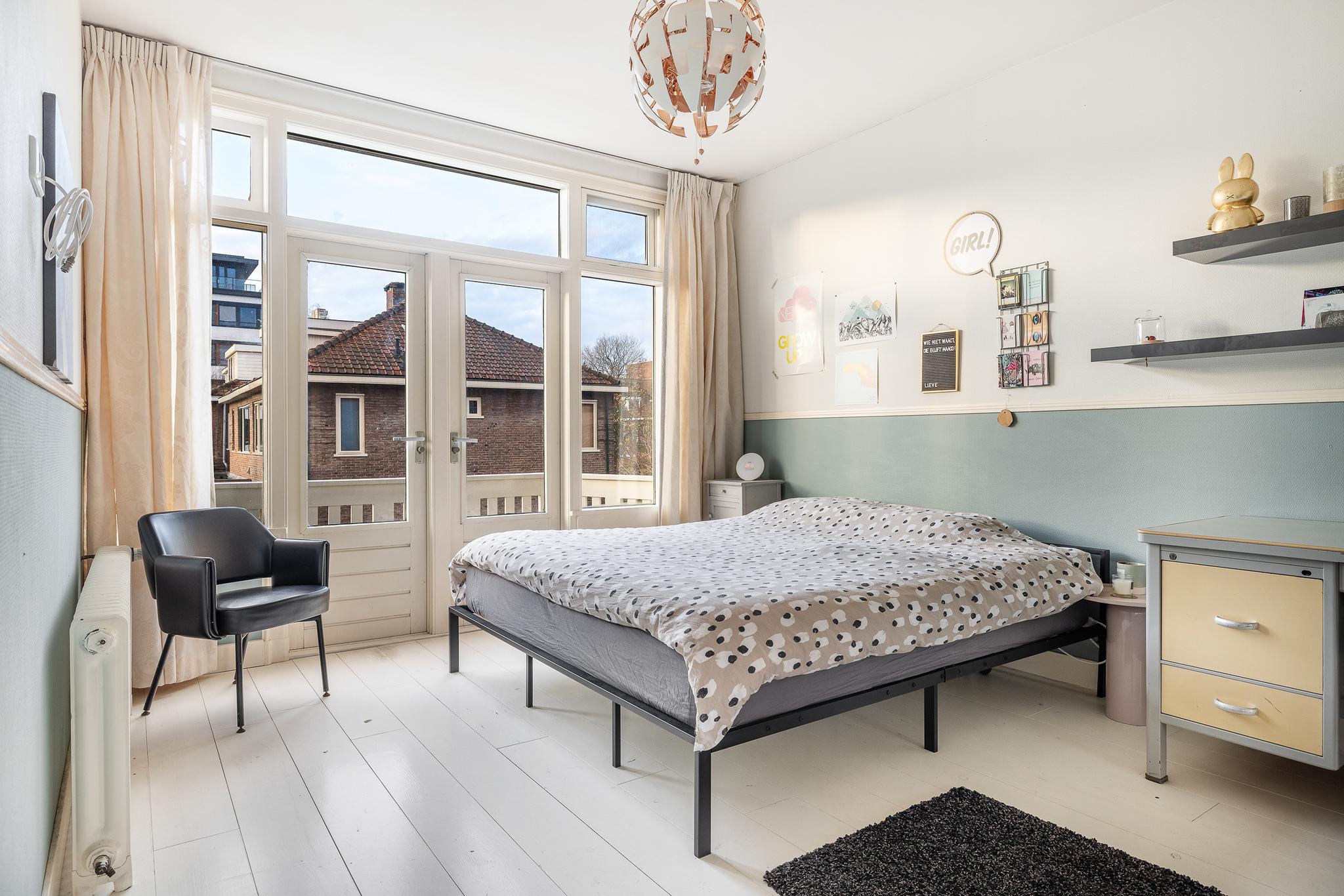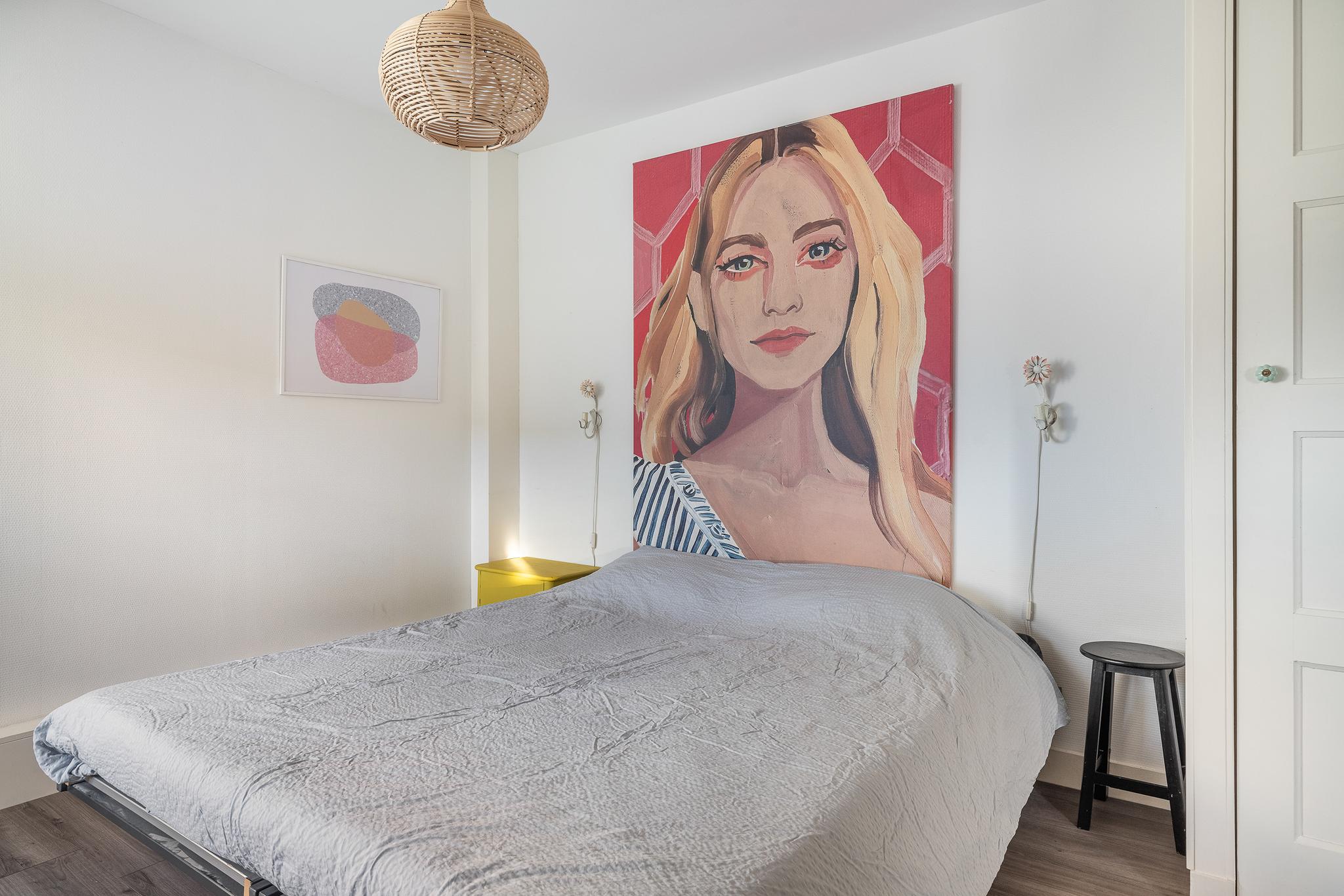 Slaapkamer 2, deze is gelegen aan de achterzijde van de woning, ook hier een houten vloer en openslaande deuren naar het balkon.