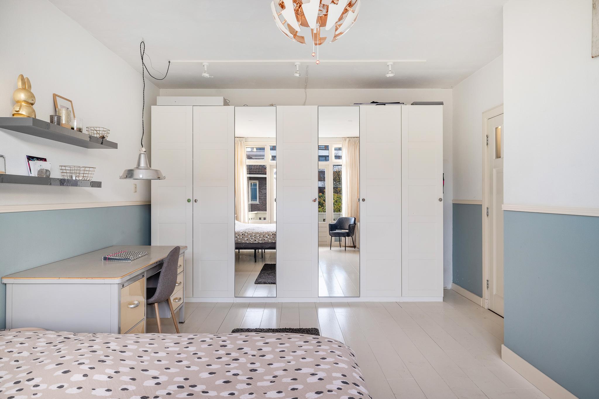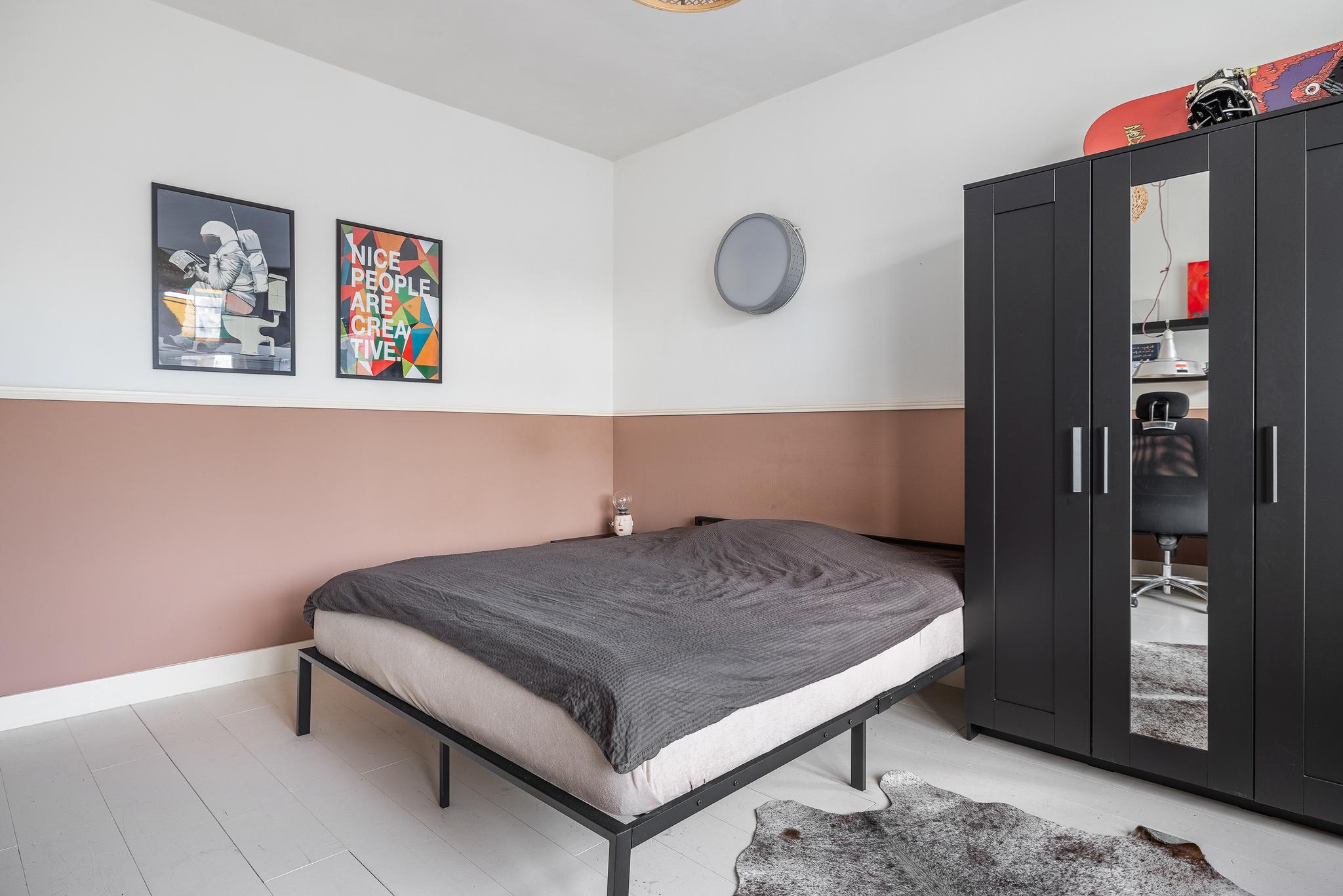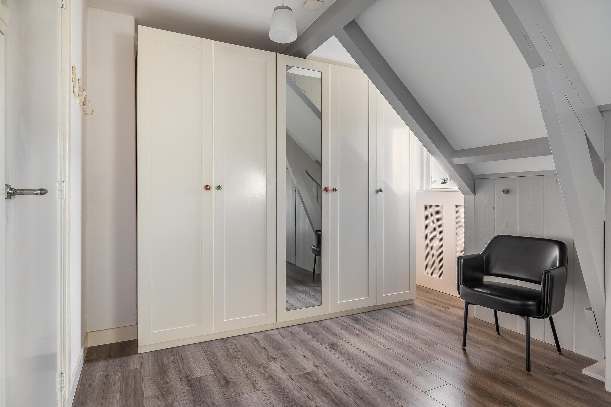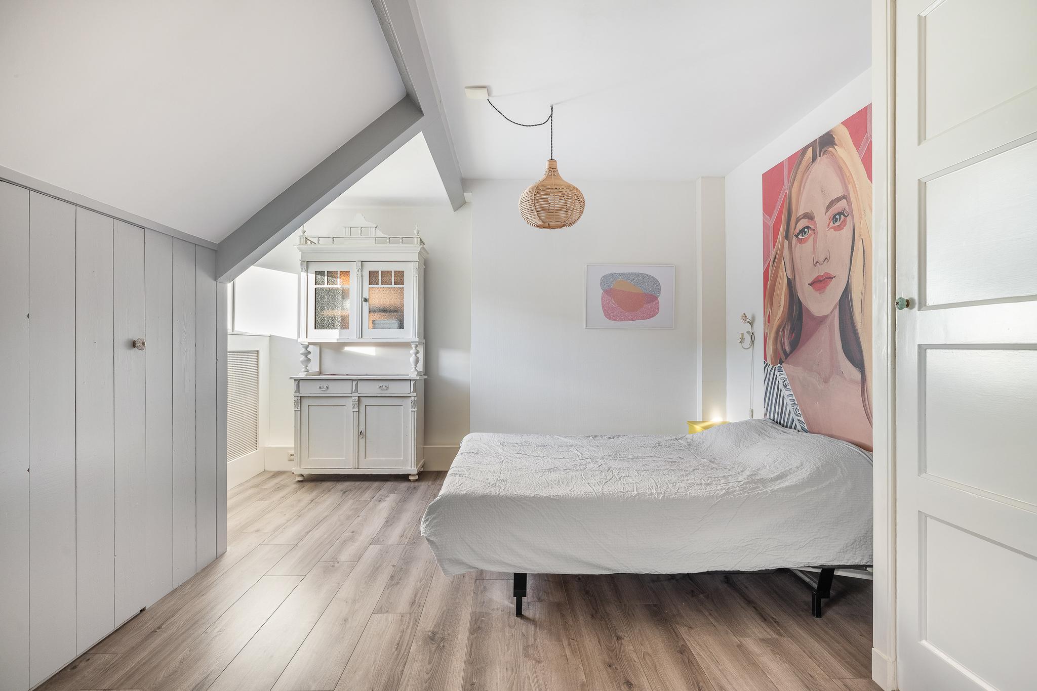 Slaapkamer 5, deze grote en pandbrede slaapkamer is gelegen aan de achterzijde met vaste kasten onder schuin dak en vaste kledingkasten.