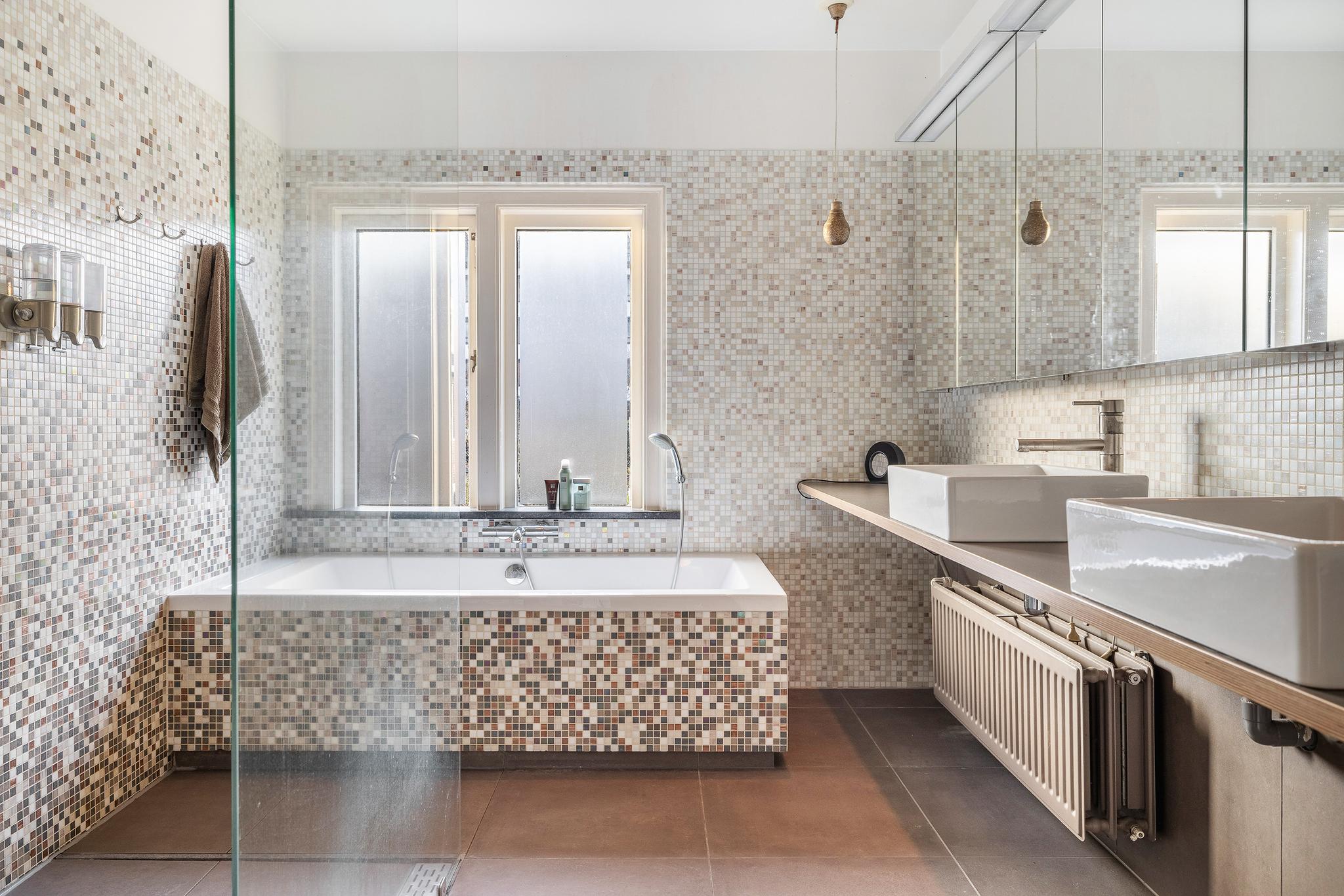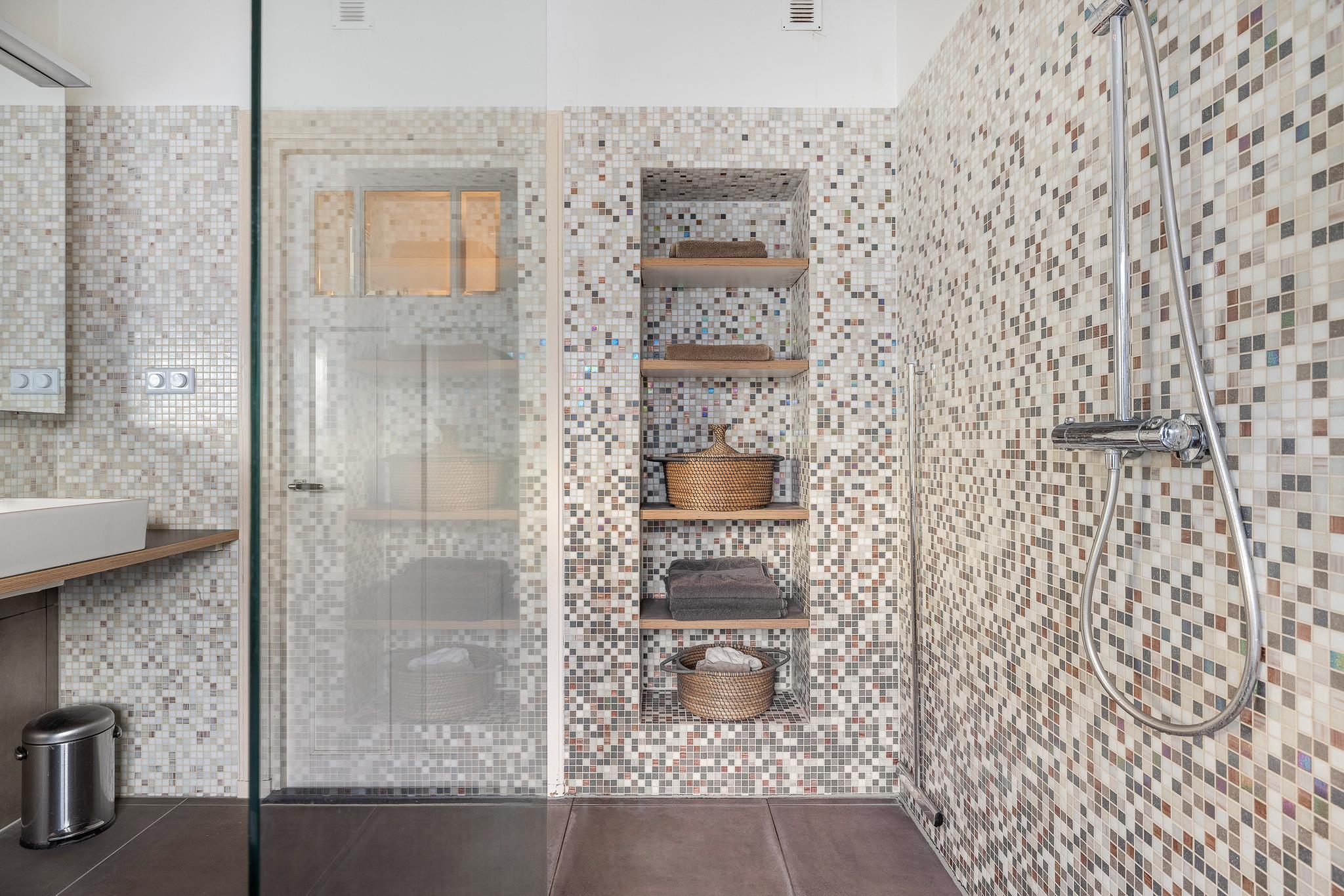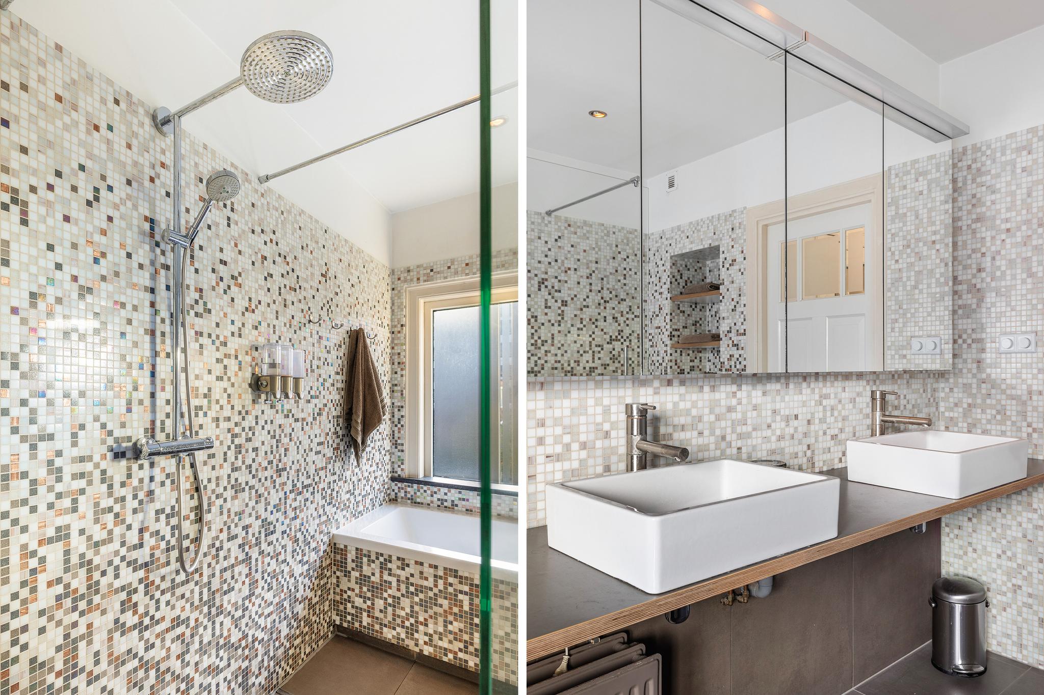 Heerlijk grote badkamer met enorme inloopdouche en regendouche, bad (beide met thermostaatkraan), Blad met dubbele wastafel en verlaagd plafond met spots.
