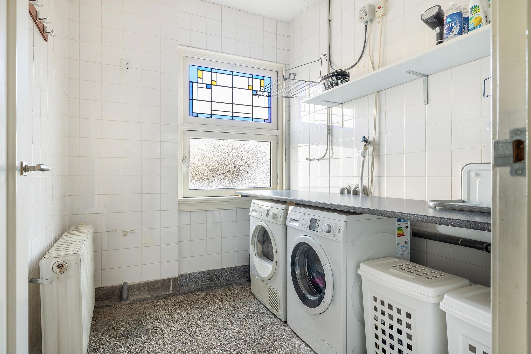 Daarnaast (aan de voorzijde) is een fijne wasruimte gecreëerd met genoeg ruimte voor alle wasapparatuur. Ook deze beschikt weer over deels glas-in-loodramen.