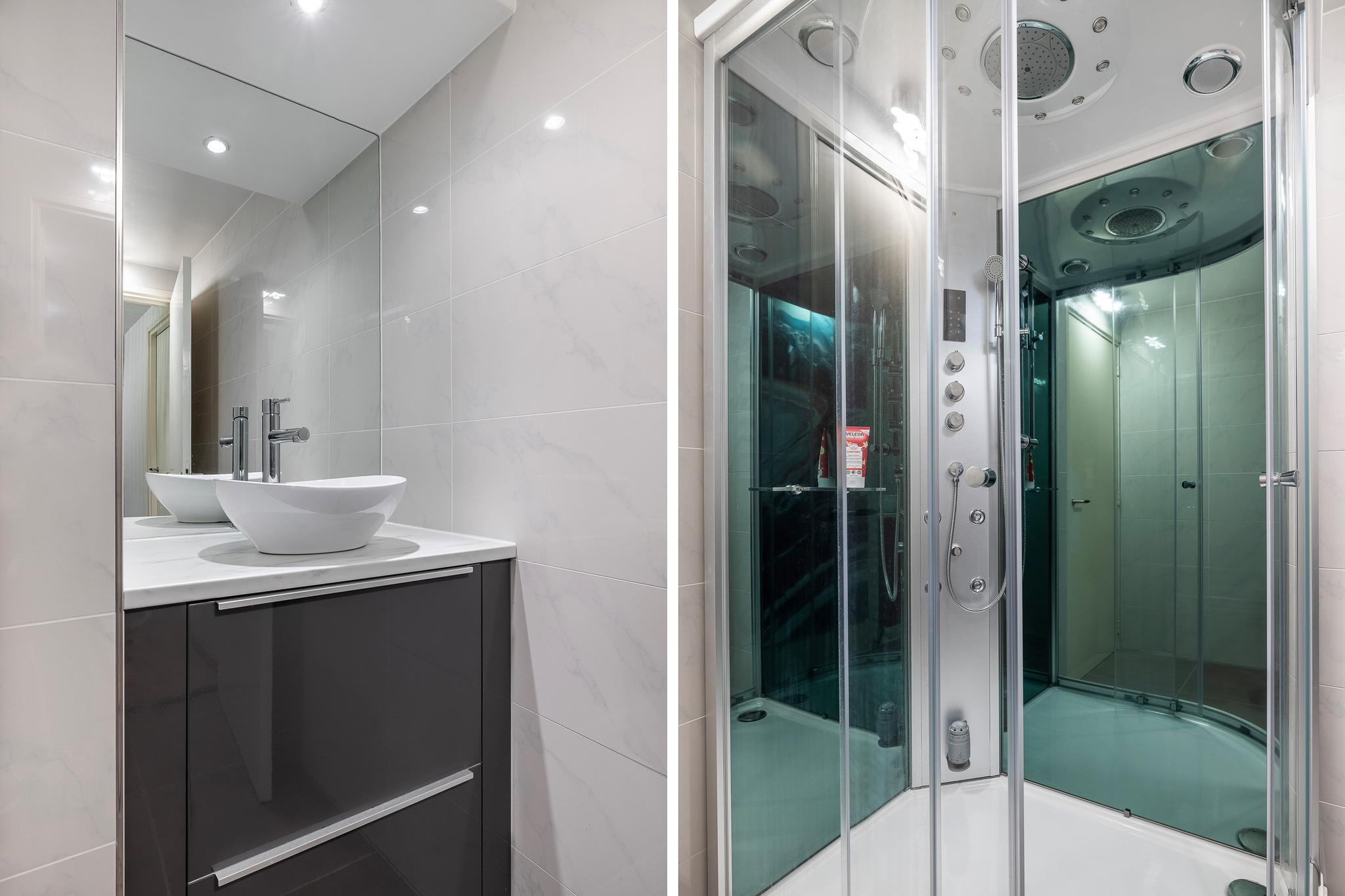 Badkamer met 1/4 ronde douchehoek/stoomcabine, waskom en meubel. In een aparte ruimte van de badkamer is de CV ketel weggewerkt (merk Vaillant, bouwjaar 2022).