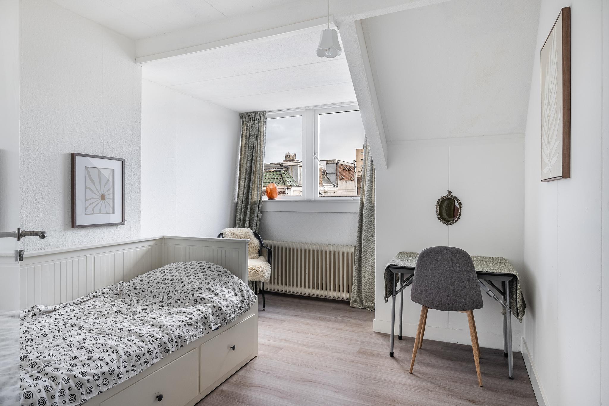 Slaapkamer 4, ook gelegen aan de voorzijde met vaste kast, dakkapel, wanden met behang en laminaat vloer.