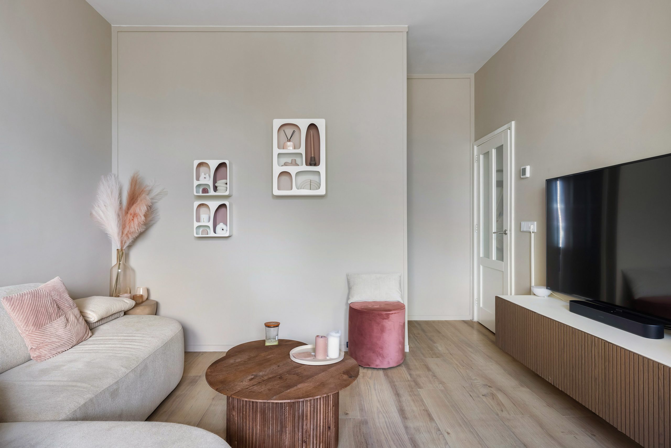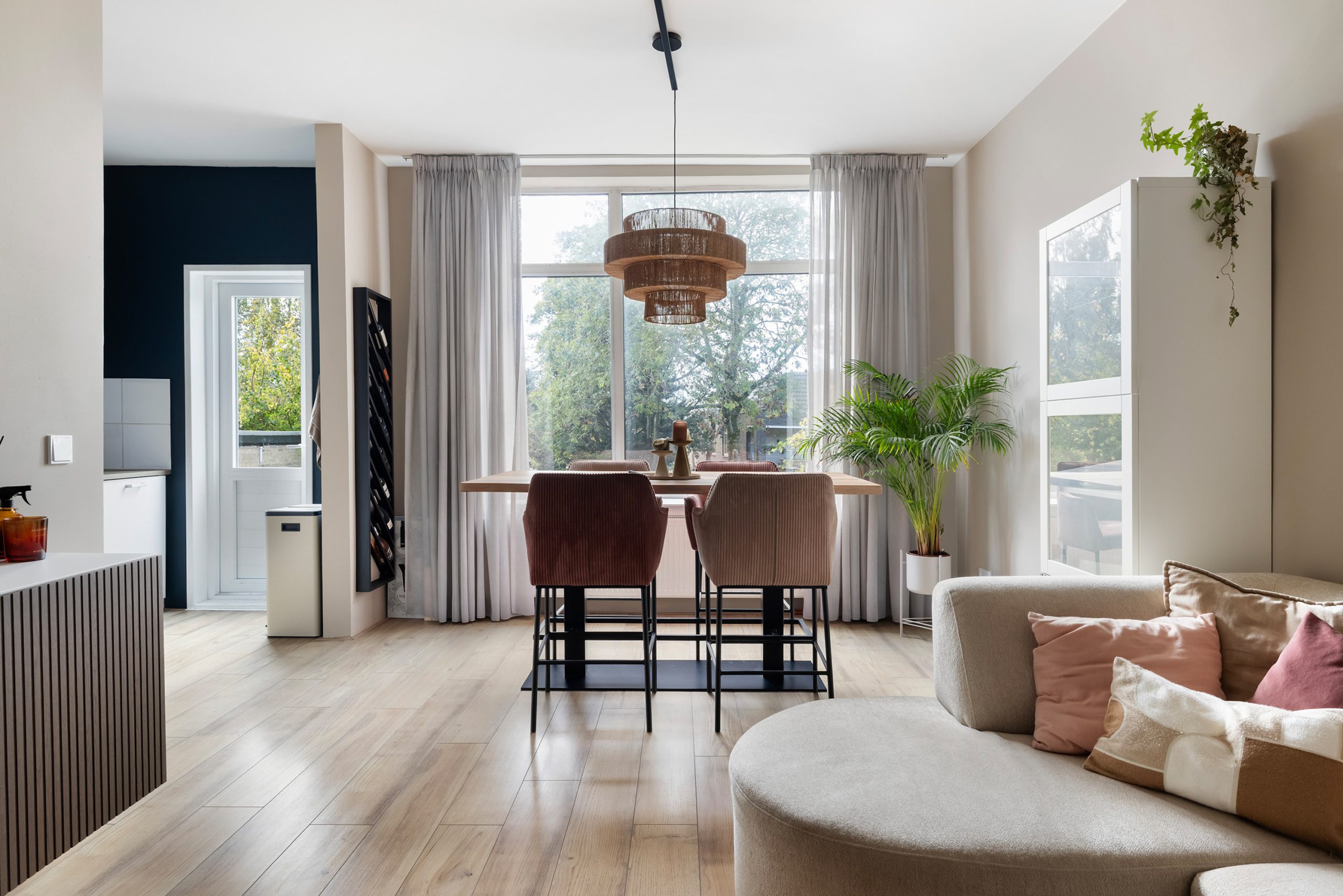 De woonkamer is gelegen aan de achterzijde, met open keuken en toegang tot het royale dakterras. De woonkamer is voorzien van een laminaatvloer, stucwerk wandafwerking, kunststof kozijnen en een deur naar het dakterras.