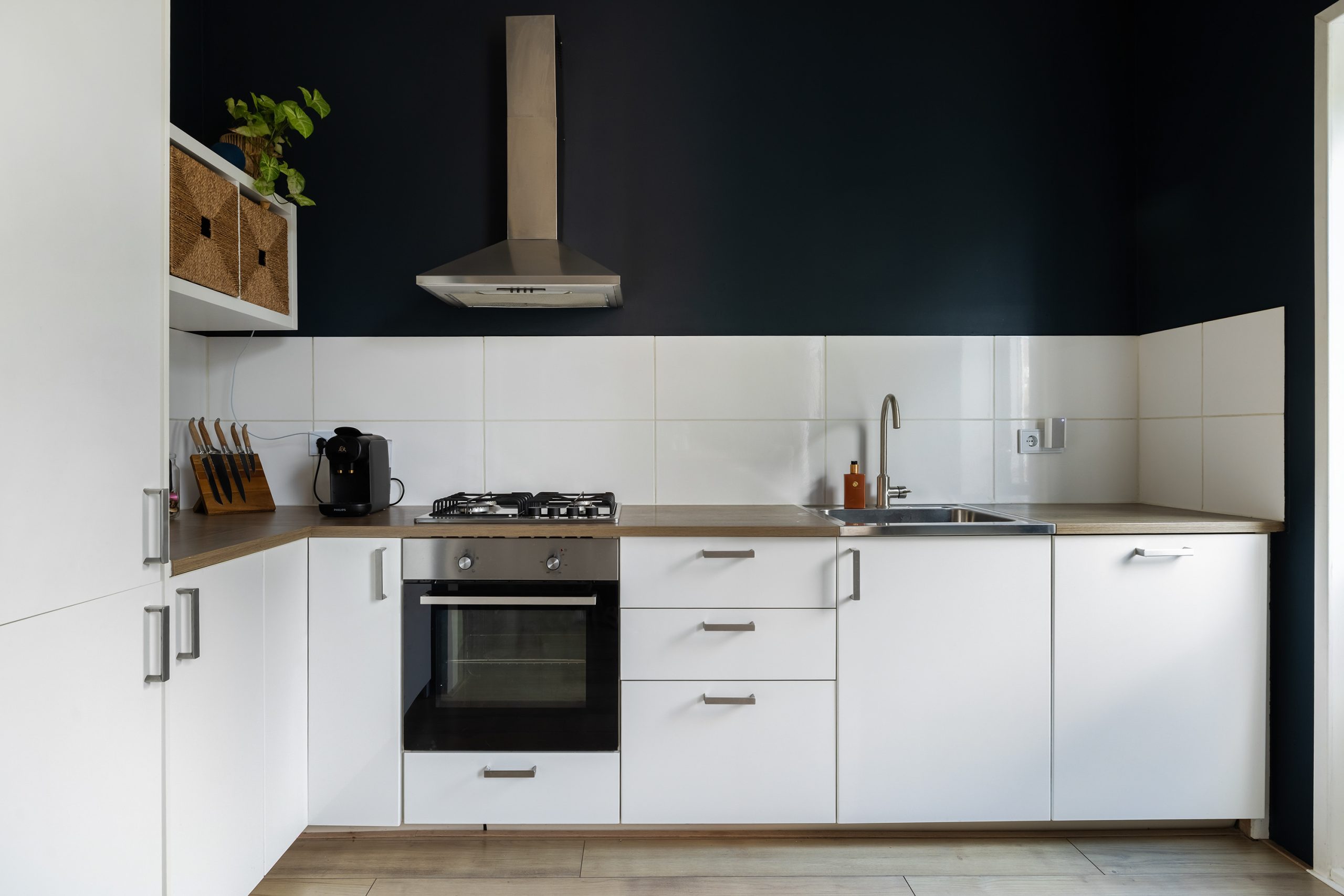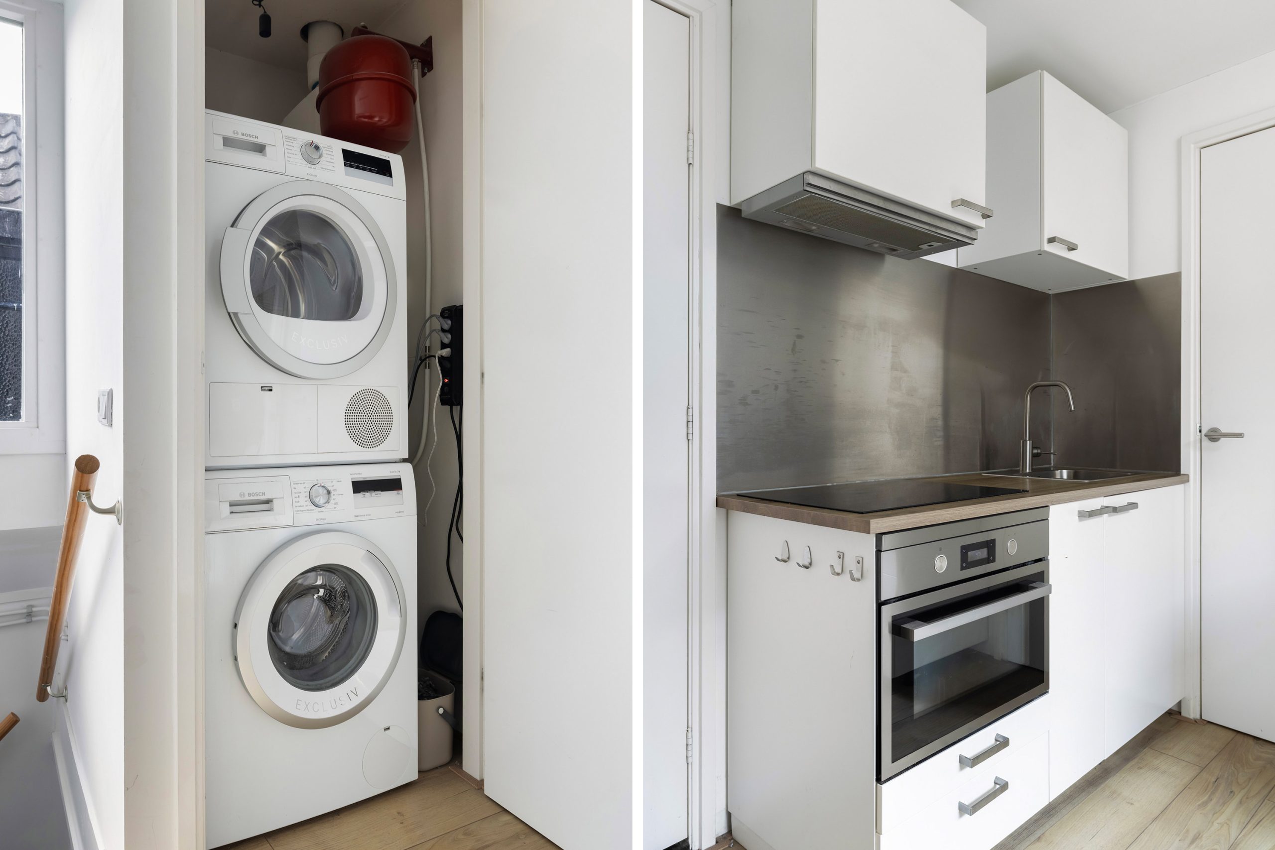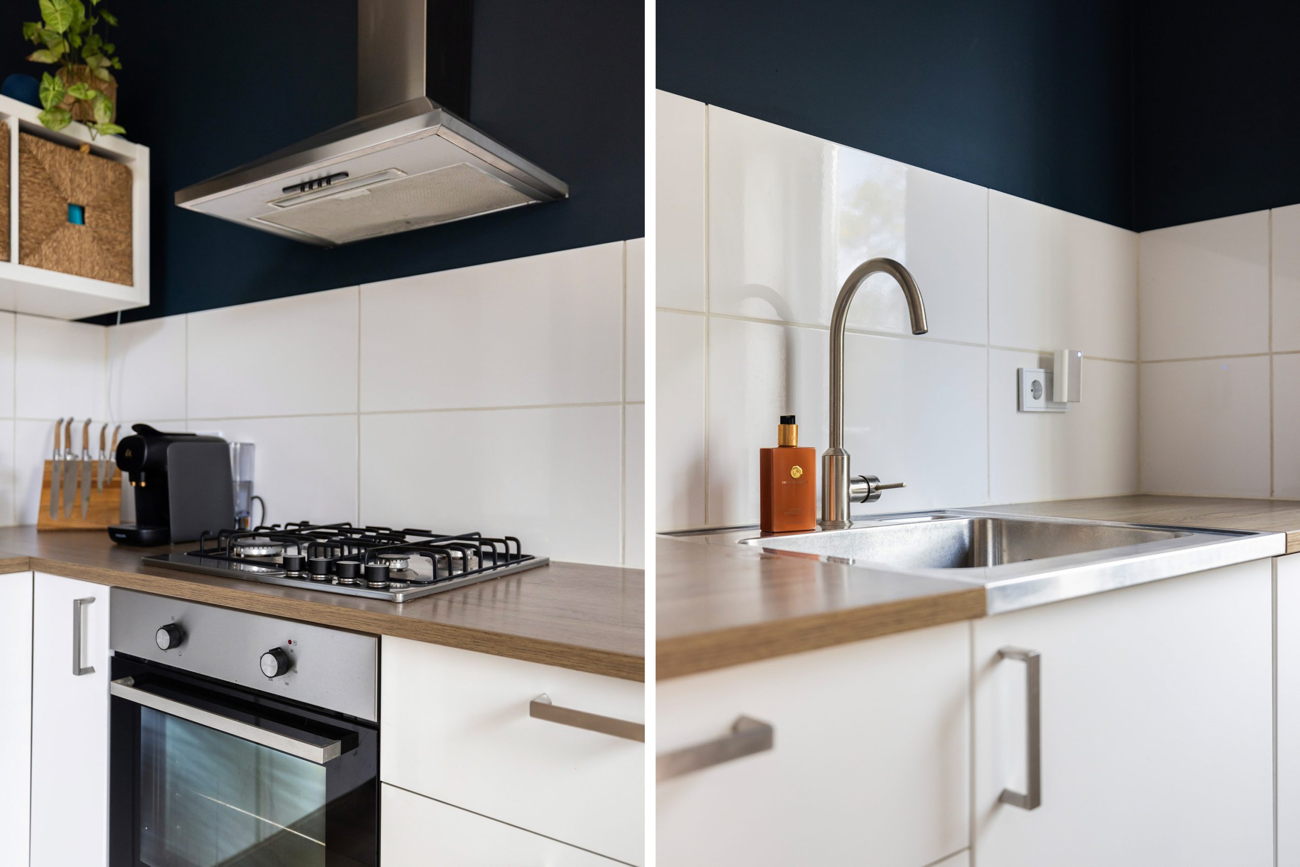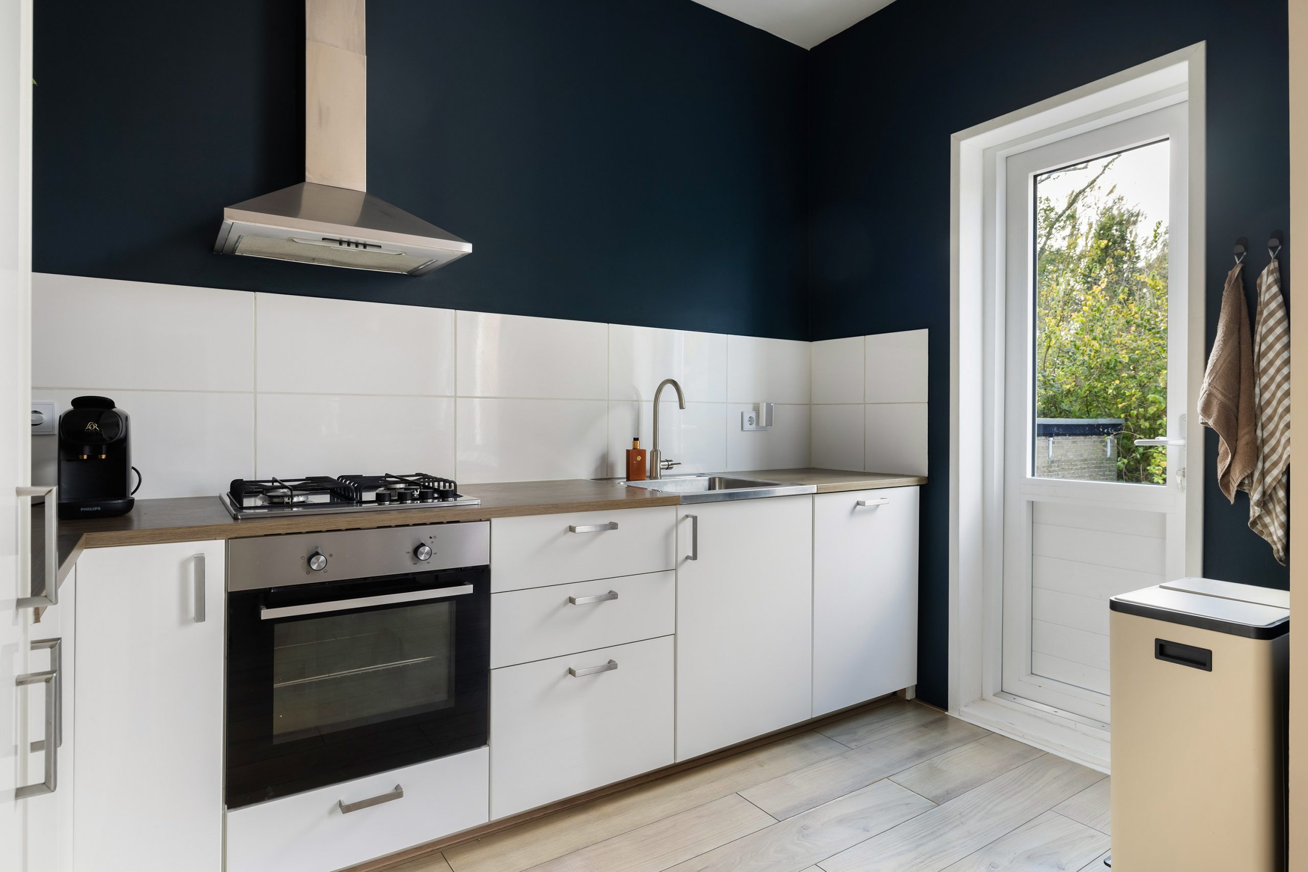 De keuken bestaat uit een wandopstelling met apart kastendeel en is voorzien van een spoelbak, 4 pits elektrische kookplaat, afzuigkap, oven, koel/-vriescombinatie en bergruimte. Tevens bevindt zich hier een kast met opstelplaats CV-ketel (Remeha Tzerra, 2016) en wasmachine aansluiting.