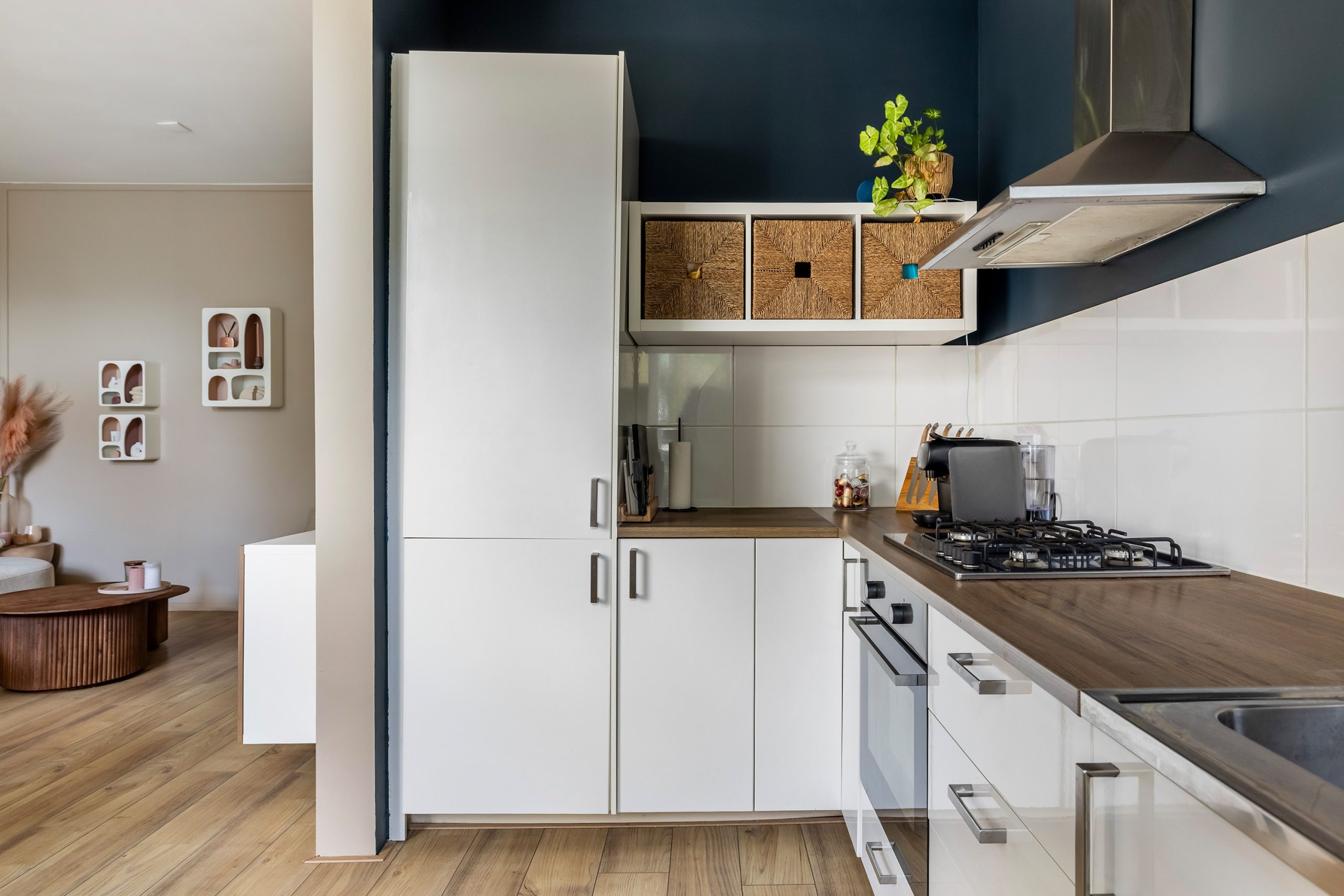 De moderne open keuken in L-opstelling is voorzien van een 4-pit gaskookplaat, afzuigkap, oven, koel/-vriescombinatie en een vaatwasser.