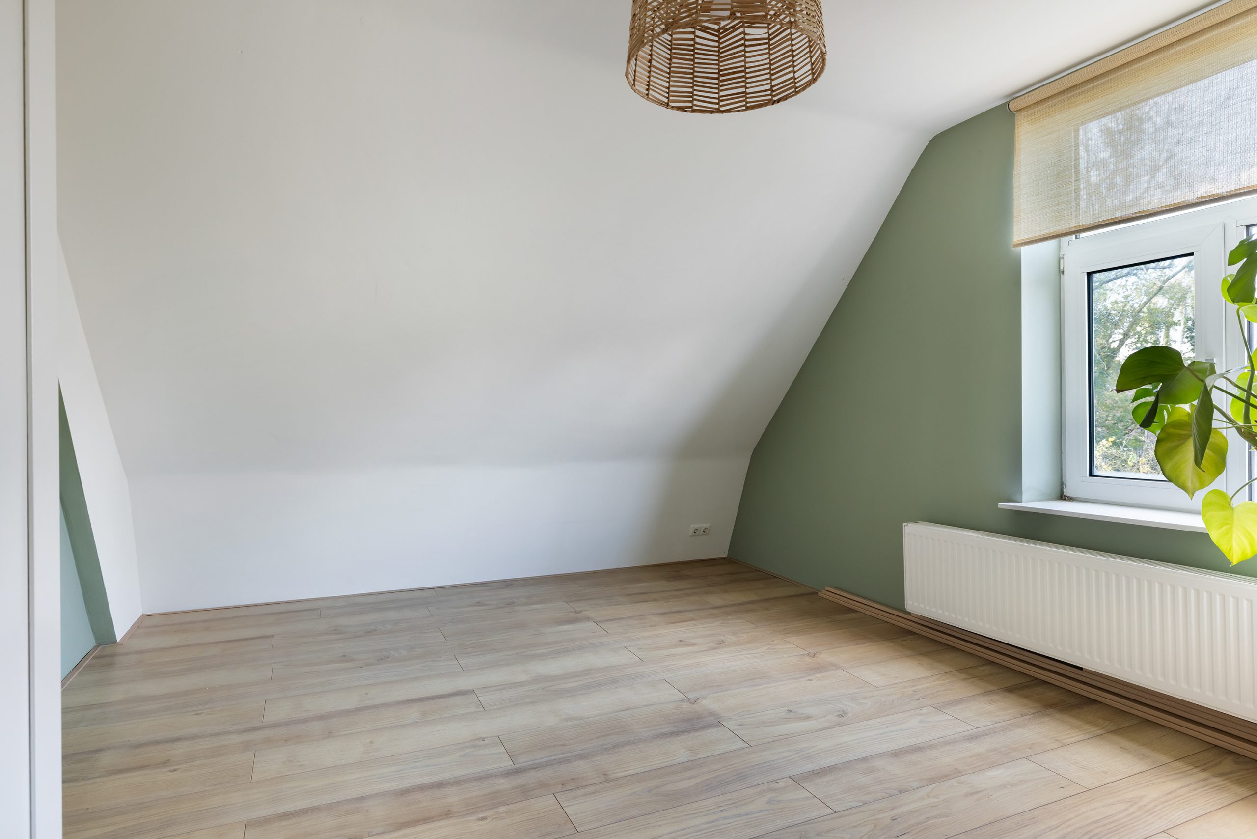 Ruime slaapkamer aan achterzijde, voorzien van kunststof kozijnen en afgewerkt met een laminaatvloer.