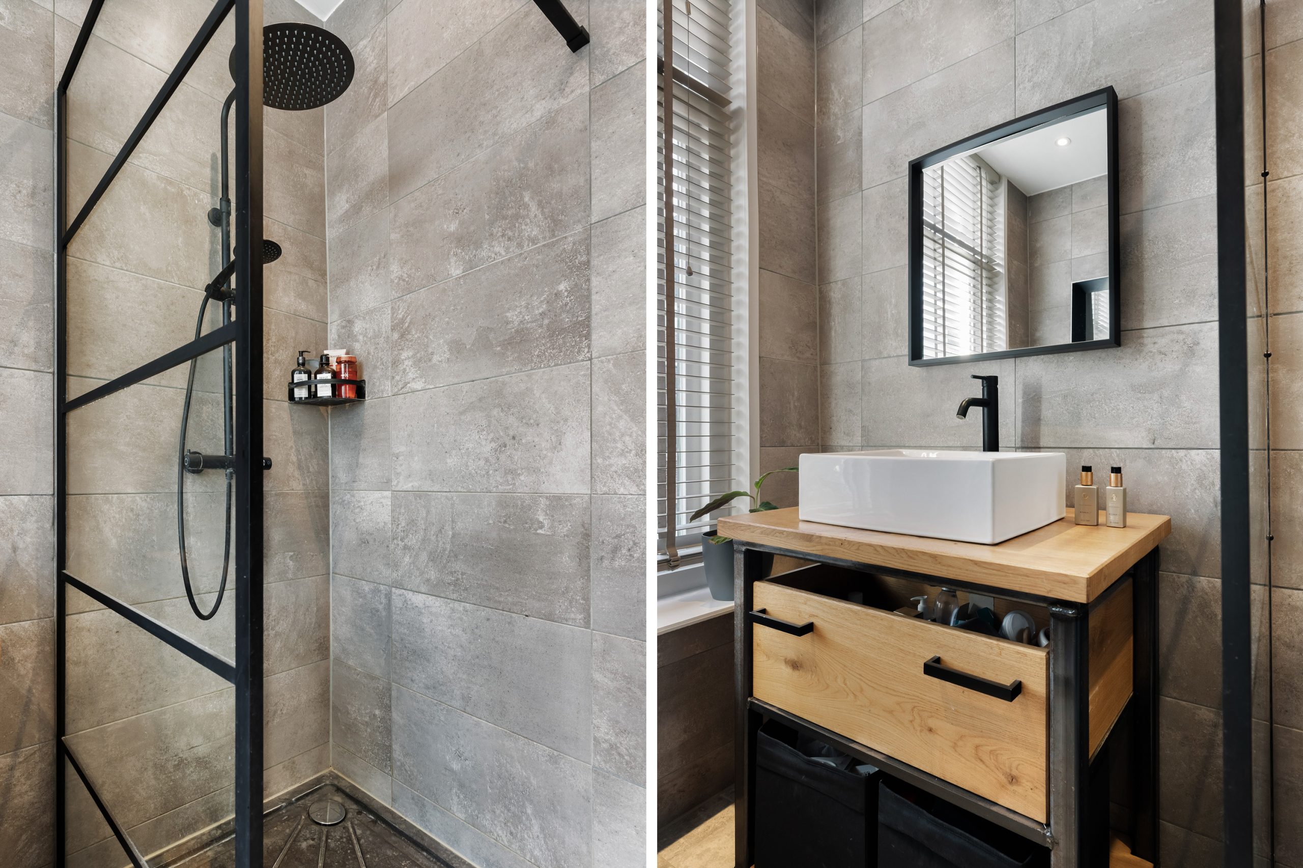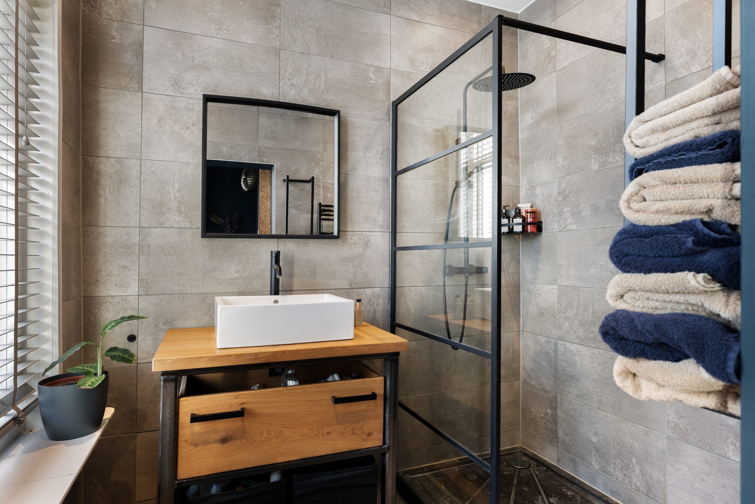 De badkamer is volledig betegeld en beschikt over een inloopdouche met thermostaatkraan en regendouche en een wastafelmeubel.