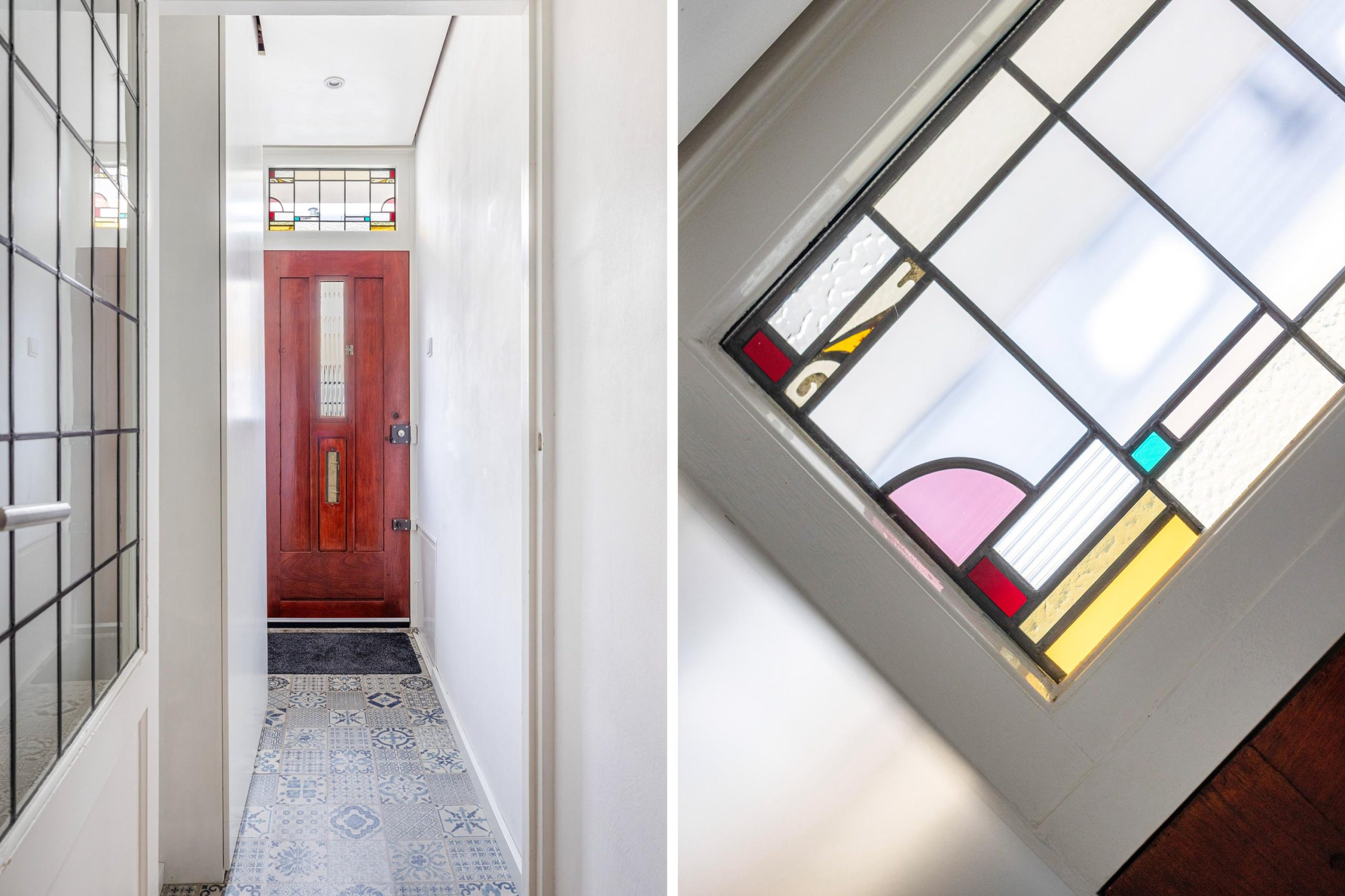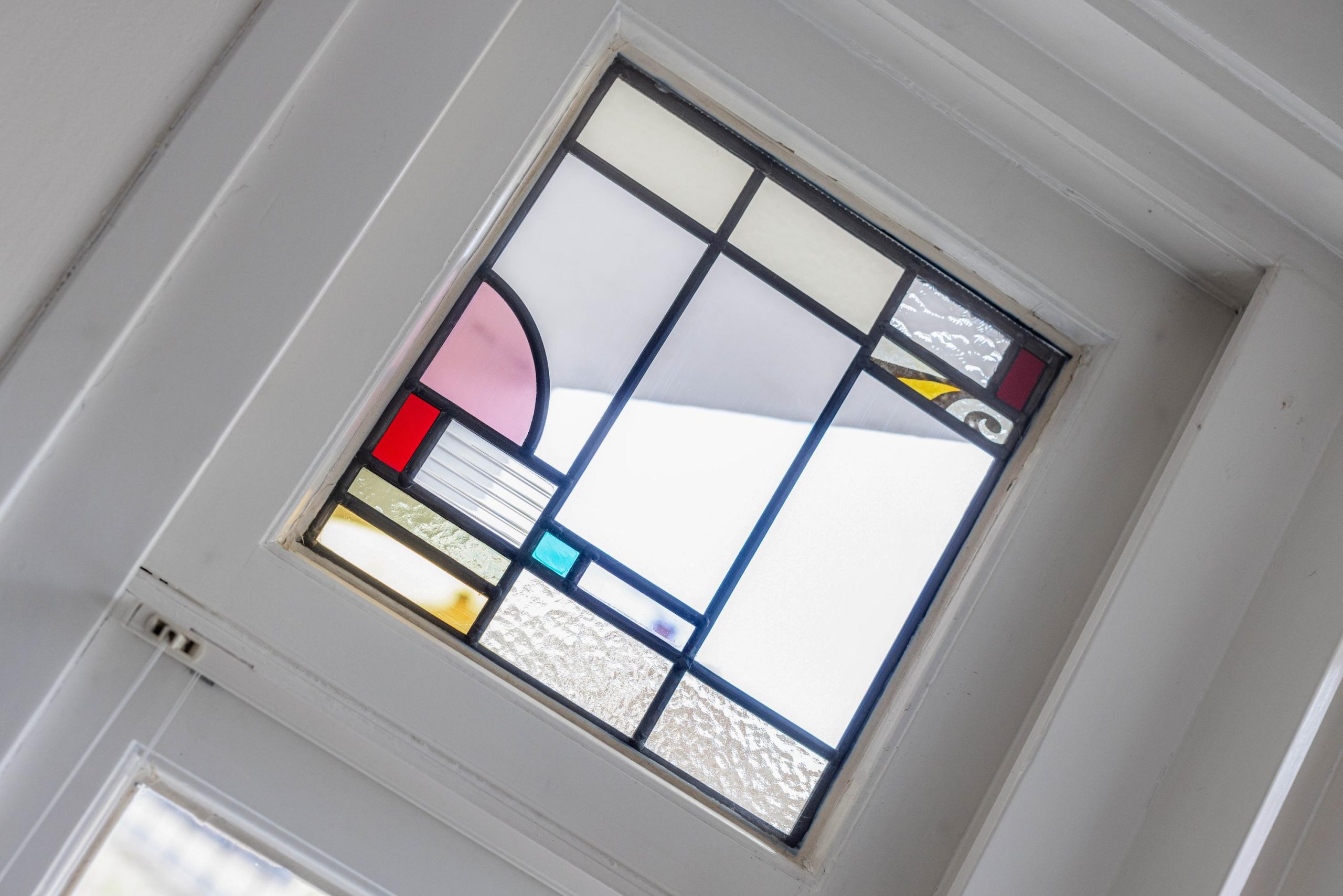 Je betreedt de woning in de vestibule met kleurrijk glas-in-lood boven de voordeur, tussendeur met glas in lood naar de hal.