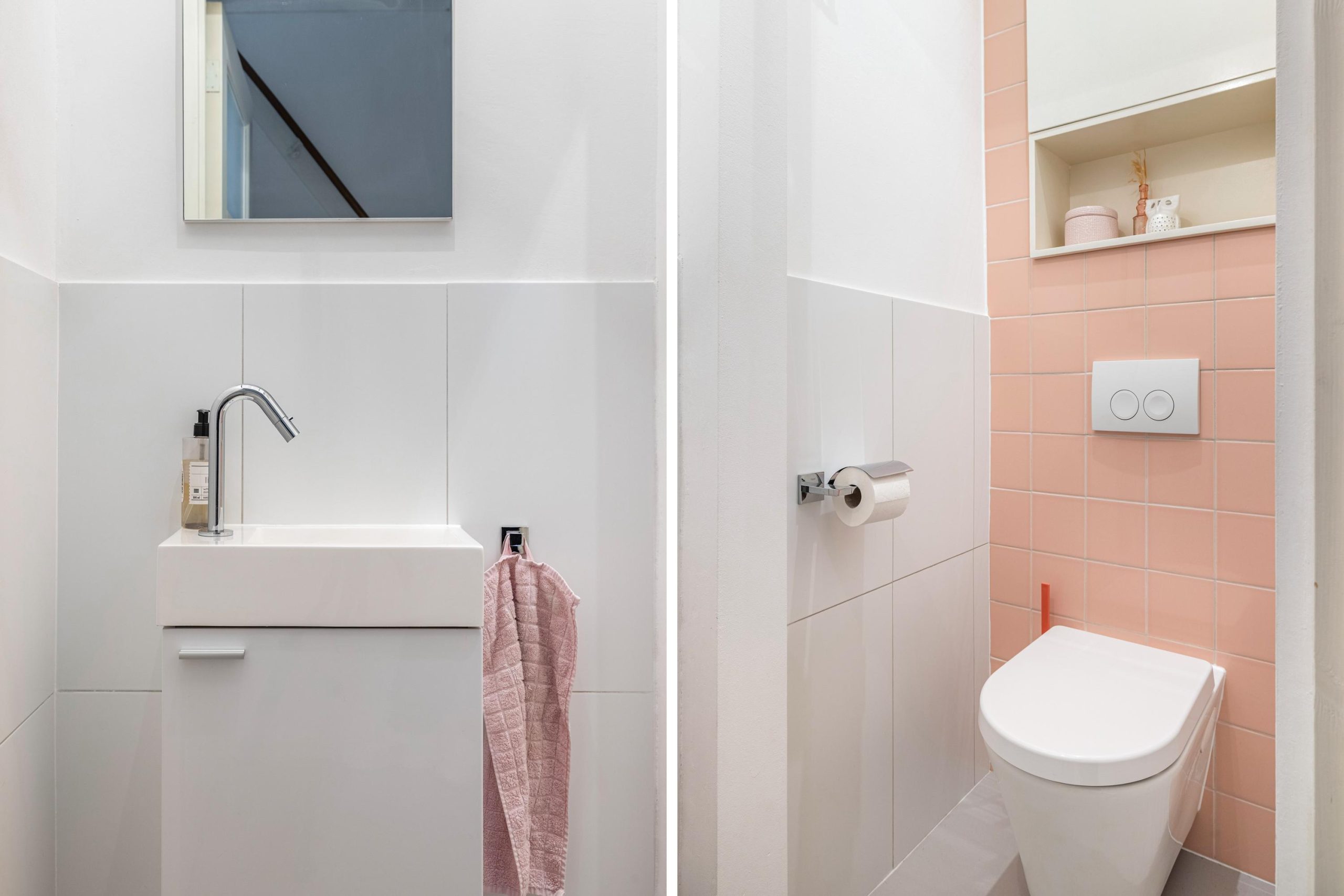Toilet (half betegeld), wandcloset en wasbakje op meubel.