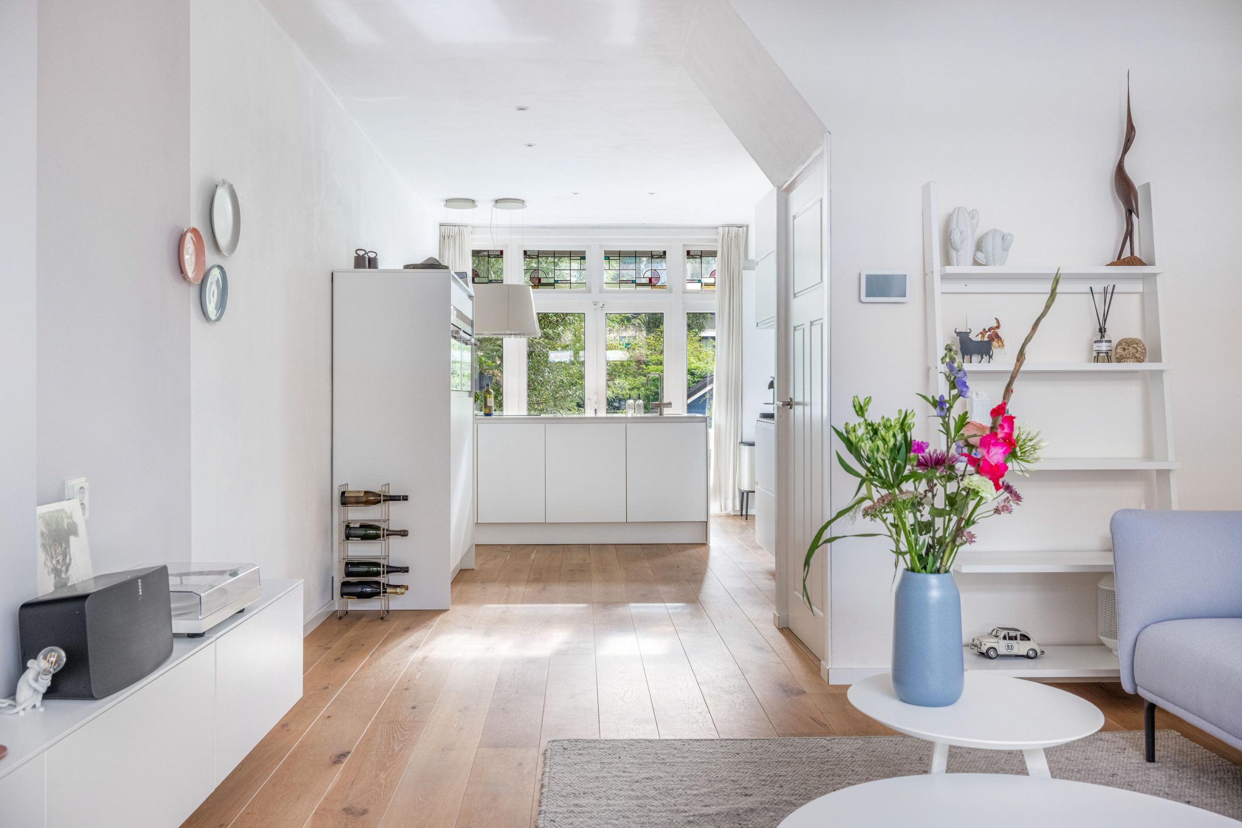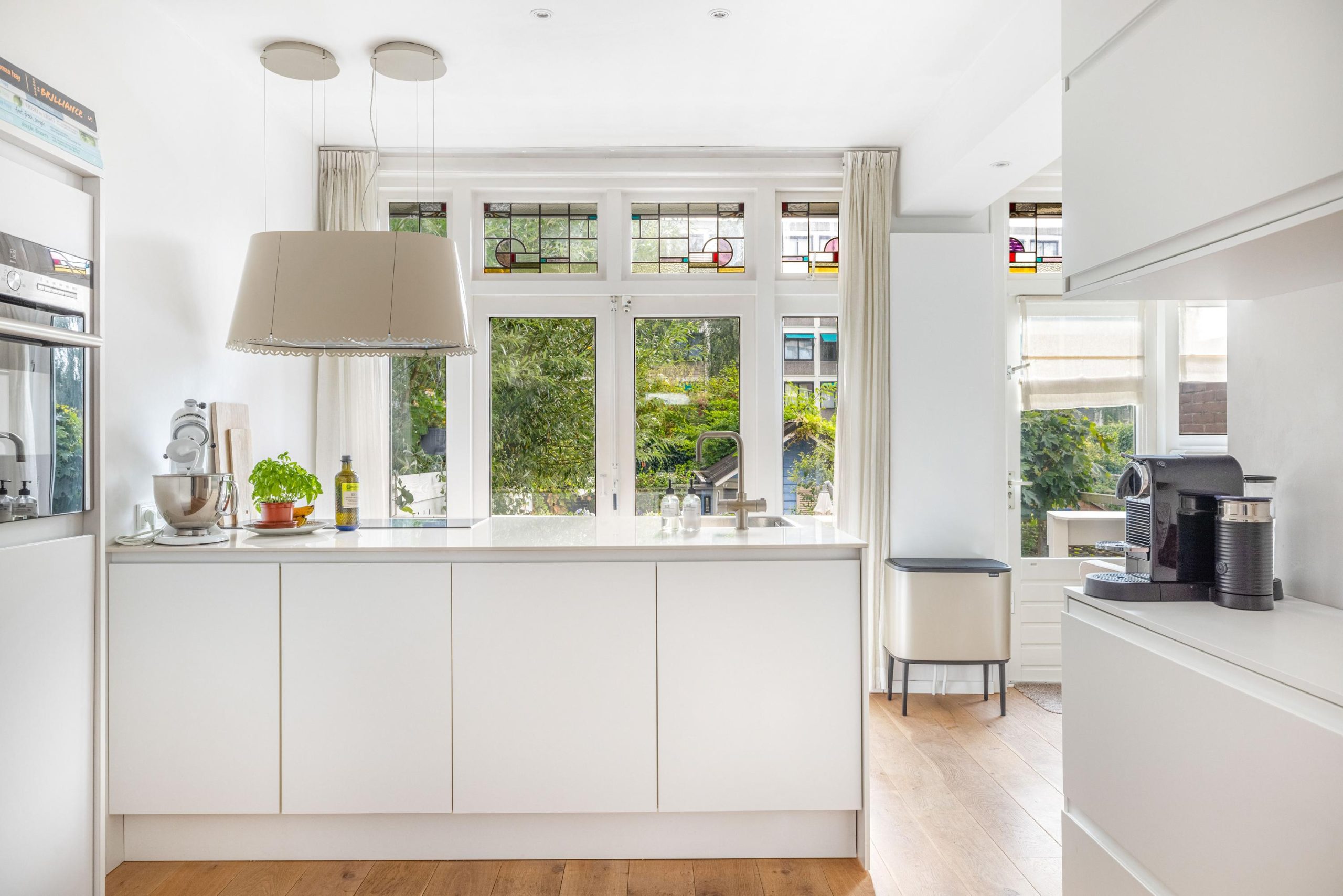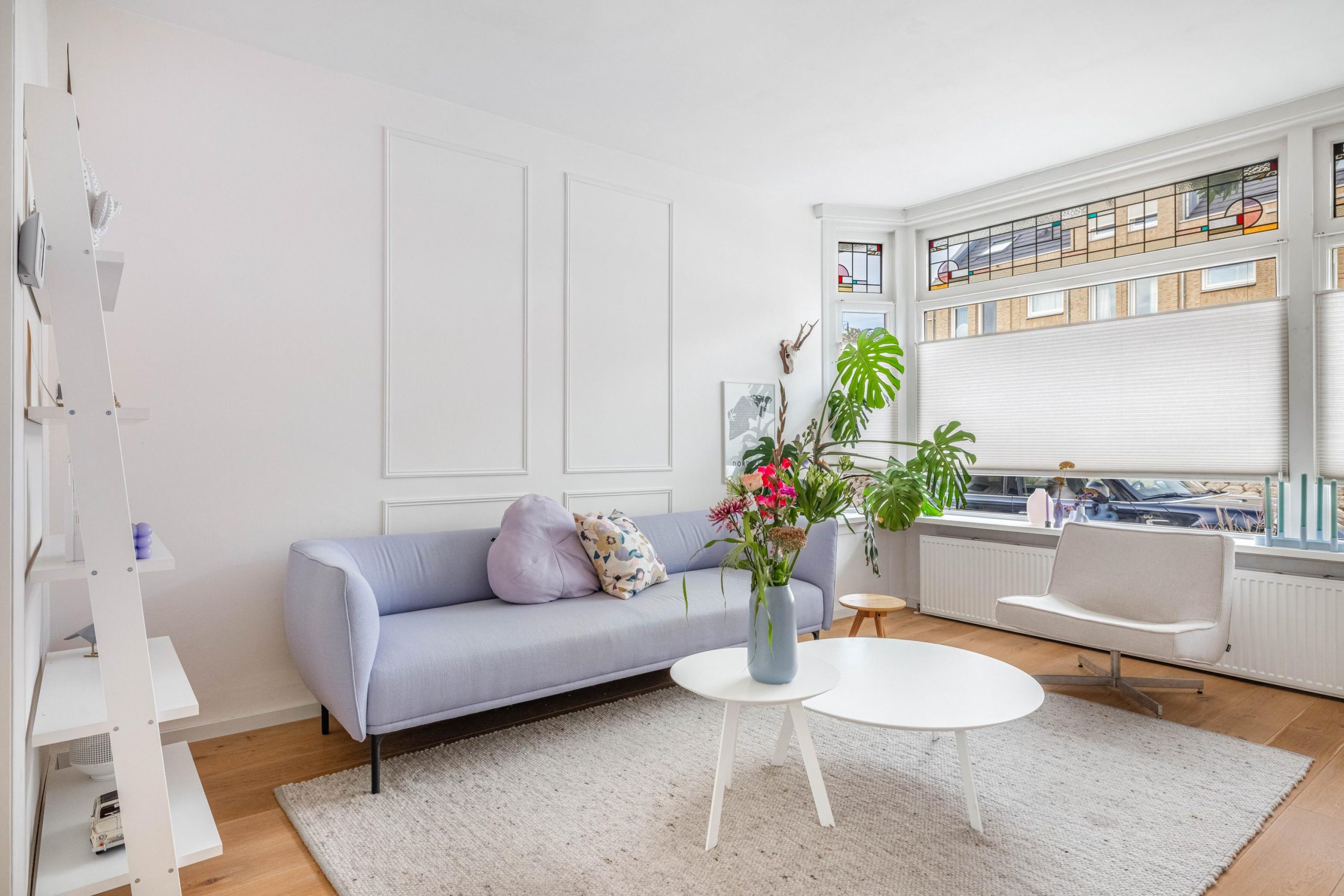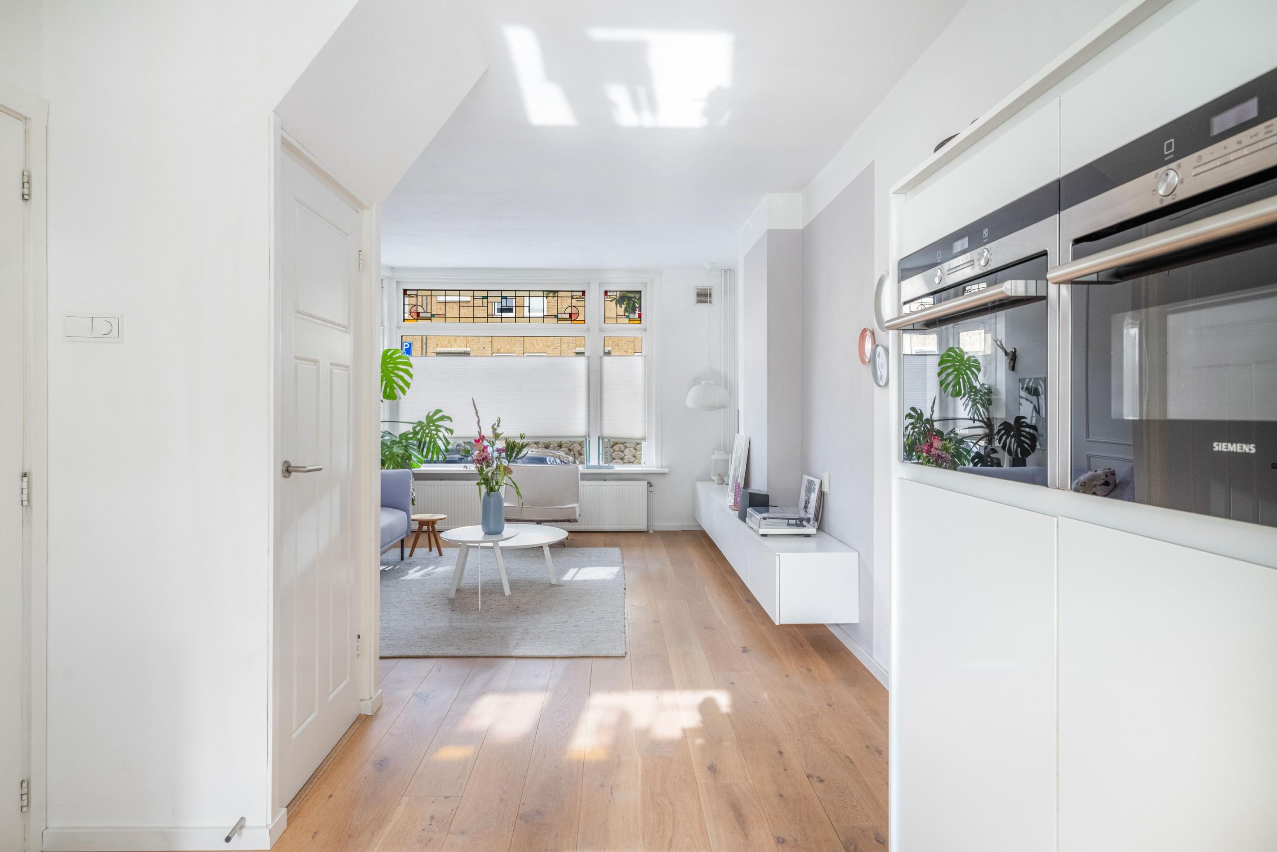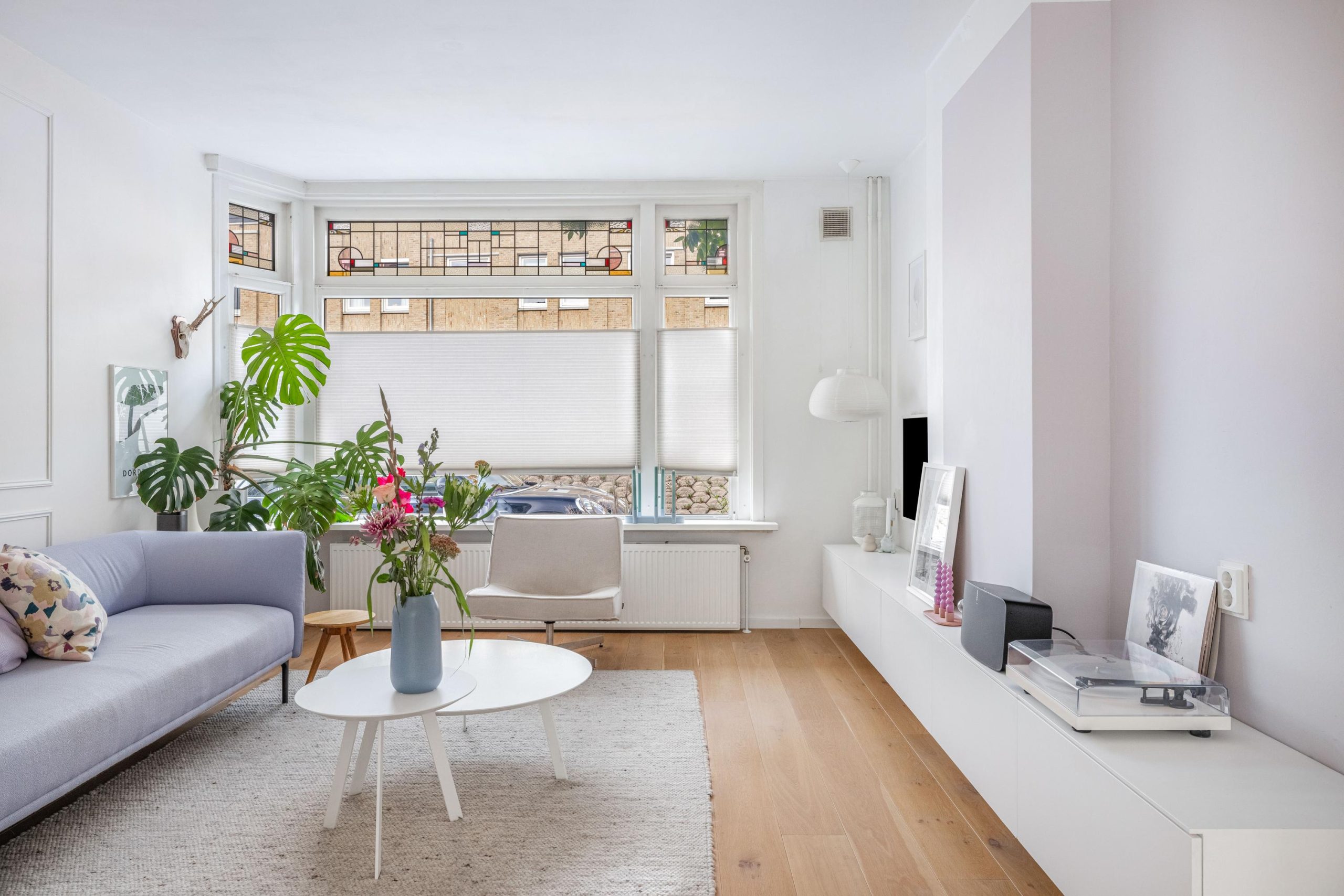 Wanneer je de woonkamer betreedt, vallen direct een aantal zaken op; royale ruimte, prachtige lichtinval, strakke afwerking en een open keuken. De zitruimte aan voorzijde is ruim opgezet en krijgt veel karakter door de halve erker met kleurrijke glas-in-lood ruiten en sierlijsten aan de wand. De achterpui is eveneens versierd met hetzelfde glas-in-lood, deze is tevens voorzien van sfeervolle dubbele deuren naar het aangrenzend balkon.