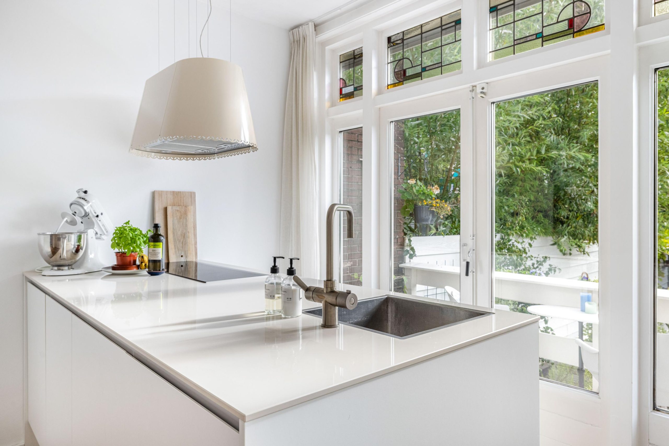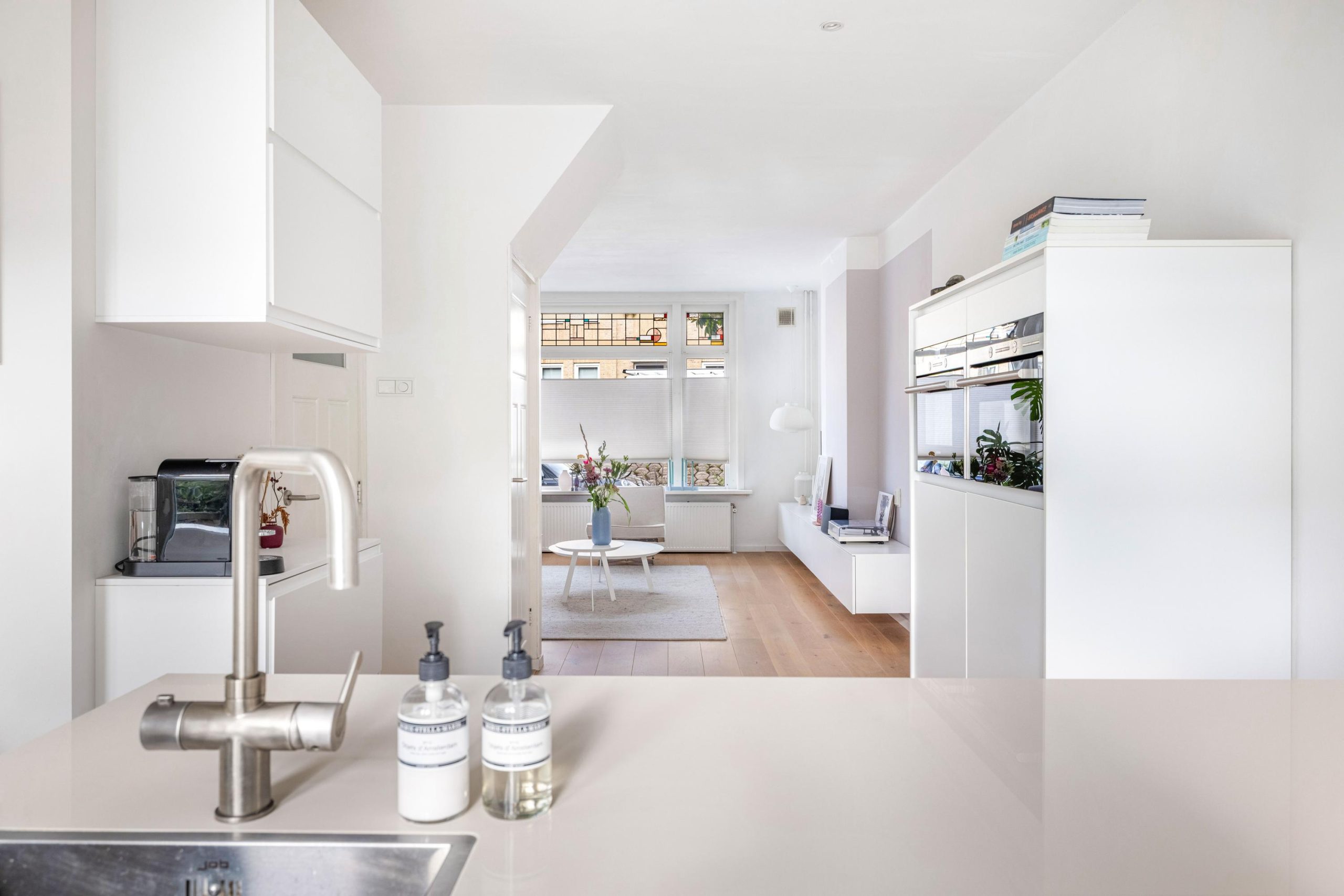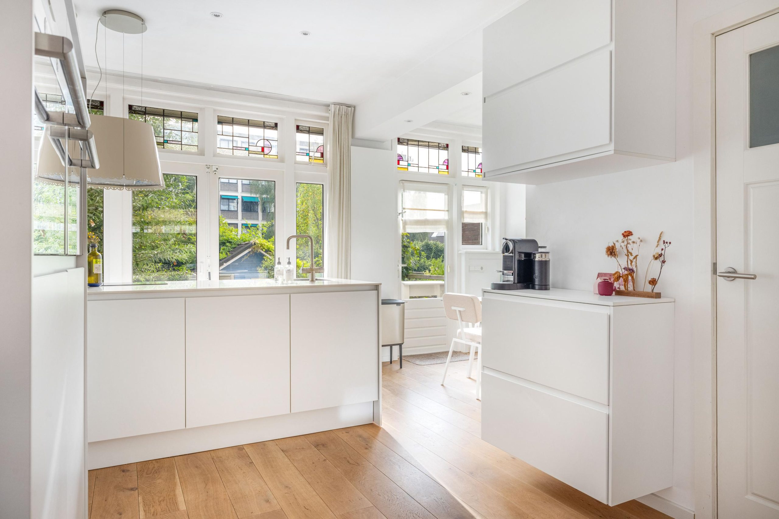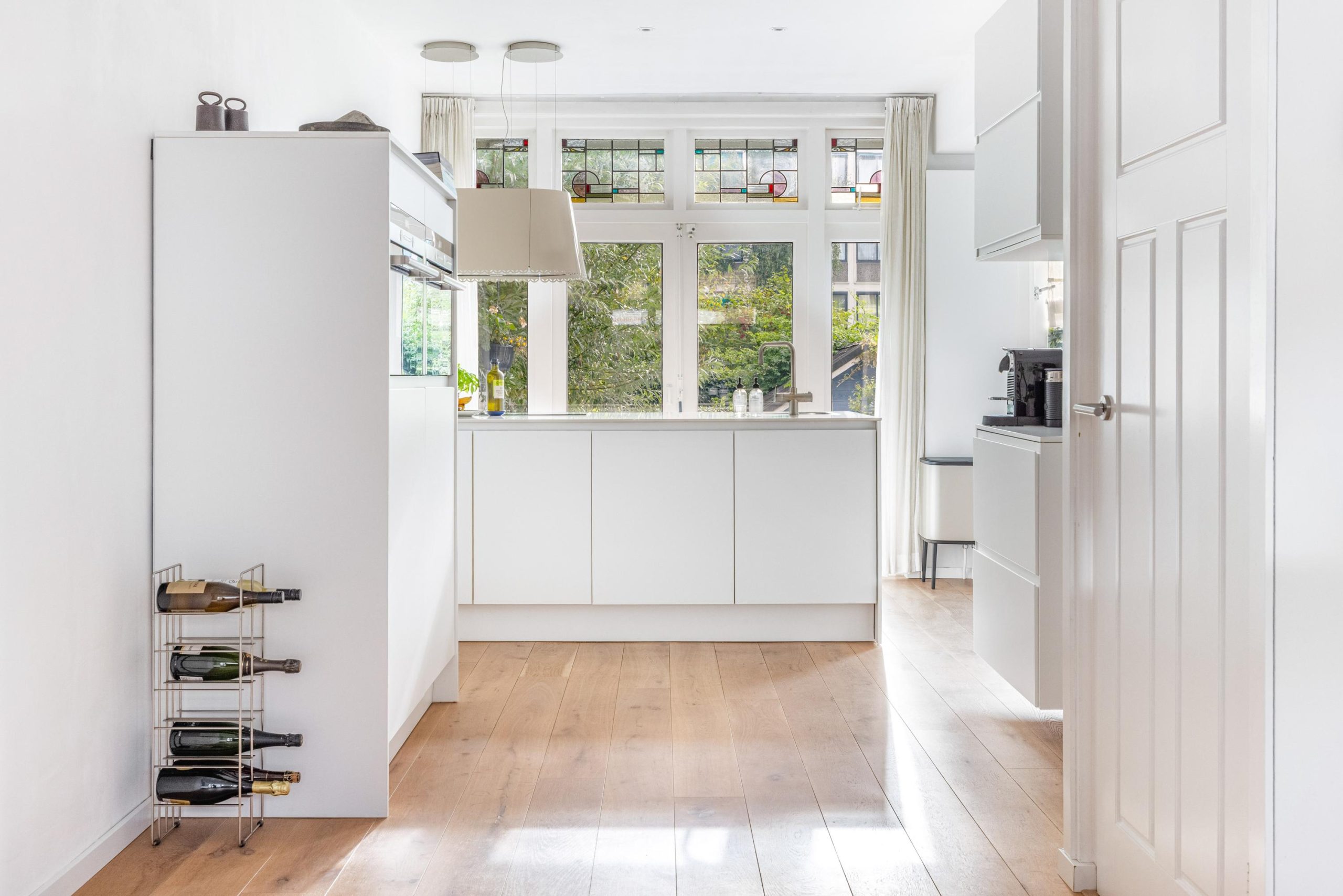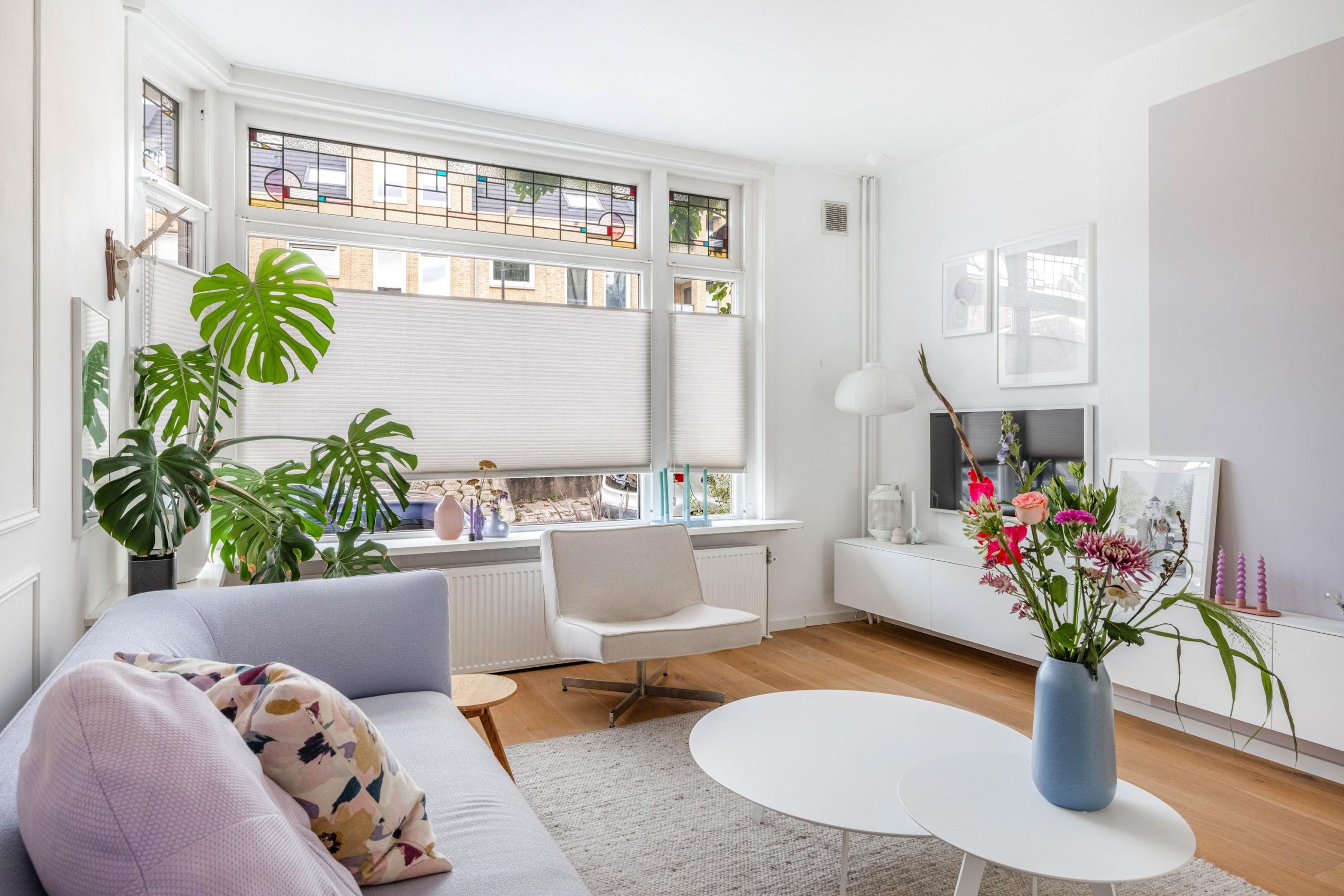 Wanneer je de woonkamer betreedt, vallen direct een aantal zaken op; royale ruimte, prachtige lichtinval, strakke afwerking en een open keuken. De zitruimte aan voorzijde is ruim opgezet en krijgt veel karakter door de halve erker met kleurrijke glas-in-lood ruiten en sierlijsten aan de wand. De achterpui is eveneens versierd met hetzelfde glas-in-lood, deze is tevens voorzien van sfeervolle dubbele deuren naar het aangrenzend balkon.