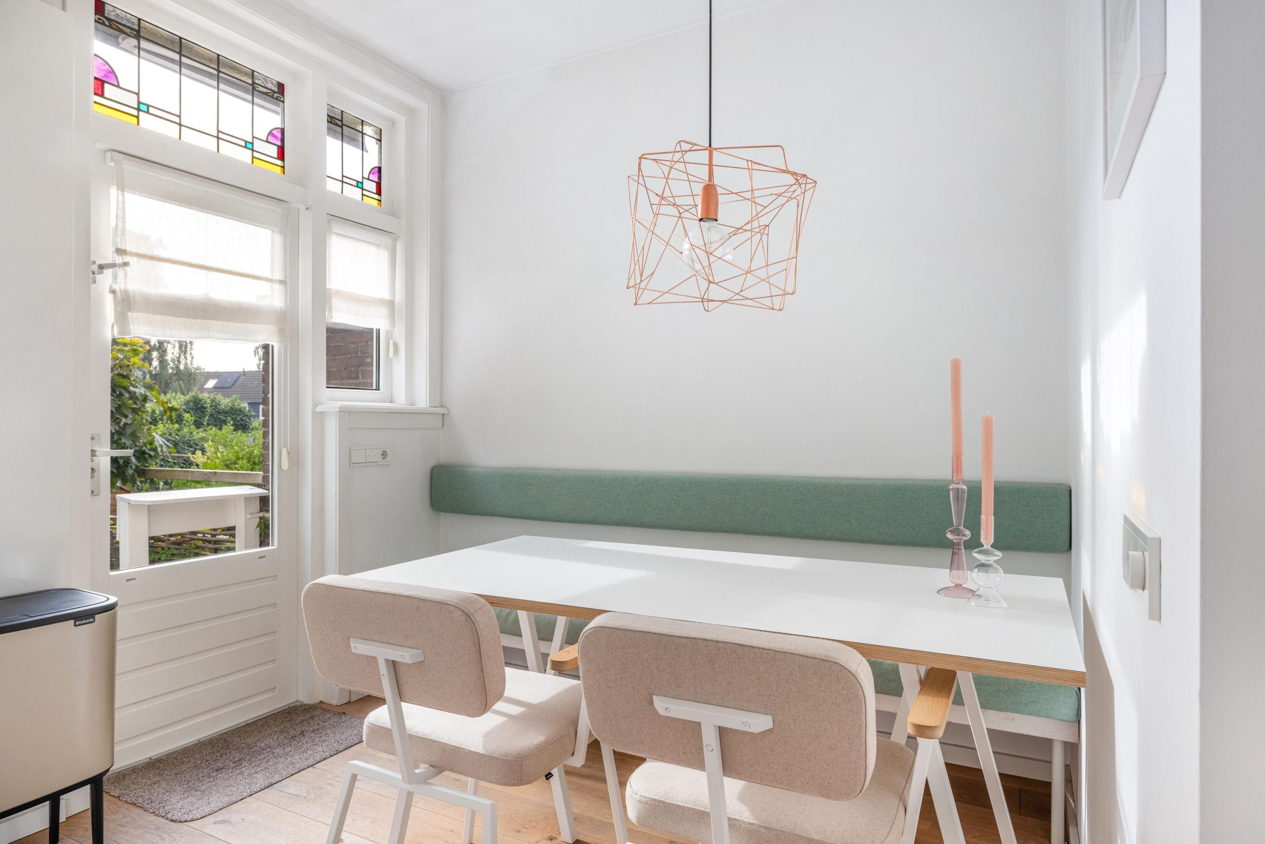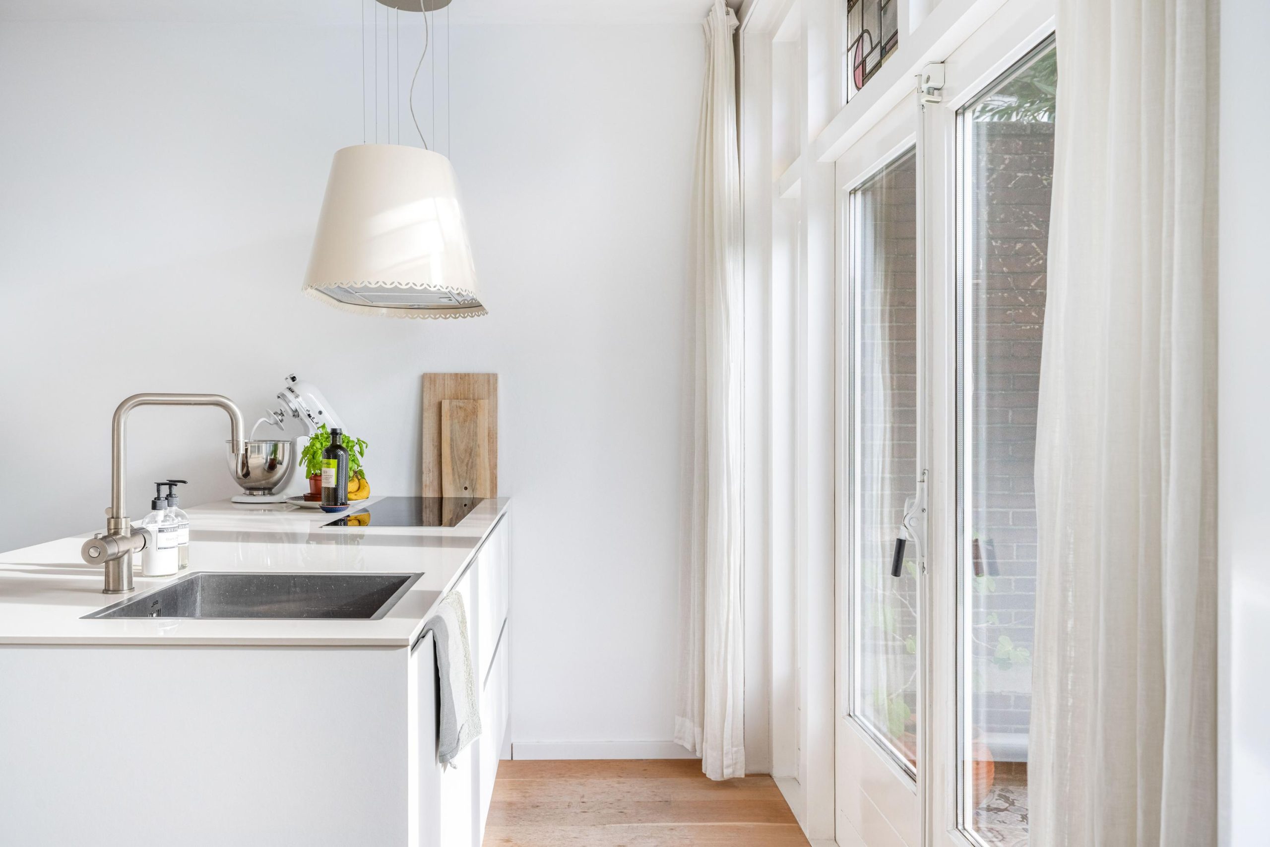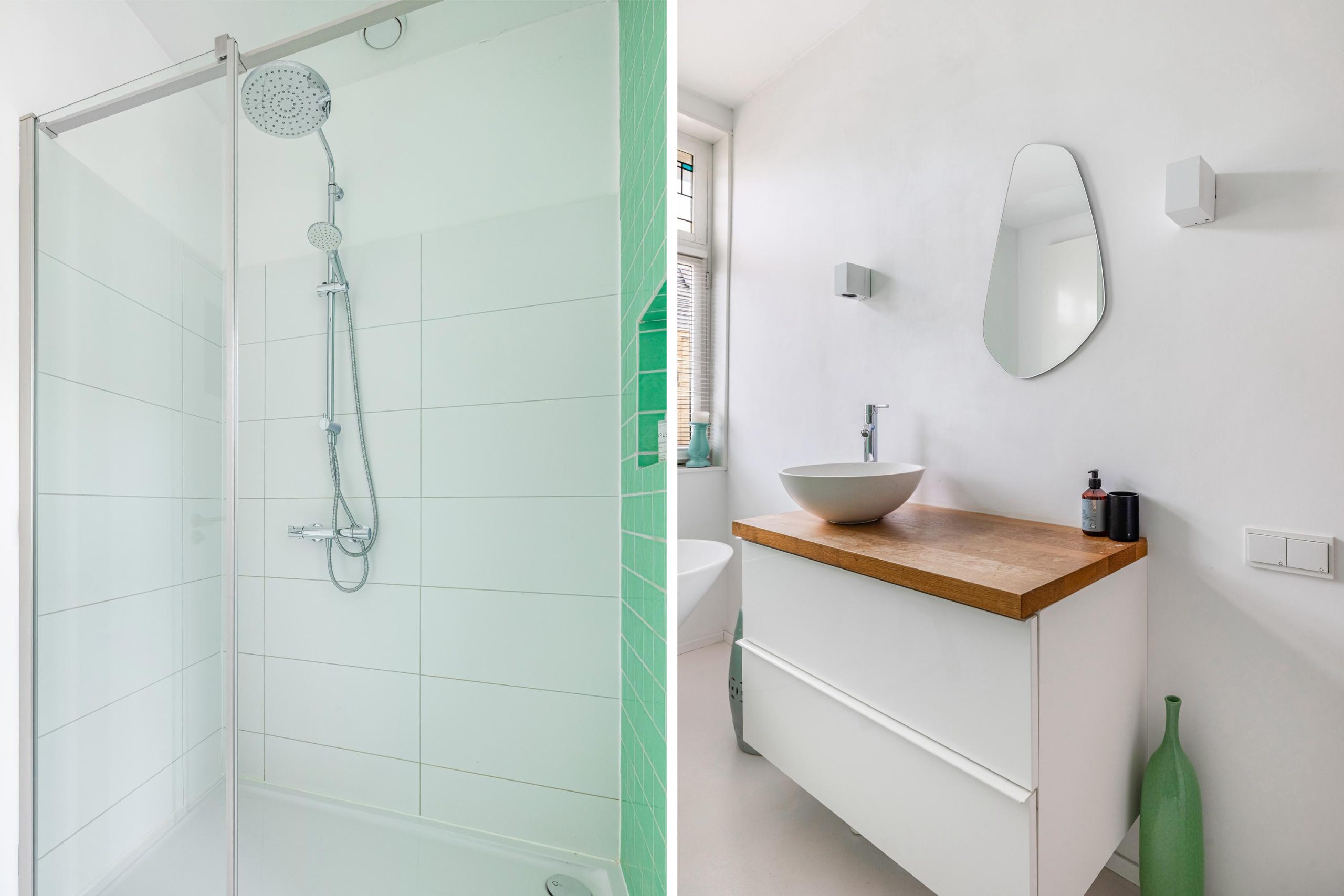 Binnen valt meteen het glas-in-lood op, waardoor het daglicht prachtig binnenvalt. De ruimtes voelen strak, licht en helemaal af. De huidige bewoners zijn echte klussers en hebben deze woning tot in de puntjes instapklaar gemaakt. De moderne witte keuken met schiereiland én de supergave badkamer (met die gedurfde groene kleur!) laten zien dat hier over het materiaal- en kleurgebruik is nagedacht en alles als een eenheid voelt.