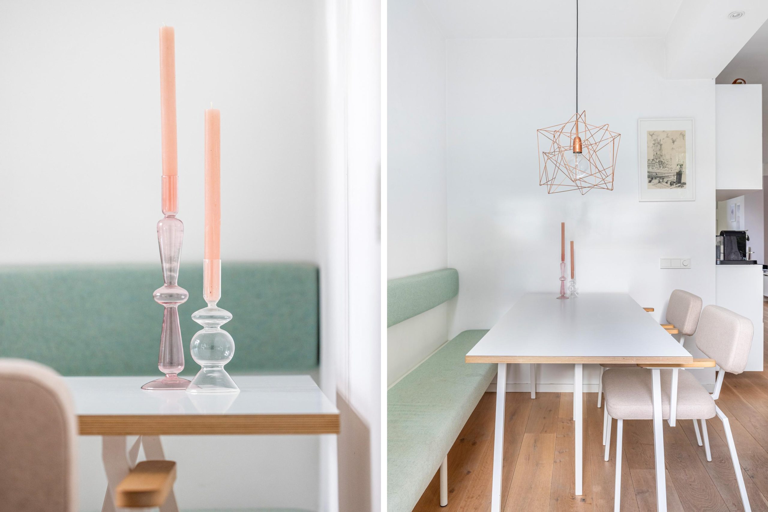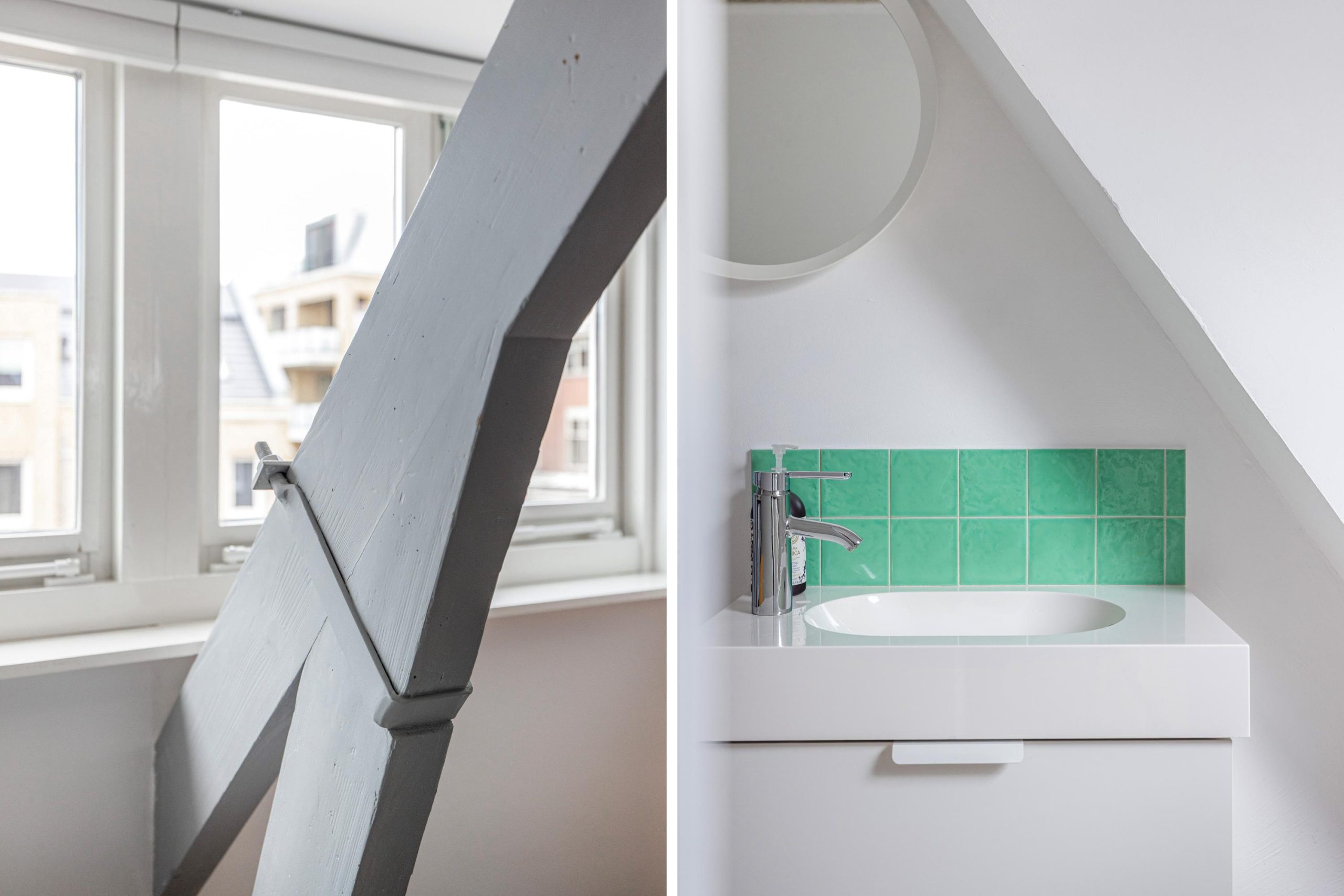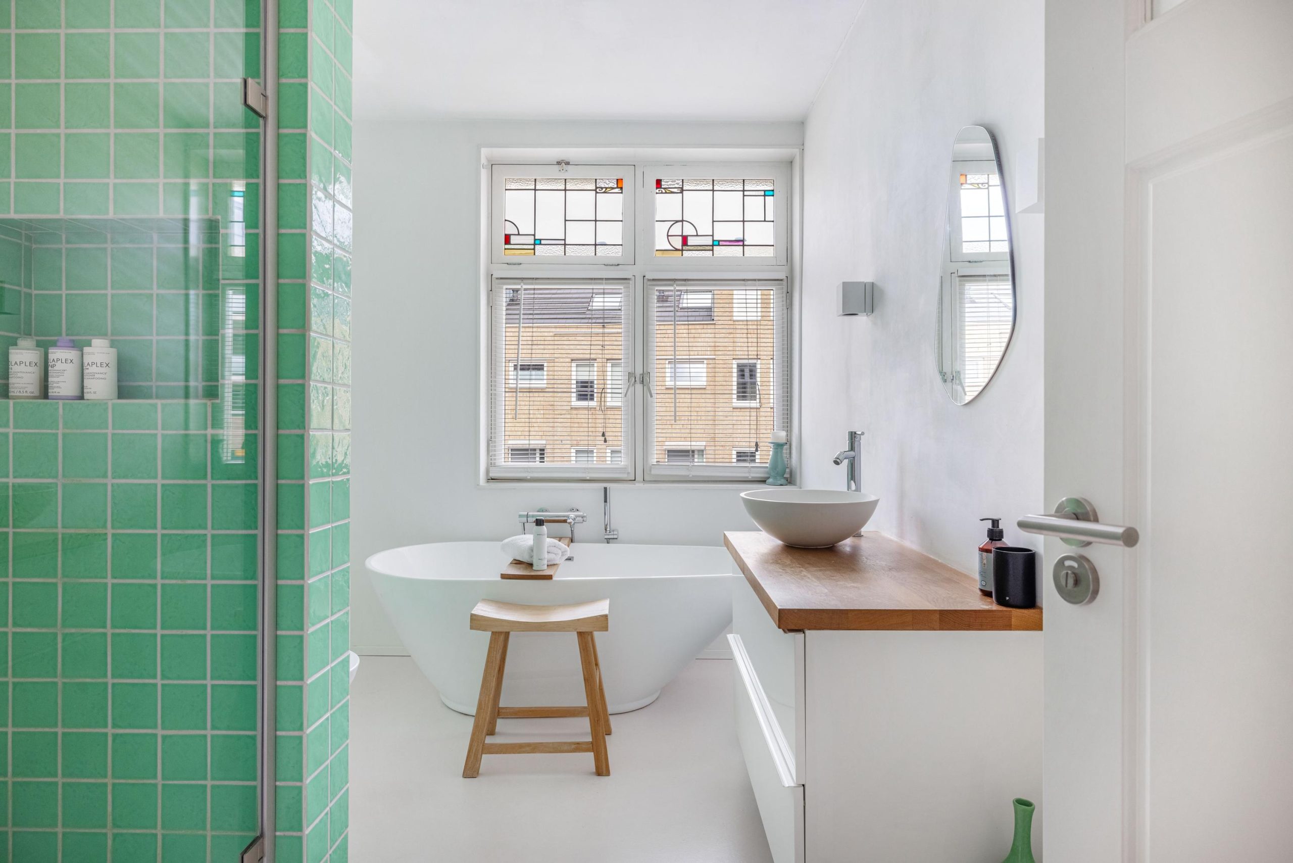 Binnen valt meteen het glas-in-lood op, waardoor het daglicht prachtig binnenvalt. De ruimtes voelen strak, licht en helemaal af. De huidige bewoners zijn echte klussers en hebben deze woning tot in de puntjes instapklaar gemaakt. De moderne witte keuken met schiereiland én de supergave badkamer (met die gedurfde groene kleur!) laten zien dat hier over het materiaal- en kleurgebruik is nagedacht en alles als een eenheid voelt.