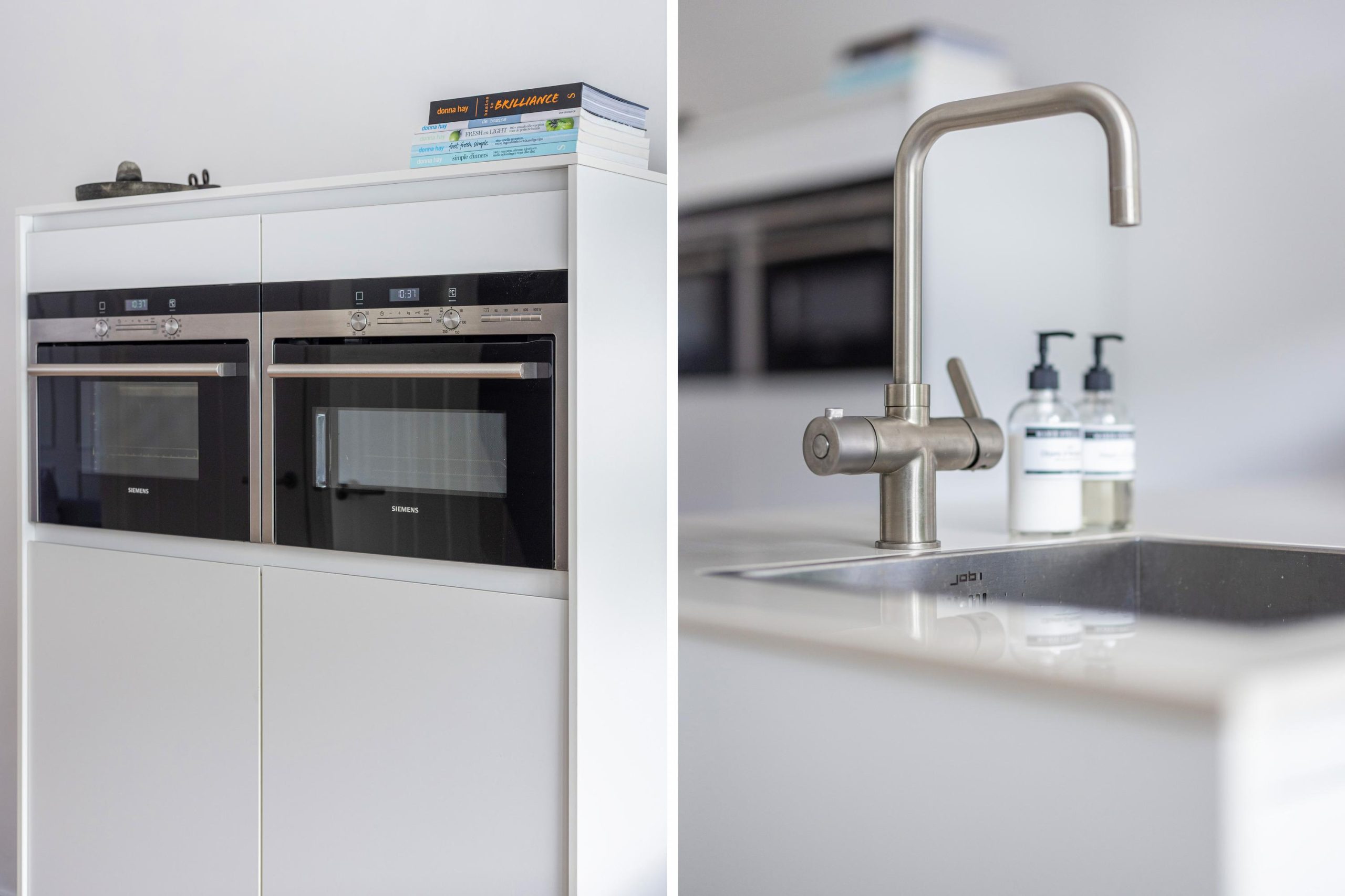 Achterin de woonkamer bevindt zich de open keuken, eveneens ruim opgezet met groot schiereiland, wandopstelling en extra bergkasten. De keuken is in 2014 geplaatst en voorzien van diverse inbouwapparatuur van Siemens: inductieplaat (4 pits), design afzuigkap, vaatwasser, combi-oven, stoomoven, koelkast, vriezer, kokend waterkaan, close-in boiler. De keuken is afgewerkt met een composiet werkblad. Naast de keuken is ruimte voor een knusse eethoek.