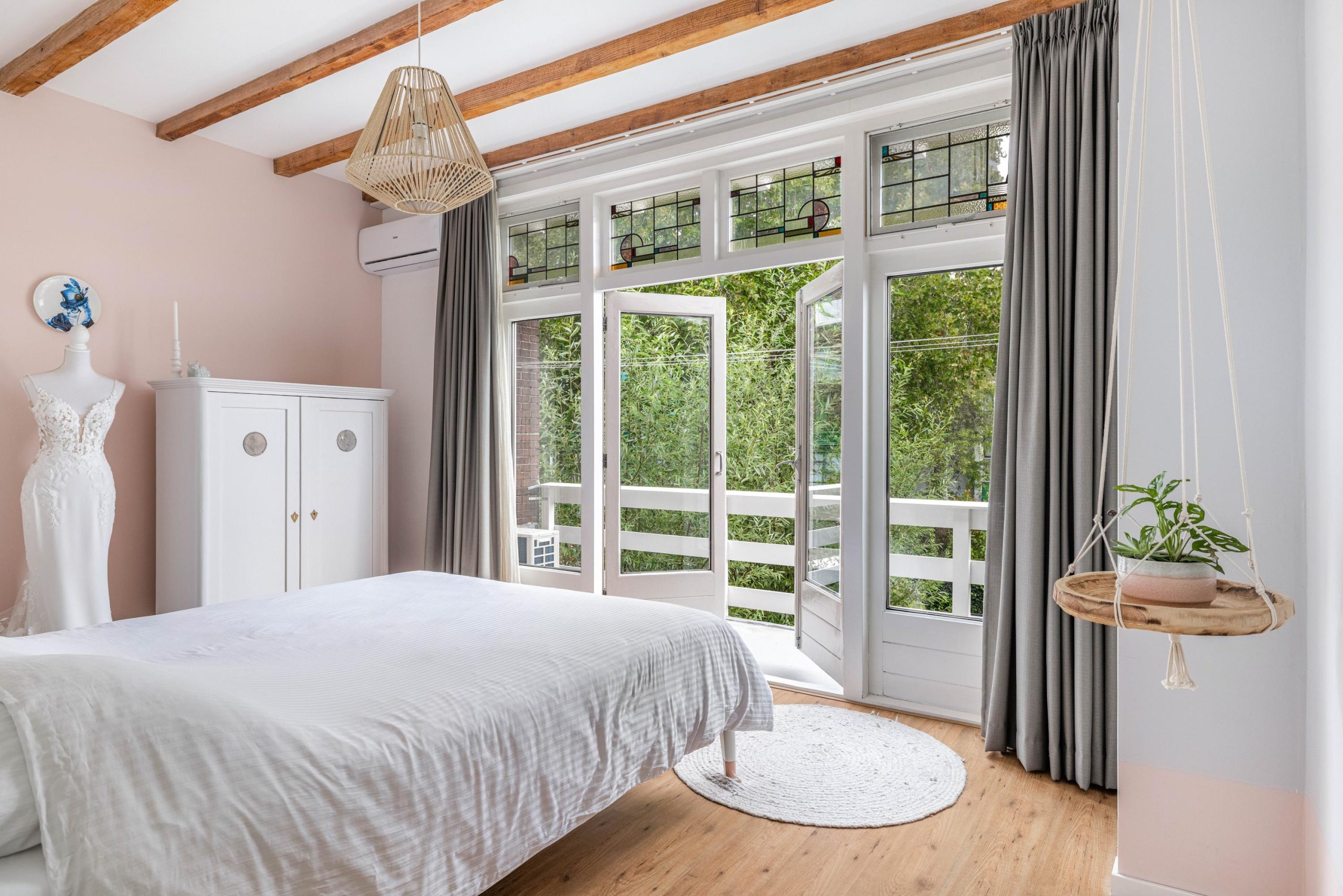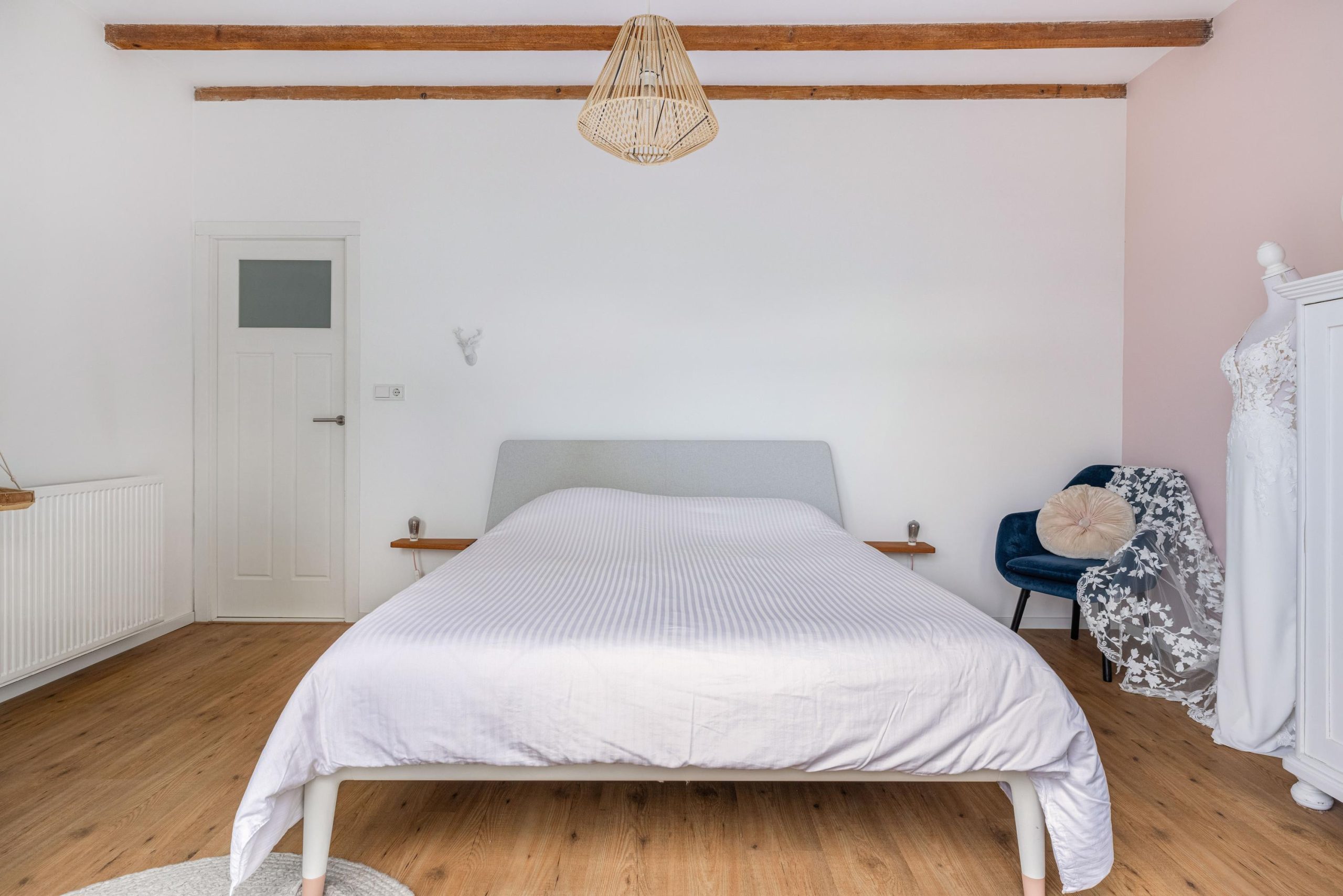De hoofdslaapkamer is gelegen aan de achterzijde van de woning. Deze kamer is zeer ruim opgezet en voorzien van een sfeervol balken plafond, airconditioning (2021), een vaste kast en dubbele deuren naar het aangrenzende balkon.