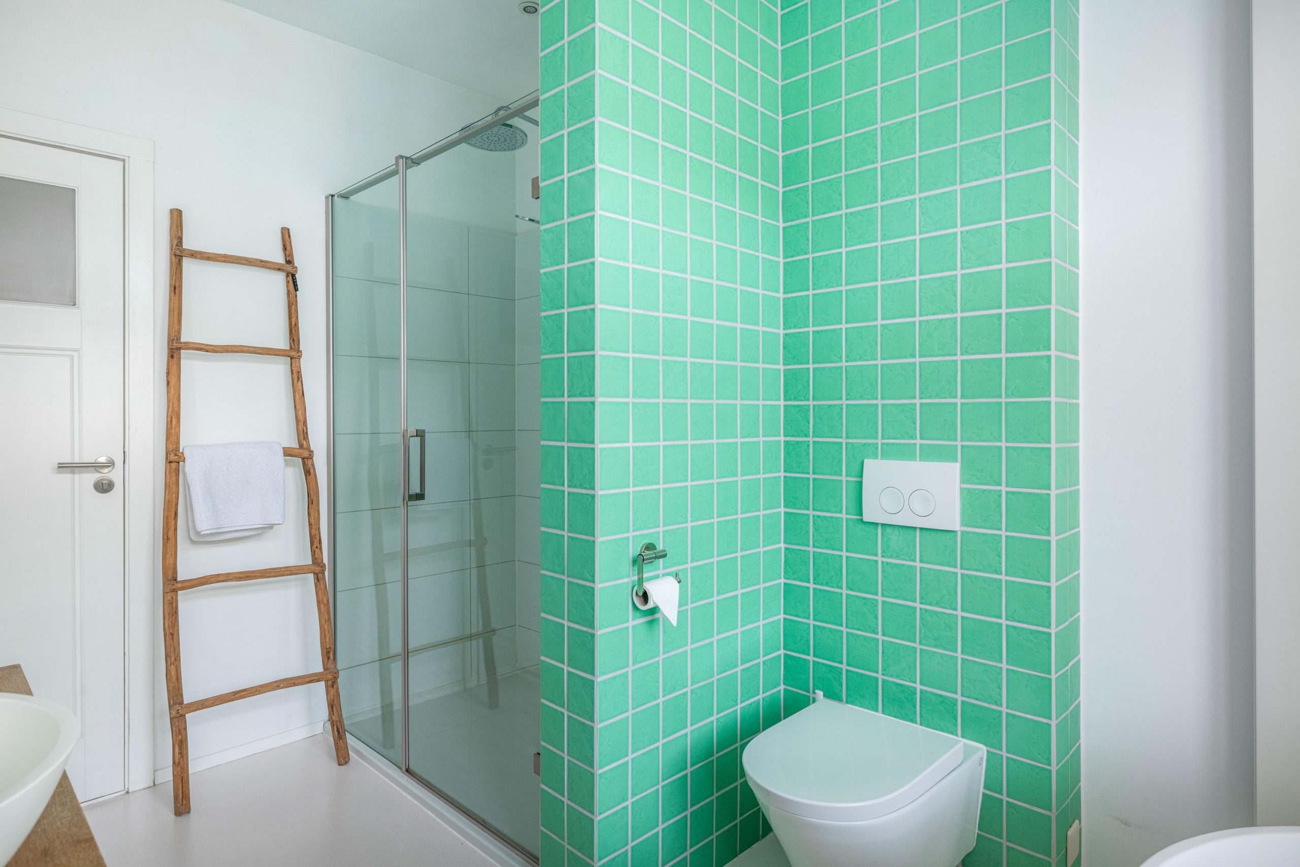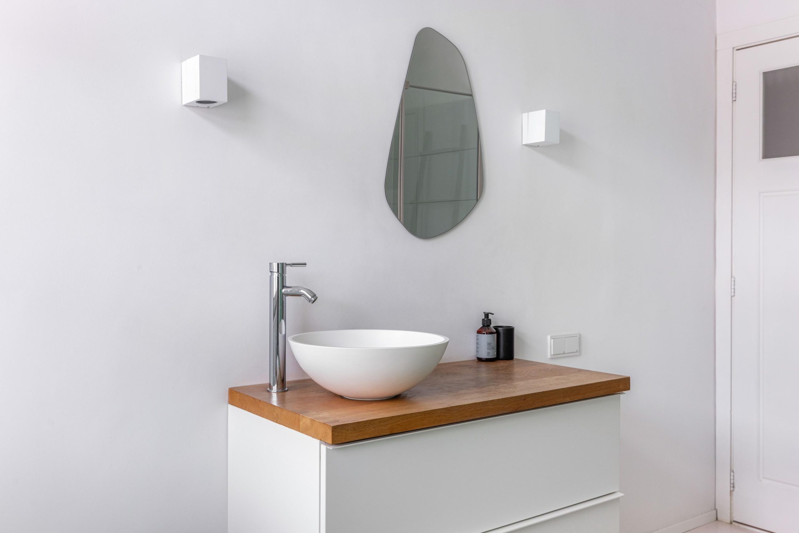 De badkamer is in 2014 geplaatst en voorzien van een vrijstaand ligbad met thermostaatkraan, inloopdouche met regendouche en thermostaatkraan, waskom op wasmeubel en een toilet. De badkamer is afgewerkt met mooie gebakken tegels, een neutrale gietvloer en glas-in-lood ramen.