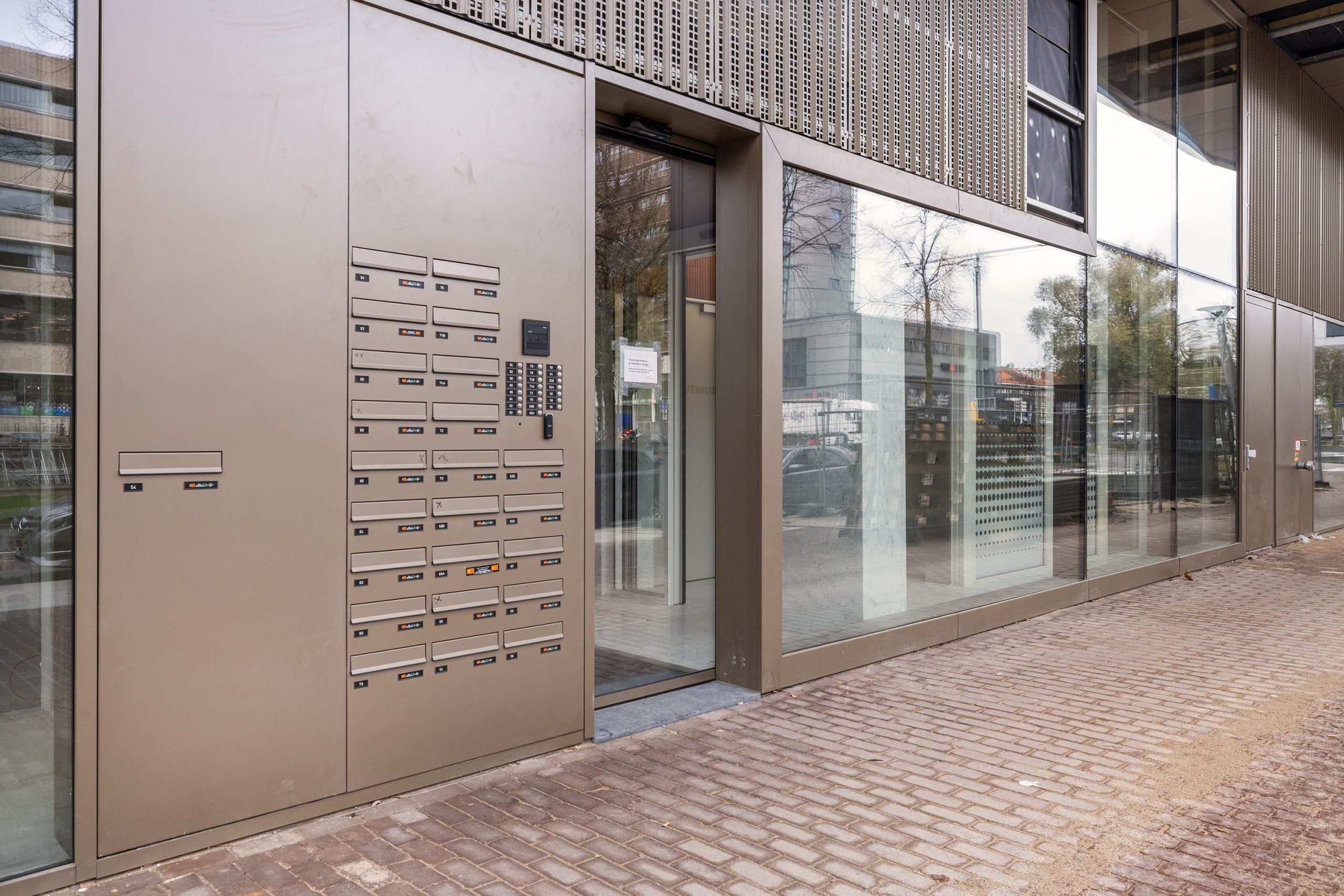 De entree bevindt zich in een afgesloten hal met bellentableau, brievenbussen en tussendeur naar de lift en het trappenhuis.