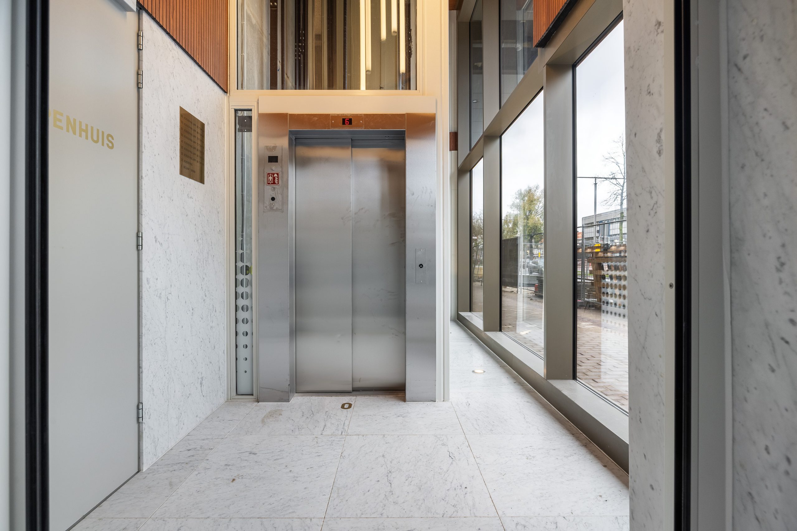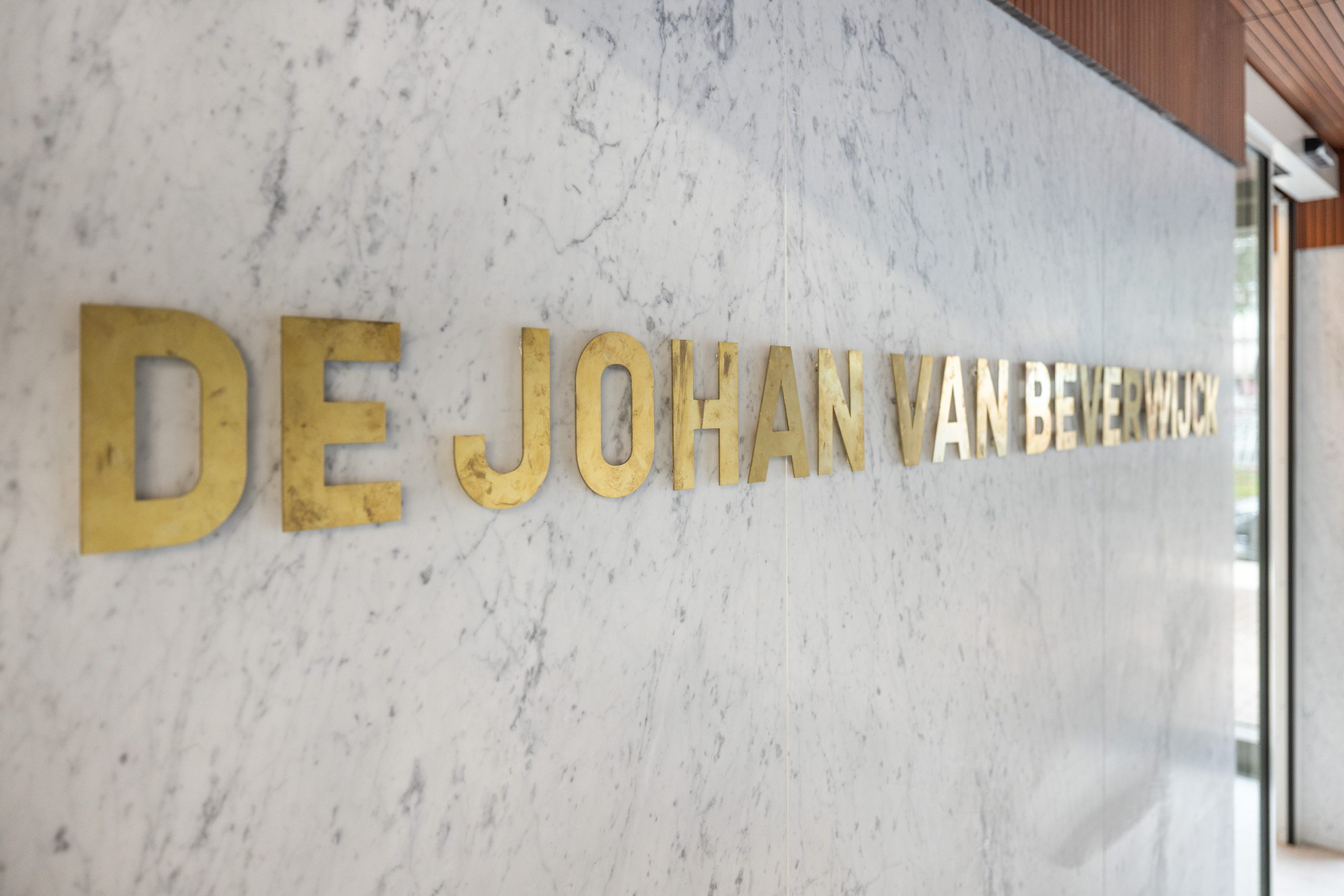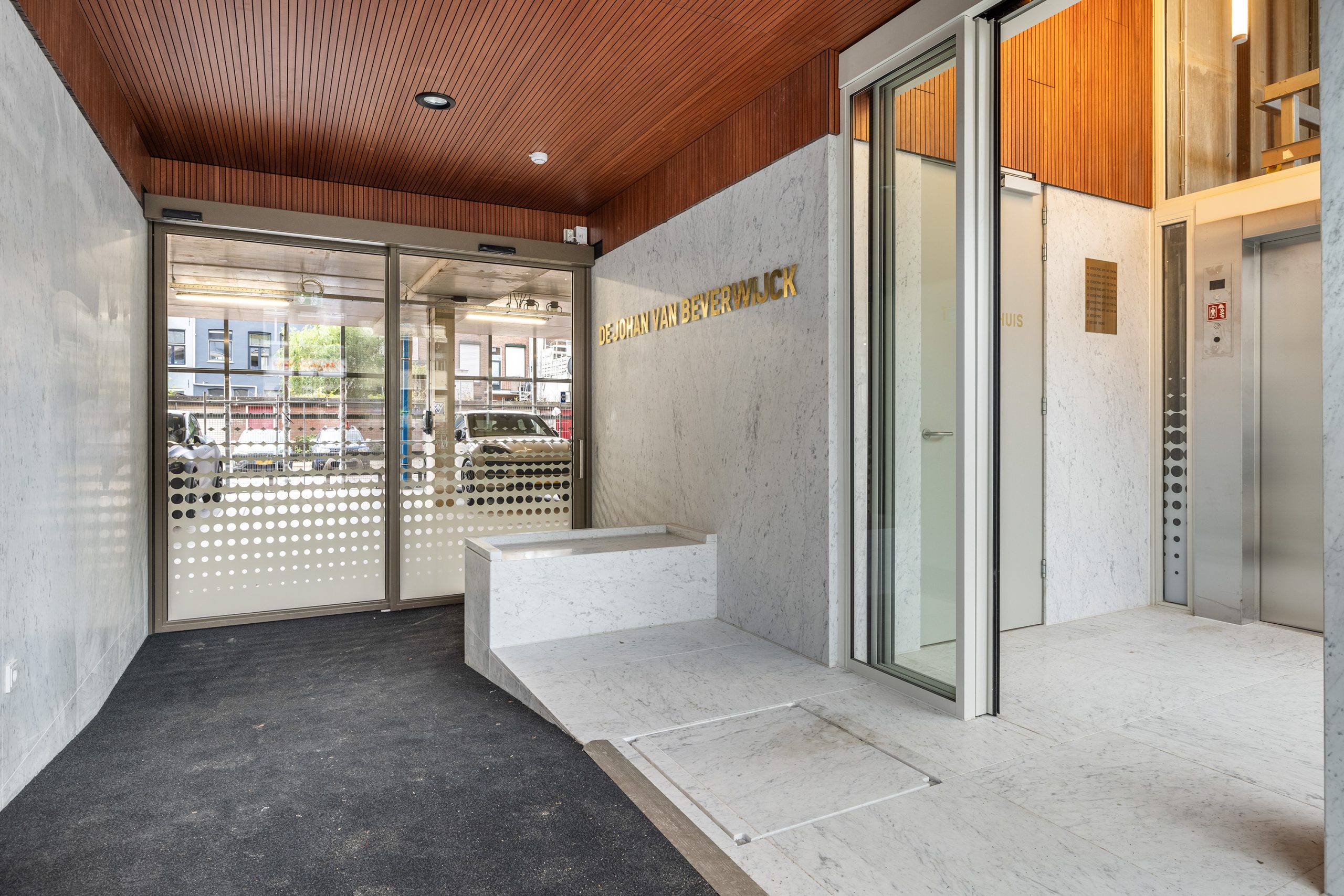 De beleving begint al bij de entree. Prachtig afgewerkt met marmer vloertegels en wandplaten, houten wand- en plafondpanelen en versierd met de naam van het complex in gouden letters 'de Johan van Beverwijck'.