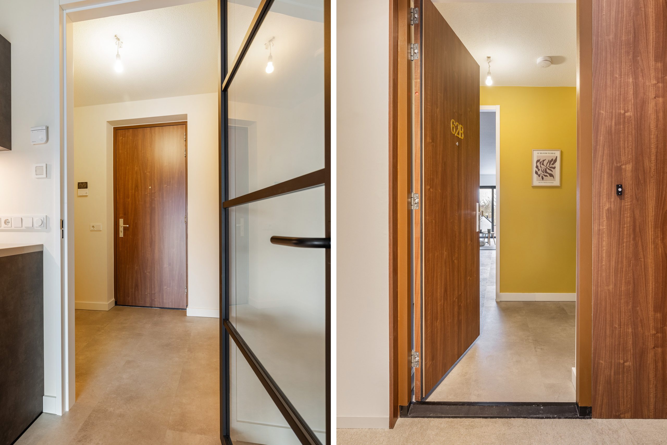 Eenmaal aangekomen op de 3e verdieping krijg je direct het gevoel dat je je in een chique hotel bevindt. De centrale hal is afgewerkt met een mooi tapijt, de houtlook voordeuren zijn versierd met het huisnummer in gouden cijfers.