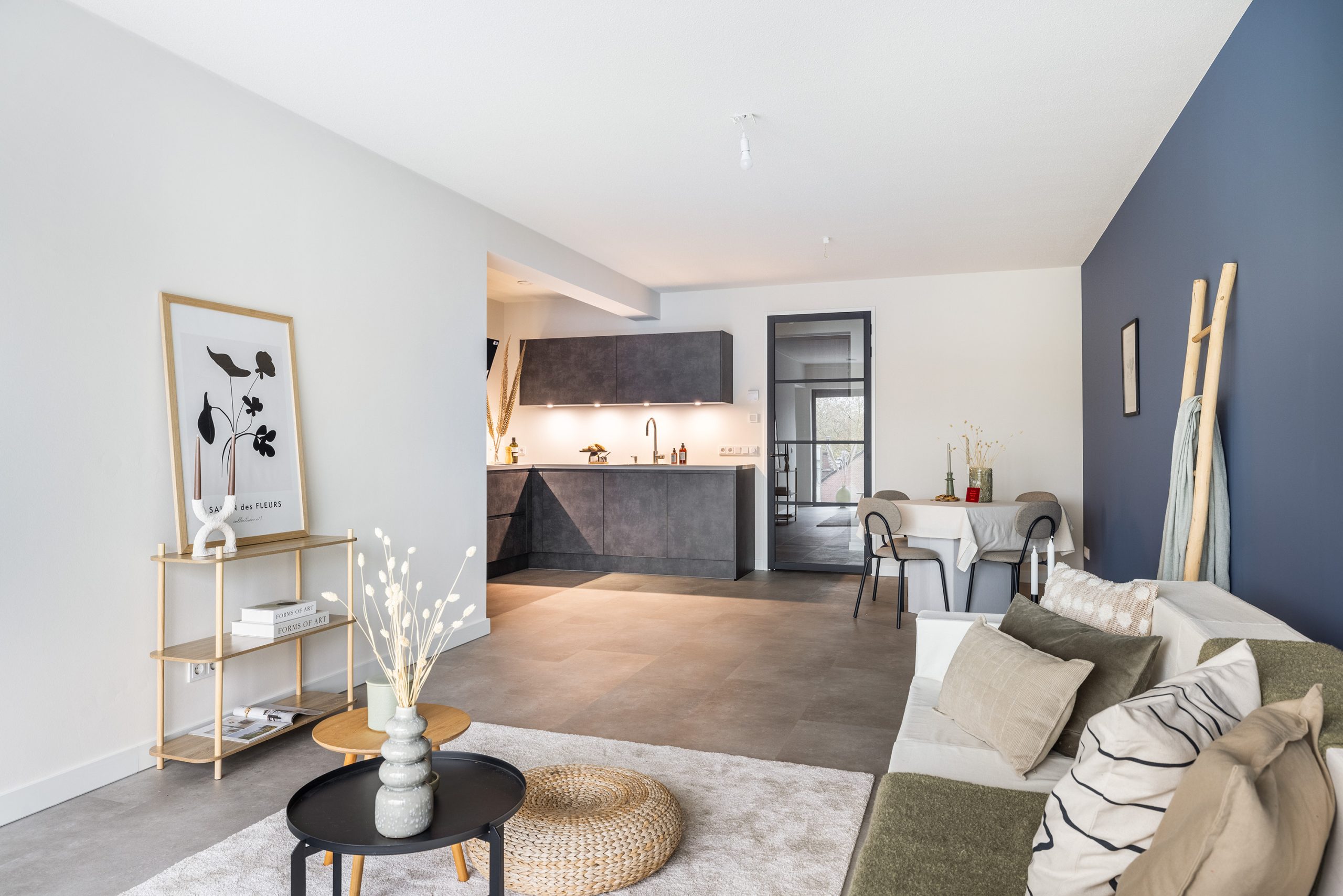 De woonkamer met open keuken is gelegen aan de achterzijde van het complex. De grote raampartijen zorgen hier voor een prachtige lichtinval. De woonkamer is afgewerkt met een nette PVC vloer en renovlies behang met sauswerk.