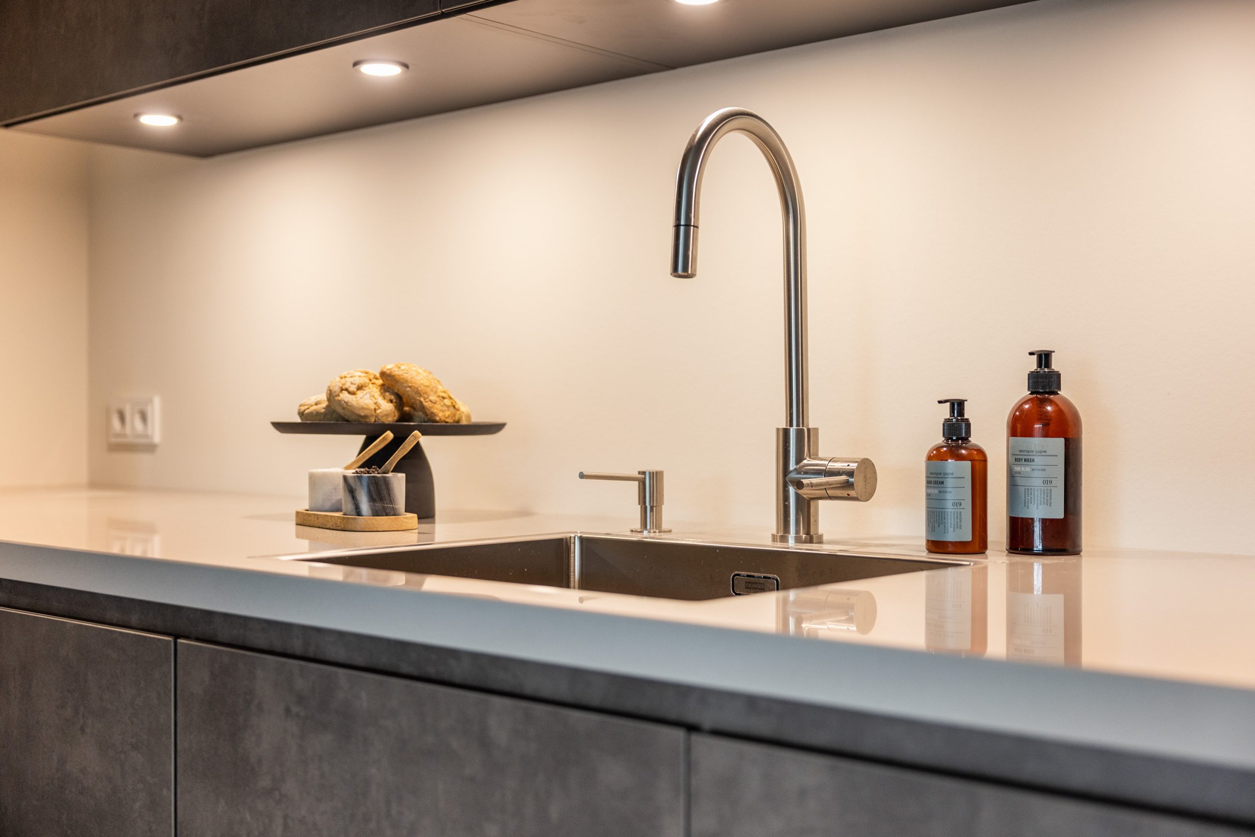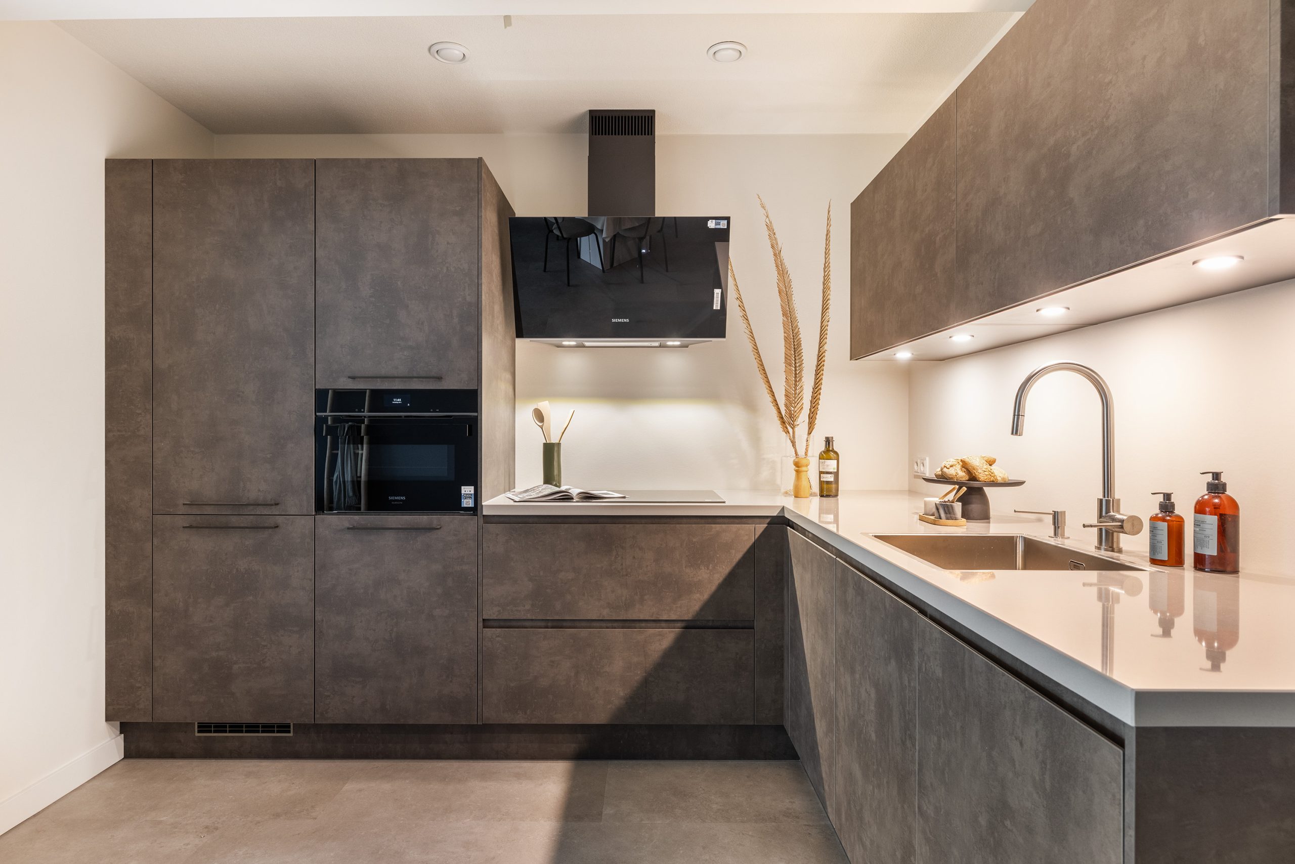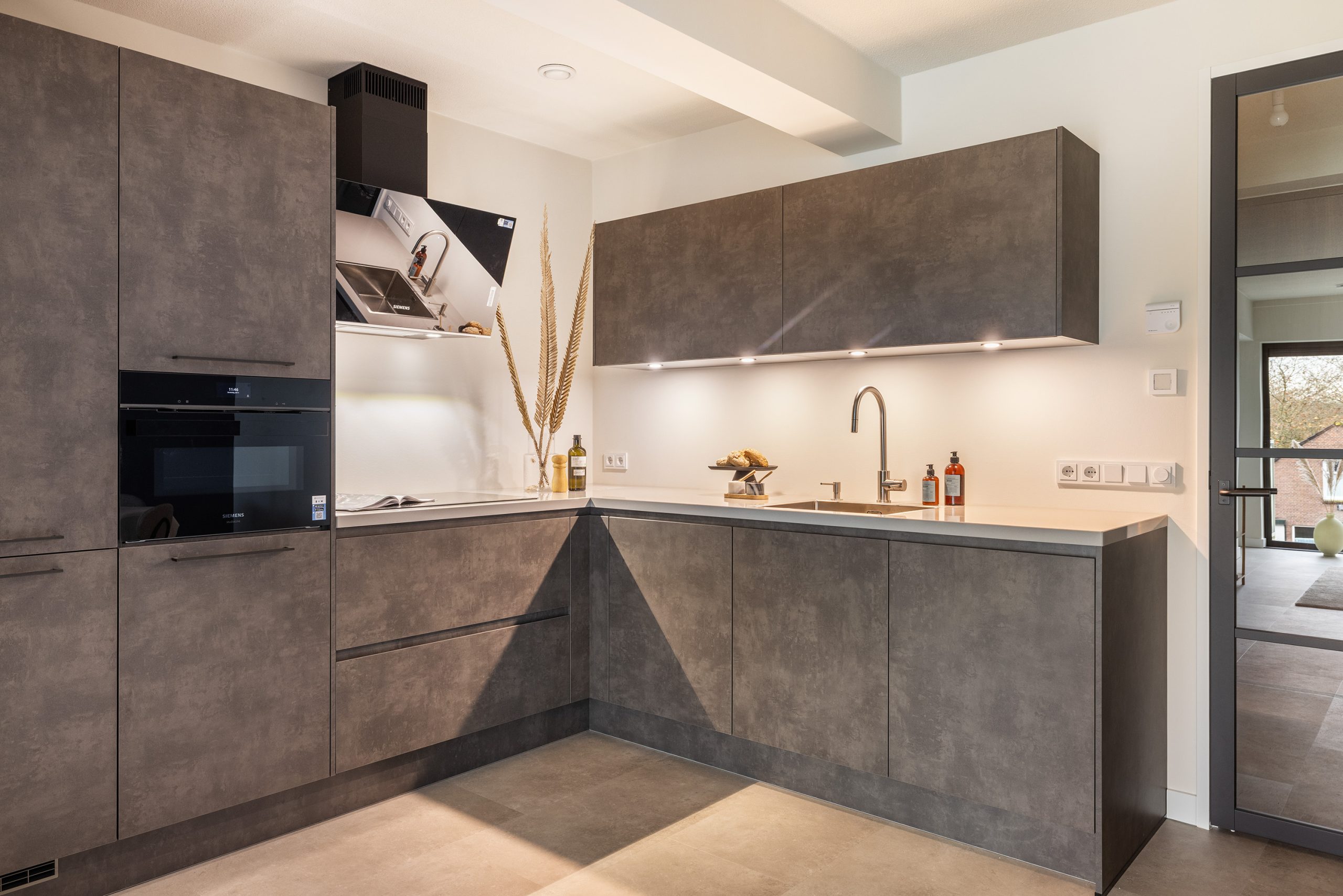 Door naar de keuken, deze is gloednieuw en mooi afgewerkt. De keuken is geplaatst in een hoekopstelling en voorzien van een inductie kookplaat, afzuigkap (recirculatie), vaatwasser, oven, koel-/vriescombinatie, composiet werkblad, een Le Mans-kast en veel praktische bergruimte. De ingebouwde verlichting maakt deze keuken helemaal af.