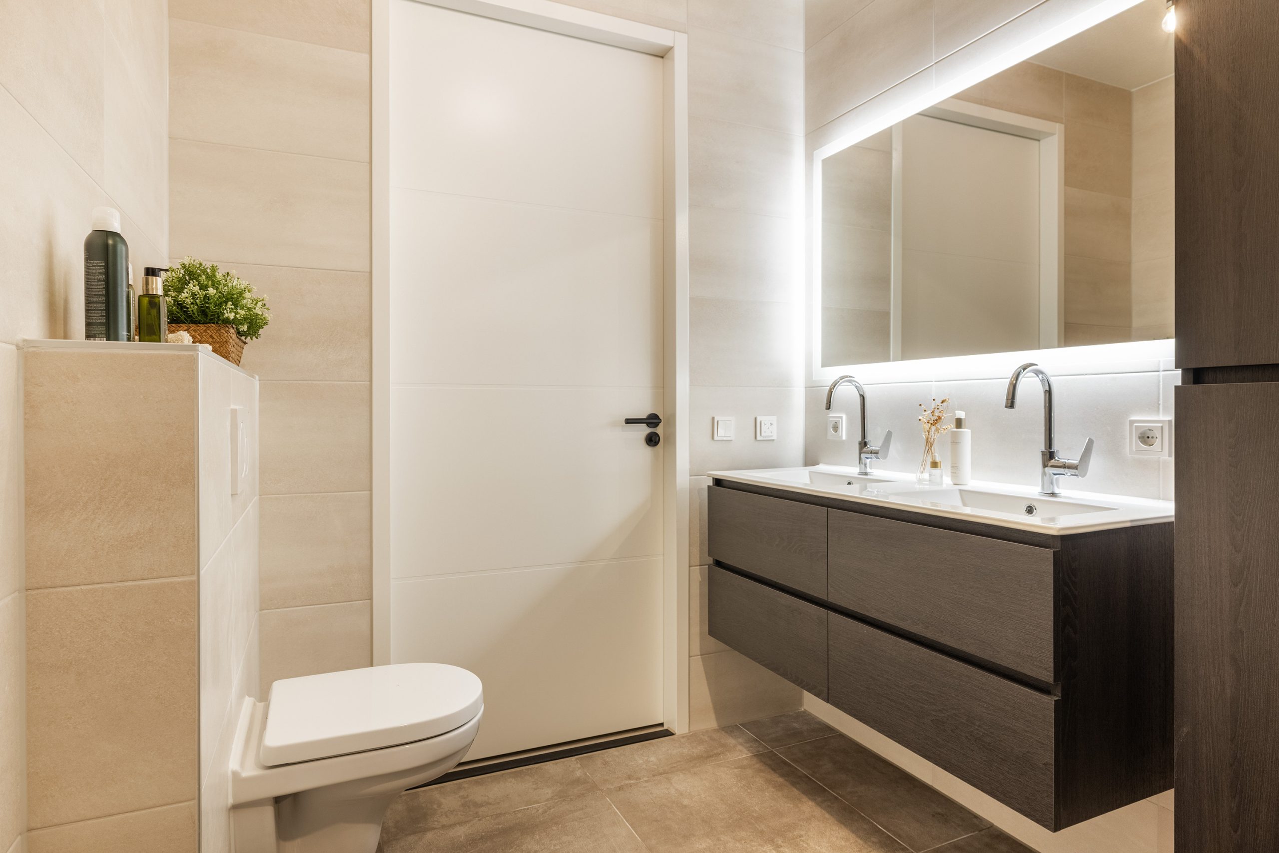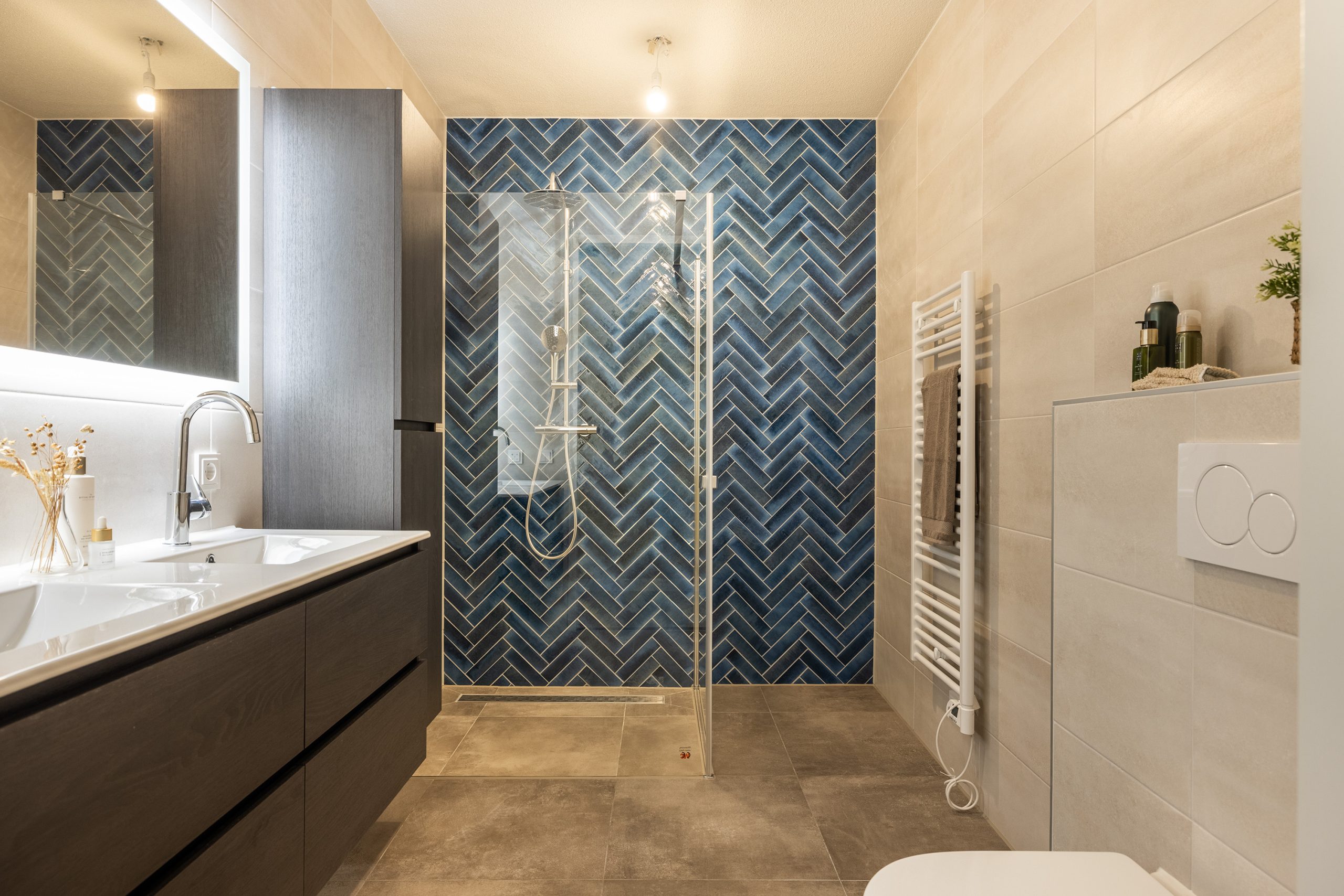 Ook de badkamer is tot in de puntjes afgewerkt. Een ruime inloopdouche met regendouche en thermostaatkraan, een dubbel wastafelmeubel, een kolomkast, grote spiegel met verlichting en verwarming, toilet en een designradiator. De badkamer is volledig betegeld. De accentmuur met tegels is visgraat motief achter de inloopdouche maakt het helemaal af.