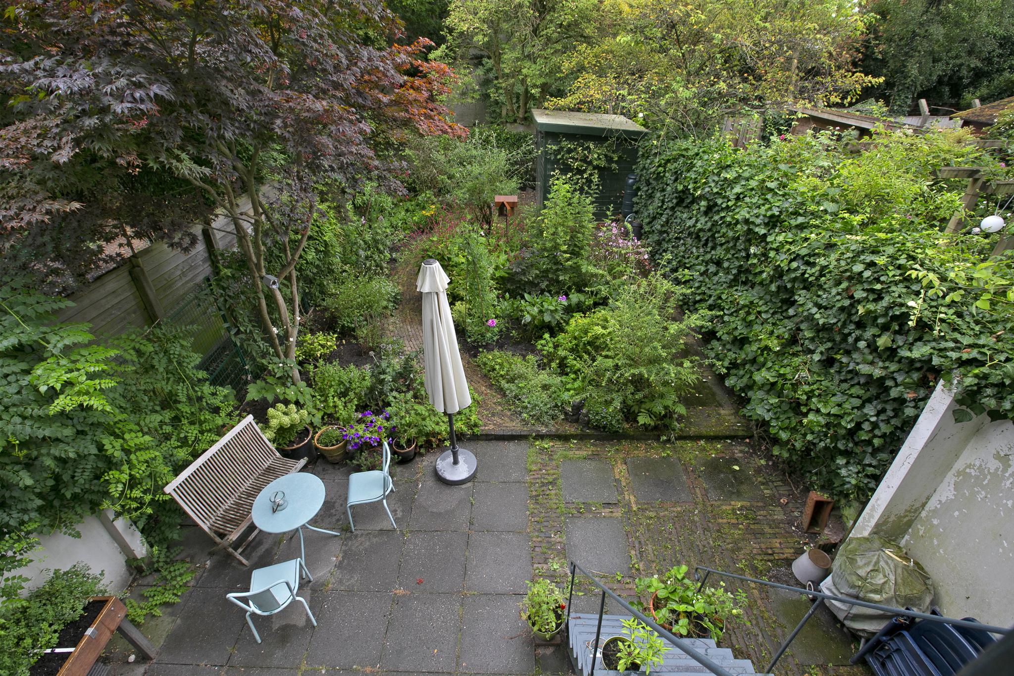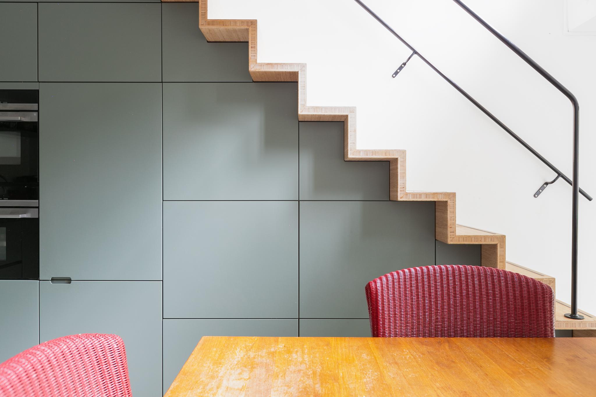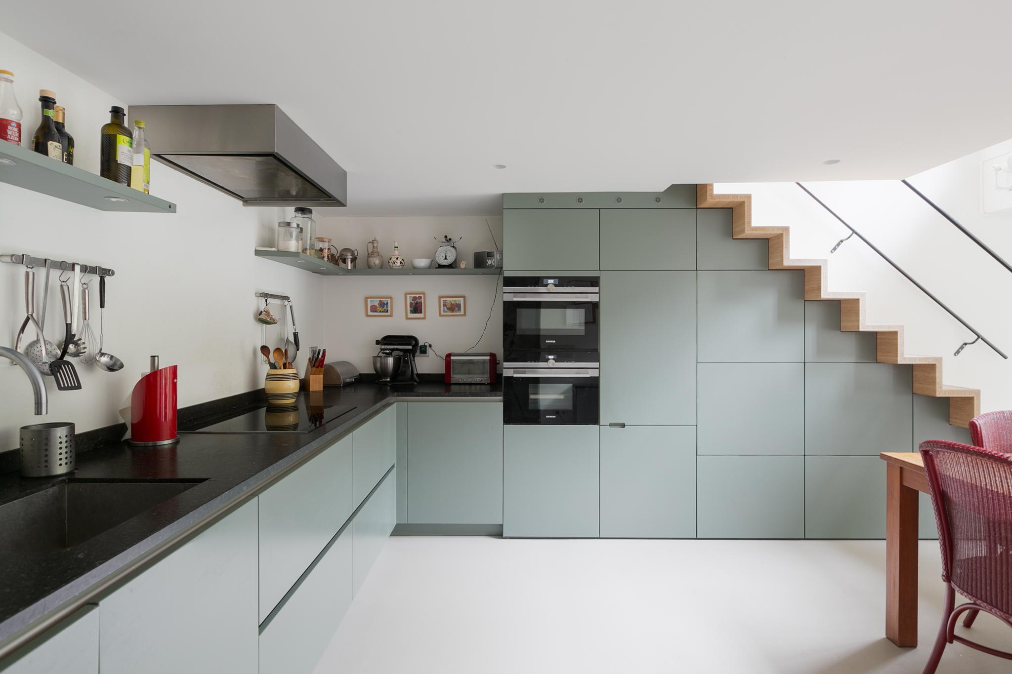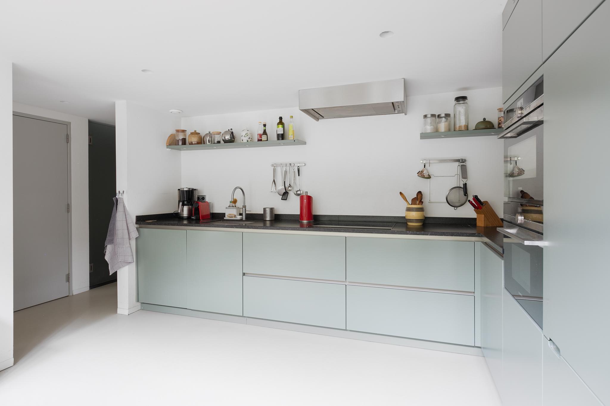 Onder de trap zijn vaste kasten gemaakt. De keuken is geplaatst in U opstelling en voorzien van koelkast, vriezer, vaatwasser, inductie kookplaat, stoomoven (werkt niet goed), oven, afzuigkap, Quooker en spoelbak, het geheel is afgewerkt met een composiet werkblad. Via openslaande deuren kom je in de prachtige stadstuin uit, een oase voor alle vogels en insecten en een fijne plek om na een lange dag werken af te schakelen.