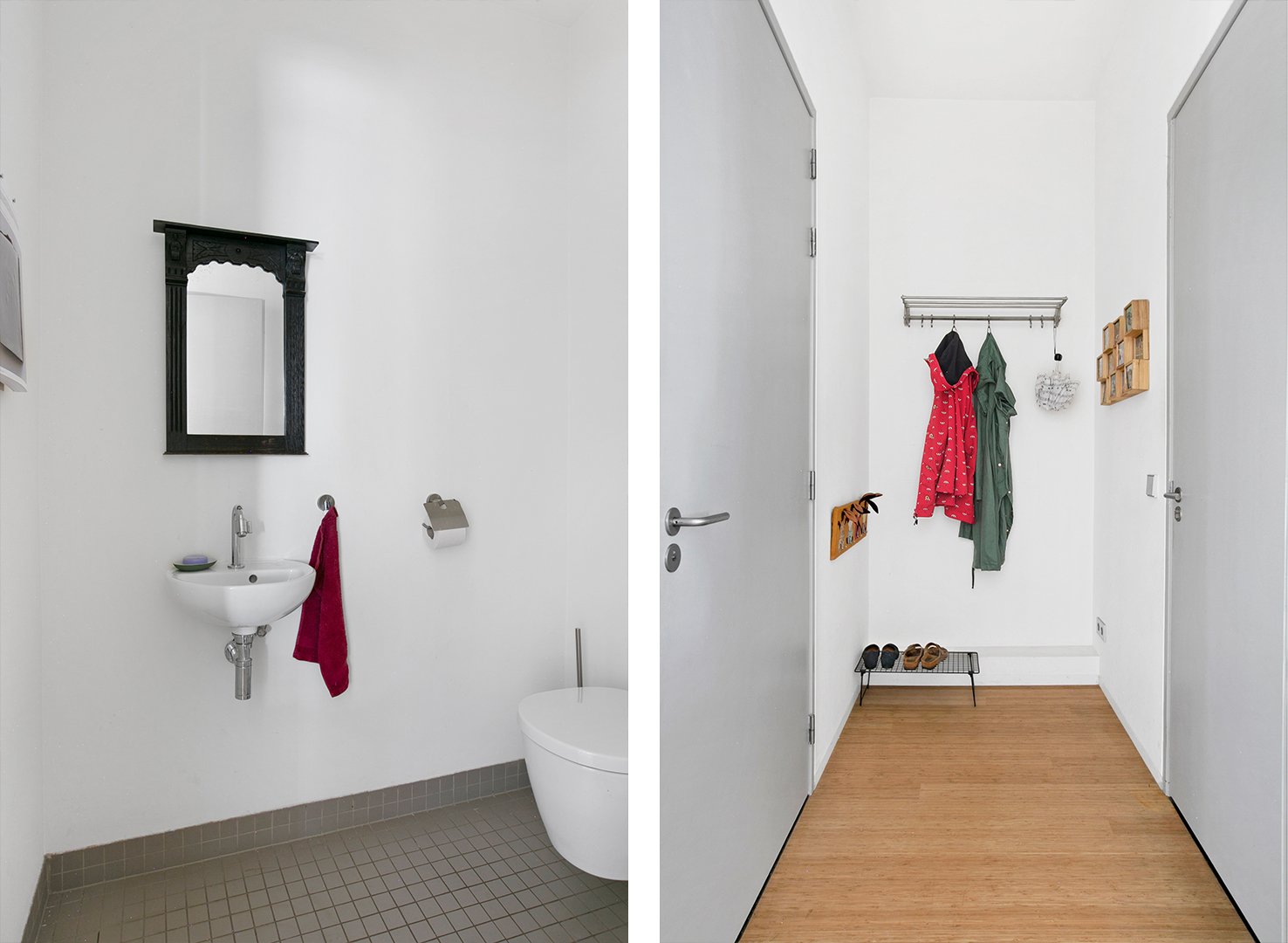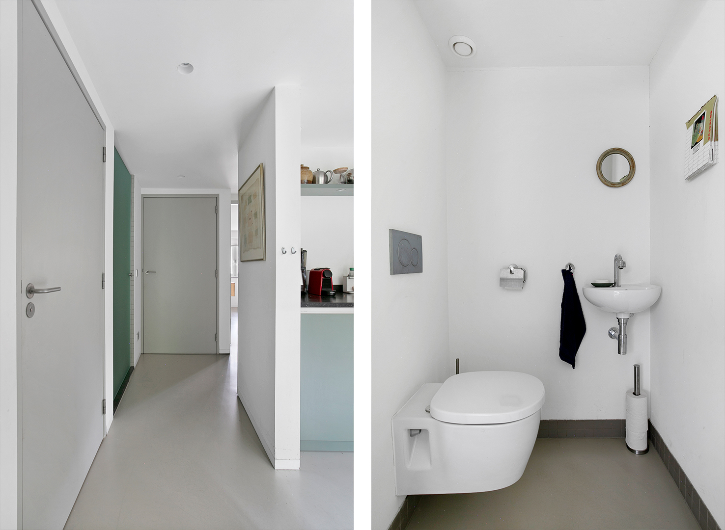 Hal met toilet, vrijhangend, fonteintje, stuc wanden.