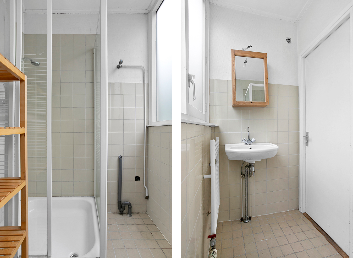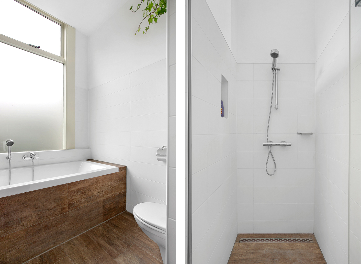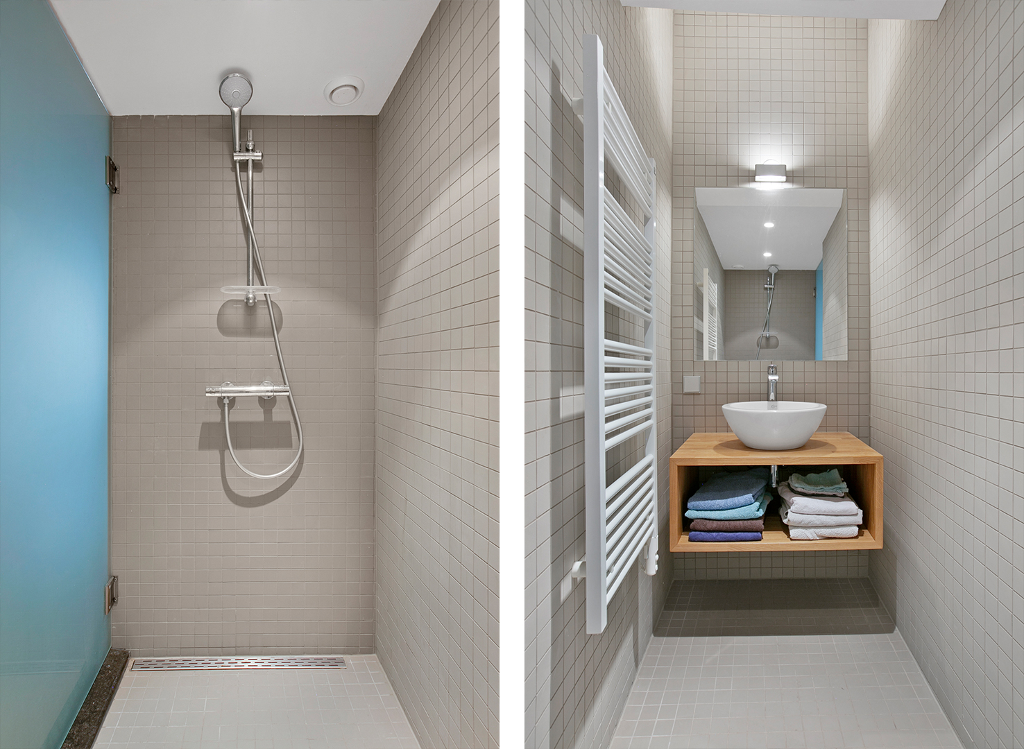 Badkamer met waskom en douche, geheel betegelde wanden.